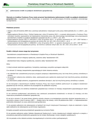 Powiatowy Urząd Pracy w Strzelcach Opolskich http://pup-strzelce.pl/strona/jednorazowe-srodki-na-podjecie-dzialalnosci-gospodarczej/81 Jednorazowe środki na podjęcie działalności gospodarczej Starosta ze środków Funduszu Pracy może przyznać bezrobotnemu jednorazowo środki na podjęcie działalności gospodarczej, z wyjątkiem handlu obwoźnego, w wysokości nie przekraczającej 6-krotnej wysokości przeciętnego wynagrodzenia. Podstawa prawna: ● ● ● ● Ustawa z dnia 20 kwietnia 2004 roku o promocji zatrudnienia i instytucjach rynku pracy (tekst jednolity Dz. U. z 2015 r., poz. 149). Rozporządzenie Ministra Pracy i Polityki Społecznej z dnia 23 kwietnia 2012 r. w sprawie dokonywania z Funduszu Pracy refundacji kosztów wyposażenia lub doposażenia stanowiska pracy dla skierowanego bezrobotnego oraz przyznawania bezrobotnemu środków na podjęcie działalności gospodarczej (Dz. U. z 2012 r., poz. 457). Rozporządzenie Komisji (UE) nr 1407/2013 z dnia 18 grudnia 2013 r. w sprawie stosowania art. 107 i 108 Traktatu o funkcjonowaniu Unii Europejskiej do pomocy de minimis (Dz. Urz. UE L 352 z 24.12.2013 r., str.1) Rozporzadzenie Komisji (UE) nr 1408/2013 z dnia 18 grudnia 2013 r. w sprawie stosowania art. 107 i 108 Traktatu o funkcjonowaniu Unii Europejskiej do pomocy de minimis w sektorze rolnym (DZ. Urz. UE L 352 z 24.12.2013 r. str.9) Środki o których mowa mogą być przyznane: - bezrobotnemu zarejestrowanemu w Powiatowym Urzędzie Pracy w Strzelcach Opolskich, - absolwentowi centrum integracji społecznej, zwanemu dalej "absolwentem CIS", - absolwentowi klubu integracji spoółecznej, zwanemu dalej "absolwentem KIS", który: 1) złożył wniosek właściwie wypełniony i kompletny zawierający wszystkie wymagane załączniki; 2) w okresie 12 miesięcy bezpośrednio poprzedzających dzień złożenia wniosku: ● ● ● nie odmówił bez uzasadnionej przyczyny przyjęcia propozycji odpowiedniej pracy lub innej formy pomocy określonej w ustawie, nie przerwał z własnej winy szkolenia, stażu, wykonywania prac społecznie użytecznych lub innej formy pomocy określonej w ustawie, po skierowaniu podjął szkolenie, przygotowanie zawodowe dorosłych, staż lub inną formę pomocy określoną w ustawie; 3) nie korzystał z bezzwrotnych środków Funduszu Pracy lub innych środków publicznych na podjęcie działalności gospodarczej lub rolniczej, założenie lub przystąpienie do spółdzielni socjalnej; 4) nie posiadał wpisu do ewidencji działalności gospodarczej w okresie 12 miesięcy bezpośrednio poprzedzających dzień złożenia wniosku; 5) nie zamierza podejmować zatrudnienia oraz zawieszać prowadzenia działalności w okresie 12 miesięcy od dnia rozpoczęcia prowadzenia działalności gospodarczej; 6) nie był w okresie 2 lat przed dniem złożenia wniosku skazany za przestępstwa przeciwko obrotowi gospodarczemu, w rozumieniu ustawy z dnia 6 czerwca 1997 r. – Kodeks karny lub ustawy z dnia 28 października 2002 r. o odpowiedzialności podmiotów zbiorowych za czyny zabronione pod groźbą kary; 7) nie posiada zadłużenia lub zobowiązania w bankach lub innych instytucjach finansowych, chyba że należności z tytułu spłat zadłużenia lub zobowiązania są terminowo regulowane; 8) będzie prowadził zamierzoną działalność gospodarczą na terenie Polski; 9) nie posiada zadłużenia wobec Zakładu Ubezpieczeń Społecznych z tytułu nieopłaconych składek należnych w związku z prowadzoną poprzednią działalnością gospodarczą lub Urzędu Skarbowego z tytułu zaległości podatkowych; 10) nie posiada w dniu złożenia wniosku nieuregulowanych w terminie umów cywilnoprawnych, 11) niezłożył wniosku o przyznanie dofinansowania lub przyznanie jednorazowo środków na założenie lub przystąpienie do spółdzielni socjalnej do innego starosty. Środki stanowią pomoc publiczną udzielaną w ramach zasady de minimis. Wobec powyższego nie udziela się pomocy na działalność w zakresie krajowego transportu drogowego towarów oraz krajowego transportu osób taksówkami. Przyznanie środków następuje na podstawie wniosku, który należy dokładnie wypełnić, wyszczególniając planowane zakupy wraz z ceną. Osoba bezrobotna ubiegająca się o przyznanie środków na podjęcie działalności gospodarczej może skorzystać z konsultacji przy wypełnianiu wniosku. Podjęcie działalności musi nastąpić w ciągu 30 dni od daty podpisania umowy. Wydatki winny być dokonane zgodnie z przeznaczeniem, w okresie od dnia zawarcia umowy do 30 dnia od dnia podjęcia działalności gospodarczej. Rozliczenie środków odbywać będzie się w kwocie brutto w oparciu o rachunki i faktury Vat. W rozliczeniu wykazywane są kwoty wydatków z uwzględnieniem podatków od towarów i usług. Rozliczenie zawiera informację, czy bezrobotnemu przysługuje prawo do obniżenia kwoty podatku należnego o kwotę podatku naliczonego zawartego w wykazywanych wydatkach lub prawo do zwrotu podatku naliczonego. Jeżeli beneficjent pomocy skorzysta z prawa do obniżenia kwoty podatku należnego o kwotę podatku naliczonego powinien zwrócić równowartość odzyskanego podatku od towarów i usług zakupionych w ramach przyznanej pomocy na konto Funduszu Pracy PUP. Udokumentowanie wydatkowania otrzymanych środków musi nastąpić w terminie do dwóch miesięcy od dnia podjęcia działalności gospodarczej. Działalność, na którą uzyskano pomoc powinna być prowadzona samodzielnie przez minimum 12 miesięcy i w tym okresie wnioskodawca winien opłacać składki na ubezpieczenie społeczne z tytułu prowadzenia tej działalności i jednocześnie w tym czasie nie może podejmować innego zatrudnienia. W okresie trwania umowy nie wolno zawieszać, likwidować czy zmieniać rodzaju działalności gospodarczej, na którą udzielono środki. Niedotrzymanie warunków spowoduje obowiązek zwrotu uzyskanej pomocy wraz z odsetkami ustawowymi naliczonymi od dnia uzyskania środk