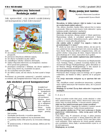 Głos Siódemki nasze bezpieczeństwo 4 (142) / grudzień 2013 ________________________________________________________________________________________________________________________________________________________________________________________________________________________________________________________________________________________________________________________________________________________________________________________________________________________________________________________________ Bezpieczny Internet Redakcja radzi Moją pasją jest taniec Wywiad z Mateuszem Łuczakiem przeprowadził Szymon Białek Jak sprawdzić, czy jesteś uzależniony od komputera i/lub telewizora? Jeśli: nie szukasz towarzystwa kolegów/koleżanek, nie masz przyjaciół, porzucasz dotychczas ulubione zajęcia, nie chcesz wychodzić na plac zabaw, zaniedbujesz szkolne i domowe obowiązki, żądasz włączania telewizora czy komputera i możesz tkwić przed nim godzinami, przestajesz rozmawiać z bliskimi, nie chcesz spędzać z nimi czasu, bawić się, wychodzić na spacer, nie wymyślasz nowych zabaw, nie lubisz czytać, ani nie chcesz, by ktoś czytał ci książki. Powinieneś się poważnie zastanowić i poradzić rodziców, co zmienić, aby komputer/telewizor Tobą nie rządził! Jak siedzieć przed komputerem? PAMIĘTAJ! Biurko do pracy z komputerem musi mieć co najmniej 120 cm szerokości. Monitor powinien znajdować się w odległości 50 cm od oczu. Ekran trzeba umieścić 10-20 stopni poniżej linii wzroku. Niezbędne jest krzesło z wysokim oparciem. Klawiatura musi znajdować się na poziomie łokci. Co godzinę trzeba robić przerwy na ćwiczenia relaksujące. W pomieszczeniu, w którym się pracuje, dobrze jest hodować kwiaty. Słyszałem, że lubisz tańczyć. Jaki to taniec i czy masz na swoim koncie jakieś sukcesy? Tak, dobrze słyszałeś, bardzo lubię tańczyć.Jest to taniec towarzyski. Mam na swoim koncie wiele sukcesów i sporą kolekcję medali, dyplomów i pucharów. Jakie są twoje inne zainteresowania? Interesuję się sportem, dlatego jestem w klasie sportowej. Reprezentuję szkołę w zawodach sportowych i biorę udział w czwartkach lekkoatletycznych, gdzie jestem w czołówce w rzucie piłeczką palantową. Jak radzisz sobie w szkole? Czy zajęcia z tańca nie przeszkadzają Ci w nauce? W szkole na razie idzie mi bardzo dobrze, ale nie jest łatwo, ponieważ nie mogę poświęcić tyle czasu na naukę, ile bym chciał. Muszę być dobrze zorganizowany, żeby pogodzić szkołę i moją pasję do tańca. Zajęcia taneczne nie przeszkadzają mi w nauce, nauczyłem się to godzić. Czy ostatnim czasie miałeś zaplanowany jakiś konkurs tańca? Tak, 9-10 listopad byłem w Warszawie na Międzynarodowym Turnieju Tańca, a tydzień wcześniej byłem na Mistrzostwach Okręgu Wielkopolskiego, gdzie obroniłem tytuł Mistrza Okręgu Wielkopolskiego w obu stylach tanecznych-latynoamerykańskim i standardowym. Ile czasu poświęcasz na trening taneczny? Poświęcam dużo swojego czasu na treningi, od 2-3 godzin codziennie, ale bardzo to lubię i sprawia mi to przyjemność. Czy twoje marzenia związane są ze sportem lub tańcem? Tak, chciałbym zostać zawodowym tancerzem, a później może sędzią tanecznym lub trenerem tańca, ale to jeszcze daleka droga. Dziękuję za wywiad. Życzę dużo sukcesów i wygranych turniejów. C. d. ze s. 4 Przede wszystkim trzeba lubić pisać, trzeba odnaleźć w sobie takie zainteresowanie, pasję. Należy obserwować różne wydarzenia, które się dzieją dookoła, w naszym mieście, państwie. Jakie ma Pan zainteresowania poza swoim zawodem? Lubię sport żużlowy. Angażuję się osobiście w pomoc zawodnikom z pilskiej drużyny. Lubię również podróżować. Nasza gazetka szkolna ma 17 lat i jest wydawana w formie papierowej i elektronicznej… Jaką wersję gazet woli Pan na co dzień? Lubię taką i taką. W zależności od tego, w jakim jesteśmy miejscu, można ją przeczytać w formie papierowej albo elektronicznej. Dziękuję za miły wywiad. Życzę wam dużo ciekawych artykułów, które napiszecie do waszej gazetki szkolnej oraz czytelników, którzy będą z zaciekawieniem czytać to, co do nich napiszecie. Dziękujemy za wywiad. ________________________________________________________________________________________________________________________________________________________________________________________________________________________________________________________________________________________________________________________________________________________________________________________________________________________________________________________________________________________________________________________________________________________________________________ 6
