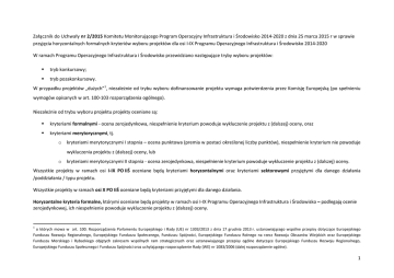 Załącznik do Uchwały nr 2/2015 Komitetu Monitorującego Program Operacyjny Infrastruktura i Środowisko 2014‐2020 z dnia 25 marca 2015 r w sprawie przyjęcia horyzontalnych formalnych kryteriów wyboru projektów dla osi I‐IX Programu Operacyjnego Infrastruktura i Środowisko 2014‐2020 W ramach Programu Operacyjnego Infrastruktura i Środowisko przewidziano następujące tryby wyboru projektów: tryb konkursowy; tryb pozakonkursowy. W przypadku projektów „dużych”1, niezależnie od trybu wyboru dofinansowanie projektu wymaga potwierdzenia przez Komisję Europejską (po spełnieniu wymogów opisanych w art. 100‐103 rozporządzenia ogólnego). Niezależnie od trybu wyboru projektu projekty oceniane są: kryteriami formalnymi ‐ ocena zerojedynkowa, niespełnienie kryterium powoduje wykluczenie projektu z (dalszej) oceny, oraz kryteriami merytorycznymi, tj. o kryteriami merytorycznymi I stopnia – ocena punktowa (premia w postaci określonej liczby punktów), niespełnienie kryterium nie powoduje wykluczenia projektu z (dalszej) oceny, lub o kryteriami merytorycznymi II stopnia ‐ ocena zerojedynkowa, niespełnienie kryterium powoduje wykluczenie projektu z (dalszej) oceny. Wszystkie projekty w ramach osi I‐IX PO IiŚ oceniane będą kryteriami horyzontalnymi oraz kryteriami sektorowymi przyjętymi dla danego działania /poddziałania / typu projektu. Wszystkie projekty w ramach osi X PO IiŚ oceniane będą kryteriami przyjętymi dla danego działania. Horyzontalne kryteria formalne, którymi oceniane będą projekty w ramach osi I‐IX Programu Operacyjnego Infrastruktura i Środowisko – podlegają ocenie zerojedynkowej, ich niespełnienie powoduje wykluczenie projektu z (dalszej) oceny. 1 o których mowa w art. 100. Rozporządzenia Parlamentu Europejskiego i Rady (UE) nr 1303/2013 z dnia 17 grudnia 2013 r. ustanawiającego wspólne przepisy dotyczące Europejskiego Funduszu Rozwoju Regionalnego, Europejskiego Funduszu Społecznego, Funduszu Spójności, Europejskiego Funduszu Rolnego na rzecz Rozwoju Obszarów Wiejskich oraz Europejskiego Funduszu Morskiego i Rybackiego objętych zakresem wspólnych ram strategicznych oraz ustanawiającego przepisy ogólne dotyczące Europejskiego Funduszu Rozwoju Regionalnego, Europejskiego Funduszu Społecznego i Funduszu Spójności oraz uchylającego rozporządzenie Rady (WE) nr 1083/2006 (dalej rozporządzenie ogólne). 1 TAK/NIE/ NIE DOTYCZY L.P. NAZWA KRYTERIUM OPIS KRYTERIUM 1. Wniosek złożony w terminie2. Termin składania wniosków, w przypadku projektów konkursowych podany jest w ogłoszeniu o konkursie. Datę złożenia wniosku dla projektów wybieranych w trybie pozakonkursowym określa IP/IW indywidualnie dla każdego projektu w wezwaniu do złożenia wniosku o dofinansowanie (o którym mowa w art. 48 ust 1 ustawy wdrożeniowej).. 2. Wniosek sporządzono na obowiązującym formularzu. Formularz wniosku dostępny jest na stronach internetowych instytucji organizujących nabór wniosków, do których odwołanie zawiera się w ogłoszeniu o naborze projektów lub w wezwaniu do złożenia wniosku o dofinansowanie. Formularz dotyczący projektów pomocy technicznej dystrybuowany będzie indywidualnie do potencjalnych beneficjentów (wnioskodawców). 3. Wniosek wypełniony jest w języku polskim. Informacje w treści wniosku spełniają wymogi ustawy z dnia 7 października 1999 r. o języku polskim. Tytuł i opis projektu w jasny i nie budzący wątpliwości sposób powinien obrazować faktyczne zadanie lub realizację pewnego etapu większego przedsięwzięcia, które zostanie w określonych ramach zrealizowane. 4. Zgodność z realizacją zasady n+3. W ramach kryterium ocenie podlega, czy harmonogram realizacji projektu nie narusza zasady n+3 w zakresie kwalifikowalności wydatków. 5. Kompletność dokumentacji aplikacyjnej: wniosku i załączników. Rodzaj załączników do wniosku o dofinansowanie i zakres informacji wymaganych w dokumentacji aplikacyjnej dla projektów wybieranych: - w trybie konkursowym zawarty jest w ogłoszeniu o konkursie. - w trybie pozakonkursowym określa instytucja przyjmująca wniosek. Kryterium nie ma zastosowania do braków formalnych lub oczywistych omyłek, o których mowa w art. 43 ustawy wdrożeniowej, zgodnie z którym właściwa 2 Zgodnie z art. 57 § 5. Ustawy z dnia 14 czerwca 1960 r. kodeks postępowania administracyjnego (Dz.U.2013.267 j.t.) 2 instytucja wzywa wnioskodawcę do uzupełnienia wniosku lub poprawienia w nim oczywistej omyłki w wyznaczonym terminie nie krótszym niż 7 dni, pod rygorem pozostawienia wniosku bez rozpatrzenia Załączniki do wniosku są ważne i zgodne z odpowiednimi polskimi oraz unijnymi przepisami, szczególnie jeśli chodzi o przepisy o ochronie środowiska, przepisy ustawy z dnia 27 marca 2003 r. o planowaniu i zagospodarowaniu przestrzennym, ustawy z 7 lipca 1994 r. Prawo budowlane. 6. 7. Zgodność z Programem Operacyjnym Infrastruktura i Warunkiem spełnienia kryterium jest zapewnienie zgodności projektu co najmniej Środowisko, „Szczegółowym opisem osi priorytetowych w zakresie: PO IiŚ” oraz regulaminem konkursu (w przypadku - Typ/rodzaj projektu jest zgodny z przewidzianym w szczegółowym opisie osi projektów wybieranych w trybie konkursowym). priorytetowych PO IiŚ, - Zgodność projektu z opisem działania / poddziałania (w tym celem oraz zakresem interwencji) - Wnioskodawca jest zgodny z określonym typem beneficjenta lub katalogiem ostatecznych odbiorców instrumentów finansowych, - Nie przekroczono pułapu maksymalnego poziomu dofinansowania, - Spełniono warunki minimalnej/maksymalnej wartości projektu (o ile dotyczy), - Spełniono warunki minimalnej/maksymalnej wartości wydatków kwalifikowanych projektu (o ile dotyczy), - Wnioskodawcy składający wniosek są uprawnieni do ubiegania się o przyznanie dofinansowania w zakresie określonym we wniosku, - Zgodność projektu z planem gospodarki niskoemisyjnej lub dokumente