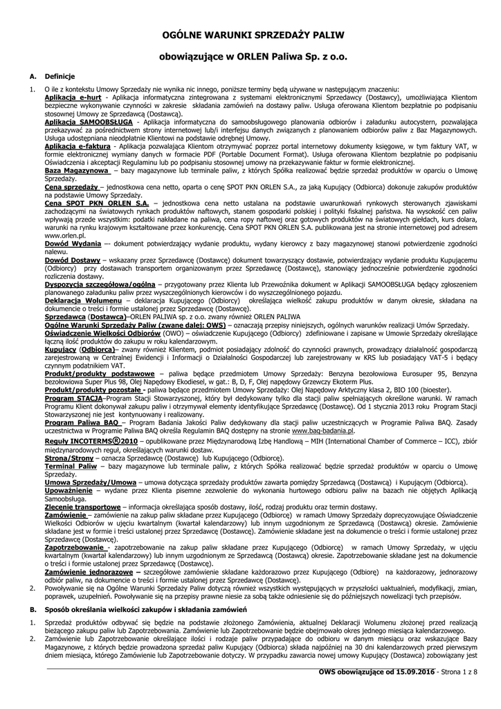OGÓLNE WARUNKI SPRZEDAŻY PALIW obowiązujące w ORLEN Paliwa Sp. z o.o. A. Definicje 1. O ile z kontekstu Umowy Sprzedaży nie wynika nic innego, poniższe terminy będą używane w następującym znaczeniu: Aplikacja e-hurt - Aplikacja informatyczna zintegrowana z systemami elektronicznymi Sprzedawcy (Dostawcy), umożliwiająca Klientom bezpieczne wykonywanie czynności w zakresie składania zamówień na dostawy paliw. Usługa oferowana Klientom bezpłatnie po podpisaniu stosownej Umowy ze Sprzedawcą (Dostawcą). Aplikacja SAMOOBSŁUGA - Aplikacja informatyczna do samoobsługowego planowania odbiorów i załadunku autocystern, pozwalająca przekazywać za pośrednictwem strony internetowej lub/i interfejsu danych związanych z planowaniem odbiorów paliw z Baz Magazynowych. Usługa udostępniana nieodpłatnie Klientowi na podstawie odrębnej Umowy. Aplikacja e-faktura - Aplikacja pozwalająca Klientom otrzymywać poprzez portal internetowy dokumenty księgowe, w tym faktury VAT, w formie elektronicznej wymiany danych w formacie PDF (Portable Document Format). Usługa oferowana Klientom bezpłatnie po podpisaniu Oświadczenia i akceptacji Regulaminu lub po podpisaniu stosownej umowy na przekazywanie faktur w formie elektronicznej. Baza Magazynowa – bazy magazynowe lub terminale paliw, z których Spółka realizować będzie sprzedaż produktów w oparciu o Umowę Sprzedaży. Cena sprzedaży – jednostkowa cena netto, oparta o cenę SPOT PKN ORLEN S.A., za jaką Kupujący (Odbiorca) dokonuje zakupów produktów na podstawie Umowy Sprzedaży. Cena SPOT PKN ORLEN S.A. – jednostkowa cena netto ustalana na podstawie uwarunkowań rynkowych sterowanych zjawiskami zachodzącymi na światowych rynkach produktów naftowych, stanem gospodarki polskiej i polityki fiskalnej państwa. Na wysokość cen paliw wpływają przede wszystkim: podatki nakładane na paliwa, cena ropy naftowej oraz gotowych produktów na światowych giełdach, kurs dolara, warunki na rynku krajowym kształtowane przez konkurencję. Cena SPOT PKN ORLEN S.A. publikowana jest na stronie internetowej pod adresem www.orlen.pl. Dowód Wydania –- dokument potwierdzający wydanie produktu, wydany kierowcy z bazy magazynowej stanowi potwierdzenie zgodności nalewu. Dowód Dostawy – wskazany przez Sprzedawcę (Dostawcę) dokument towarzyszący dostawie, potwierdzający wydanie produktu Kupującemu (Odbiorcy) przy dostawach transportem organizowanym przez Sprzedawcę (Dostawcę), stanowiący jednocześnie potwierdzenie zgodności rozliczenia dostawy. Dyspozycja szczegółowa/ogólna – przygotowany przez Klienta lub Przewoźnika dokument w Aplikacji SAMOOBSŁUGA będący zgłoszeniem planowanego załadunku paliw przez wyszczególnionych kierowców i do wyszczególnionego pojazdu. Deklaracja Wolumenu – deklaracja Kupującego (Odbiorcy) określająca wielkość zakupu produktów w danym okresie, składana na dokumencie o treści i formie ustalonej przez Sprzedawcę (Dostawcę). Sprzedawca (Dostawca)–ORLEN PALIWA sp. z o.o. zwany również ORLEN PALIWA Ogólne Warunki Sprzedaży Paliw (zwane dalej: OWS) – oznaczają przepisy niniejszych, ogólnych warunków realizacji Umów Sprzedaży. Oświadczenie Wielkości Odbiorów (OWO) – oświadczenie Kupującego (Odbiorcy) zdefiniowane i zapisane w Umowie Sprzedaży określające łączną ilość produktów do zakupu w roku kalendarzowym. Kupujący (Odbiorca)– zwany również Klientem, podmiot posiadający zdolność do czynności prawnych, prowadzący działalność gospodarczą zarejestrowaną w Centralnej Ewidencji i Informacji o Działalności Gospodarczej lub zarejestrowany w KRS lub posiadający VAT-5 i będący czynnym podatnikiem VAT. Produkt/produkty podstawowe – paliwa będące przedmiotem Umowy Sprzedaży: Benzyna bezołowiowa Eurosuper 95, Benzyna bezołowiowa Super Plus 98, Olej Napędowy Ekodiesel, w gat.: B, D, F, Olej napędowy Grzewczy Ekoterm Plus. Produkt/produkty pozostałe - paliwa będące przedmiotem Umowy Sprzedaży: Olej Napędowy Arktyczny klasa 2, BIO 100 (bioester). Program STACJA–Program Stacji Stowarzyszonej, który był dedykowany tylko dla stacji paliw spełniających określone warunki. W ramach Programu Klient dokonywał zakupu paliw i otrzymywał elementy identyfikujące Sprzedawcę (Dostawcę). Od 1 stycznia 2013 roku Program Stacji Stowarzyszonej nie jest kontynuowany i realizowany. Program Paliwa BAQ – Program Badania Jakości Paliw dedykowany dla stacji paliw uczestniczących w Programie Paliwa BAQ. Zasady uczestnictwa w Programie Paliwa BAQ określa Regulamin BAQ dostępny na stronie www.baq-badania.pl. 2. Reguły INCOTERMS®2010 – opublikowane przez Międzynarodową Izbę Handlową – MIH (International Chamber of Commerce – ICC), zbiór międzynarodowych reguł, określających warunki dostaw. Strona/Strony – oznacza Sprzedawcę (Dostawcę) lub Kupującego (Odbiorcę). Terminal Paliw – bazy magazynowe lub terminale paliw, z których Spółka realizować będzie sprzedaż produktów w oparciu o Umowę Sprzedaży. Umowa Sprzedaży/Umowa – umowa dotycząca sprzedaży produktów zawarta pomiędzy Sprzedawcą (Dostawcą) i Kupującym (Odbiorcą). Upoważnienie – wydane przez Klienta pisemne zezwolenie do wykonania hurtowego odbioru paliw na bazach nie objętych Aplikacją Samoobsługa. Zlecenie transportowe – informacja określająca sposób dostawy, ilość, rodzaj produktu oraz termin dostawy. Zamówienie – zamówienie na zakup paliw składane przez Kupującego (Odbiorcę) w ramach Umowy Sprzedaży doprecyzowujące Oświadczenie Wielkości Odbiorów w ujęciu kwartalnym (kwartał kalendarzowy) lub innym uzgodnionym ze Sprzedawcą (Dostawcą) okresie. Zamówienie składane jest w formie i treści ustalonej przez Sprzedawcę (Dostawcę). Zamówienie składane jest na dokumencie o treści i formie ustalonej przez Sprzedawcę (Dostawcę). Zapotrzebowanie - zapotrzebowanie na zakup paliw składane przez Kupującego (Od