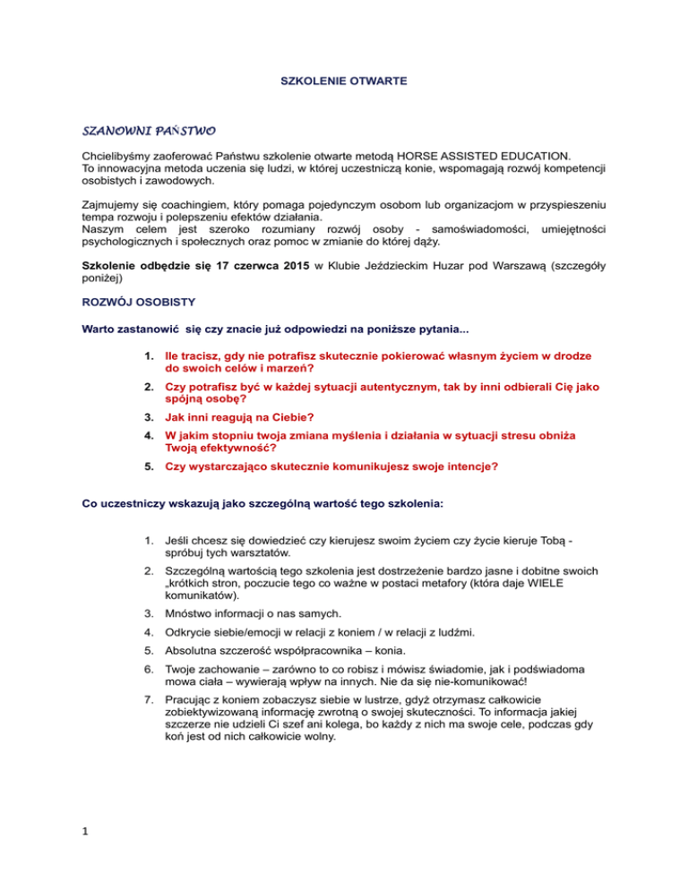SZKOLENIE OTWARTE SZANOWNI PAŃSTWO Chcielibyśmy zaoferować Państwu szkolenie otwarte metodą HORSE ASSISTED EDUCATION. To innowacyjna metoda uczenia się ludzi, w której uczestniczą konie, wspomagają rozwój kompetencji osobistych i zawodowych. Zajmujemy się coachingiem, który pomaga pojedynczym osobom lub organizacjom w przyspieszeniu tempa rozwoju i polepszeniu efektów działania. Naszym celem jest szeroko rozumiany rozwój osoby - samoświadomości, umiejętności psychologicznych i społecznych oraz pomoc w zmianie do której dąży. Szkolenie odbędzie się 17 czerwca 2015 w Klubie Jeździeckim Huzar pod Warszawą (szczegóły poniżej) ROZWÓJ OSOBISTY Warto zastanowić się czy znacie już odpowiedzi na poniższe pytania... 1. Ile tracisz, gdy nie potrafisz skutecznie pokierować własnym życiem w drodze do swoich celów i marzeń? 2. Czy potrafisz być w każdej sytuacji autentycznym, tak by inni odbierali Cię jako spójną osobę? 3. Jak inni reagują na Ciebie? 4. W jakim stopniu twoja zmiana myślenia i działania w sytuacji stresu obniża Twoją efektywność? 5. Czy wystarczająco skutecznie komunikujesz swoje intencje? Co uczestniczy wskazują jako szczególną wartość tego szkolenia: 1. Jeśli chcesz się dowiedzieć czy kierujesz swoim życiem czy życie kieruje Tobą spróbuj tych warsztatów. 2. Szczególną wartością tego szkolenia jest dostrzeżenie bardzo jasne i dobitne swoich „krótkich stron, poczucie tego co ważne w postaci metafory (która daje WIELE komunikatów). 3. Mnóstwo informacji o nas samych. 4. Odkrycie siebie/emocji w relacji z koniem / w relacji z ludźmi. 5. Absolutna szczerość współpracownika – konia. 6. Twoje zachowanie – zarówno to co robisz i mówisz świadomie, jak i podświadoma mowa ciała – wywierają wpływ na innych. Nie da się nie-komunikować! 7. Pracując z koniem zobaczysz siebie w lustrze, gdyż otrzymasz całkowicie zobiektywizowaną informację zwrotną o swojej skuteczności. To informacja jakiej szczerze nie udzieli Ci szef ani kolega, bo każdy z nich ma swoje cele, podczas gdy koń jest od nich całkowicie wolny. 1 Co zyskasz: 1. Doświadczenie i poznanie własnych wzorców zachowań, które ujawniają się w sytuacjach nowych i w stresie. 2. Otrzymanie informacji zwrotnej na temat spójności swoich zachowań z wewnętrznym systemem przekonań i wartości. 3. Sprawdzenie swojej skuteczności w komunikowaniu, doświadczanie znaczenia klarownej wizji, celu i intencji w życiu. 4. Możliwość eksperymentowania i wypracowania nowych wzorców i przekonań na temat swojej wartości, skuteczności i dalszych kierunków rozwoju. 5. Diagnoza własnych kompetencji przywódczych i komunikacyjnych w pracy zawodowej i relacjach społecznych 6. Rozpoznawanie i kształtowanie własnego stylu osiągania celów 7. Wyłonienie własnych strategii działania w sytuacjach zawodowych: pracy menedżerskiej, obsługi Klienta, sprzedaży, negocjacji, nauczania, przywództwa, 8. 9. 10. 11. 12. 13. 14. 15. 16. 17. 18. przekonywania i zjednywania sobie ludzi itp. Poszerzanie świadomości własnego stylu komunikacji Rozwój umiejętności wykraczania poza sferę komfortu Doświadczenie komunikacji „bez maski” Przekraczanie własnych barier Uelastycznianie sposobów funkcjonowania Rozwijanie umiejętności budowania więzi w zespole Zrozumienie, czego potrzebują ludzie żeby za nami podążyć Rozwijanie autentycznego przywództwa Podniesienie efektywności działania Rozwijanie relacji ze współpracownikami Zwiększenie samoświadomości Na szkoleniach HAE nie oceniamy, nie nauczamy. W zadaniach z końmi nie chodzi o odpowiednie wykonanie ćwiczenia, ale o to wszystko co wydarza się wewnątrz i na zewnątrz: w relacji z koniem, w Tobie, w grupie. Tutaj Ty sam wybierasz swój własny styl działania, uczysz się w swoim własnym tempie; sam decydujesz jak daleko wychodzisz poza swoją strefę komfortu. METODA PRACY Zajęcia odbywają się w małych, kameralnych grupach: . 8-12 osób. Proponowane przez nas warsztaty obejmują szereg ćwiczeń indywidualnych i grupowych, polegających na obserwacji grupy koni, współpracy z koniem podczas różnych ćwiczeń (w zależności od tematu i celów warsztatu), po których następuje: • Analiza materiału wideo, • Udzielanie informacji zwrotnej, • Moderowane dyskusje grupowe, • Transfer sytuacji szkoleniowej na życie zawodowe. Po krótkiej analizie tworzymy plan działania i określamy, które zachowania blokują skuteczność interpersonalną i gdzie warto zastanowić nad inną opcją działania, a które działania są pożądane i trzeba je wzmacniać oraz gdzie jest obszar do poszerzania możliwości. Uczestnicy sami decydują o wzięciu udziału w każdym ćwiczeniu, jeżeli z jakiegokolwiek powodu nie chcą tego zrobić – pozostają w roli obserwatora, choć z naszych doświadczeń wynika, że zazwyczaj wszyscy decydują się na aktywne uczestnictwo. Projektujemy ćwiczenia proste i możliwe do 2 wykonania dla osoby, która pierwszy raz w życiu ma kontakt z koniem. Istotą warsztatów nie jest wykonanie zadania z koniem. W tej metodzie dążymy do spojrzenia na własne zachowania z różnych perspektyw, do refleksji z obserwacji innych, a tym samym – do wyjścia poza własną strefę komfortu, do generowania zmiany. PROGRAM RAMOWY - HARMONOGRAM SZKOLENIA: 9.00 – 9.30 - Rozpoczęcie warsztatu, uzgodnienie celów 9.30 – 10.30 - Ćwiczenie 1 (wprowadzające) + omówienie 10.30 - 10.45 - Przerwa 10.45 – 12.45 - Ćwiczenie 2 + omówienie 13.00- 13.45 - Przerwa obiadowa 13.45 – 15.45 - Ćwiczenie 3 + omówienie 15.45 - 16.00 - Przerwa 16.00 - 17.30 - Ćwiczenie 4 + omówienie 17.30 -18.00 - Zakończenie, podsumowanie 18.00 – 18.45 Zakończenie warsztatów, podsumowanie, wnioski końcowe, plan zmiany 3 PROWADZENIE Ksenia Samsel Ambasador Rozwoju, Certyfikowany Trener OPEN by HORSES na koncepcie Horse Assisted Education, 15 letnie doświadczenie jako ma