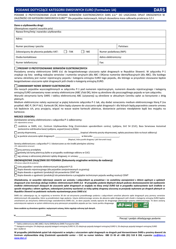 PODANIE DOTYCZĄCE KATEGORII EMISYJNYCH EURO (Formularz 1A) PODANIE O PRZYSTOSOWANIE I/LUB WYDANIE SERWISÓW ELEKTRONICZNYCH DARS d.d.* DO UISZCZANIA OPŁAT DROGOWYCH W ZALEŻNOŚCI OD KATEGORII EMISYJNYCH EURO** Dla pojazdów motorowych, których dozwolona masa całkowita przekracza 3,5 t Dane o użytkowniku drogi: (Obowiązkowo wypełnić wszystkie pola) Nazwa firmy/Imię i nazwisko użytkownika: Adres: Numer pocztowy i poczta: Zobowiązany do płacenia podatku VAT: Państwo: - TAK - NIE Numer podatkowy (NIP): Osoba kontaktowa: Adres elektroniczny: Numer telefoniczny: Fax: PROSIMY O PRZYSTOSOWANIE SERWISÓW ELEKTRONICZNYCH Posiadamy serwisy elektroniczne DARS d.d. do bezgotówkowego uiszczania opłat drogowych w Republice Słowenii. W załączniku P-1 znajduje się lista według rodzajów serwisów i numerów seryjnych (dla ABC i DK)oraz numerów identyfikacyjnych (dla ABC). Dla każdego serwisu określony jest numer rejestracyjny pojazdu i kategoria emisyjna EURO tego pojazdu, dla którego w przyszłości stosowane będzie bezgotówkowe uiszczanie opłat drogowych jeśli chodzi o kategorię emisyjną EURO. ZAMAWIAMY NOWE SERWISY ELEKTRONICZNE Dla naszych pojazdów wyszczególnionych w załączniku P-1 pod numerem rejestracyjnym, numerem dowodu rejestracyjnego i kategorią emisyjną EURO zamawiamy nowe serwisy elektroniczne (ABC i/lub DK), które są określone dla poszczególnego pojazdu w tym załączniku. Warunki otrzymania karty DARS i tablicy elektronicznej ABC (używanej) są określone w aktualnym Cenniku opłat za korzystanie z dróg płatnych. Medium elektroniczne należy wyznaczyć w piątej kolumnie załącznika P-1 tak, aby dodać oznaczeniu medium elektronicznego literę P (na przykład: ABC-P, DK-P itd.). Karteczki DK, które będą używane do uiszczania opłat drogowych i dla których będą poprzednio zawarte umowy lub będziecie ich, przy przyjęciu, wiązać na wasze ważne karteczki płatnicze, dostaniecie państwo nieodpłatnie bądź bez majątku na karteczce. MIEJSCE ODBIORU Zamówione serwisy elektroniczne z załącznika P-1 odbierzemy: ( - odpowiednie oznacz) osobiście w DARS, d.d., Centrum Użytkowników Dróg (Cestninskem uporabniškem centru), Ljubljana, Grič 54 (CUC), Baza Serwisowa Autostrad (avtocestna vzdrževalna baza) Ljubljana, wyjazd (izvoz) Lj-Brdo) pocztą ekspresową _____________________________________ (napisać oferenta poczty ekspresowej; opłata pocztowa idzie na koszt odbiorcy) w punkcie uiszczania opłat drogowych _____________________ w kierunku ______________________. (Napisać, który punkt drogowy i jaki kierunek trasy) Serwisy elektroniczne z załącznika P-1 i dostarczone za nie środki pieniężne uiścimy: ( - odpowiednie oznaczyć) przy pomocy przedpłaty gotówką lub kartą płatniczą (tylko w przypadku osobistego odbioru w CUC) wg umowy o odroczonej płatności opłaty drogowej; nr umowy: ____________________ OBOWIĄZKOWE ZAŁĄCZNIKI DO PODANIA (Dokumenty oryginalne wrócimy do nadawcy) ( -oznacz załączniki do podania) Lista pojazdów i serwisów elektronicznych (załącznik P-2) Kopia dowodu rejestracyjnego (dla pojazdów zarejestrowanych za granicą) Kopia dowodu o zgodności (produkcji) lub pozwolenia CEMT lub Kopia dowodu o zgodności (produkcji) lub potwierdzenia o przeglądzie technicznym pojazdu według rezolucji CEMT Oświadczamy, że wszystkie informacje zawarte we wniosku i załącznikach są prawdziwe i że zostaliśmy zaznajomieni z Aktem ogólnym o opłatach drogowych oraz instrukcją obsługi środków elektronicznych DARS d.d. W przypadku podania błędnych danych podczas dostosowywania lub wydawania środków elektronicznych służących do uiszczania opłat drogowych ze względu na klasę emisji EURO lub w przypadku wykorzystania tych środków w sposób niezgodny z aktem ogólnym, zobowiązani jesteśmy wyrównać za niską opłatę drogową uiszczoną za przejazdy wykonane po drogach płatnych w Republice Słowenii na podstawie rachunku wystawionego przez DARS d.d. DARS d.d. zobowiązuje się, że najpóźniej w terminie 30 dni od otrzymania prawidłowego podania z załącznikami umożliwi płacenie opłat drogowych przy pomocy serwisów elektronicznych dla pojazdów, które są przedmiotem tego podania. Użycie elektronicznego serwisu do płacenia opłat drogowych jeśli chodzi o kategorię emisyjną EURO będzie umożliwione po otrzymaniu elektronicznego zawiadomienia DARS d.d., że dane pojazdu zostały wpisane do drogowego płatniczego systemu elektronicznego. Te dane zostaną automatycznie wpisane w system elektroniczny przy pierwszym przejeździe pojazdu po tzw. trasie punktu drogowego . Dane osobiste są chronione zgodnie z wytycznymi ustawy, która reguluje ochronę tych danych. w_______________________dnia____________ _____________________________________ Pieczęć i podpis składającego podanie: * Tablica elektroniczna ABC (ABC) i Karta DARS/Karta DARS Transporter (DK) ** Kategorie emisyjne: E4 obejmuje pojazdy kategorii emisyjnej EURO IV; E5 obejmuje pojazdy kategorii emisyjnej EURO V, E6 obejmuje pojazdy kategorii emisyjnej EURO EEV i EURO VI W przypadku jakichkolwiek pytań lub niejasności w związku z uiszczaniem opłat drogowych na drogach pod kierownictwem DARS-u prosimy dzwonić do Centrum użytkowników dróg (Cestninski uporabniški center – CUC na numer telefonu 080 15 03 ali +386 (01) 518 8 350, e-poczta: [email protected], www.dars.si P-1: załącznik podania o przystosowanie i/lub wydanie serwisów elektronicznych DARS d.d. Lista pojazdów, których dozwolona masa całkowita przekracza 3,5 t, za które chcielibyśmy zapłacić opłatę drogową jeśli chodzi o kategorię emisyjną Dotyczy serwisów, które macie już do dyspozycji (1) Numer rejestracyjny pojazdu (2) Numer dowodu rejestracyjnego (3) Kategoria drogowa pojazdu (R3 lub R4) (4)*** Rodzaj pojazdu EURO (EURO IV, EURO V, EURO EEV, EURO VI) (5)* Typ el. serwisu dla pojazdu (ABC i/lub DK) (6) Numer seryjny serwisu elektr