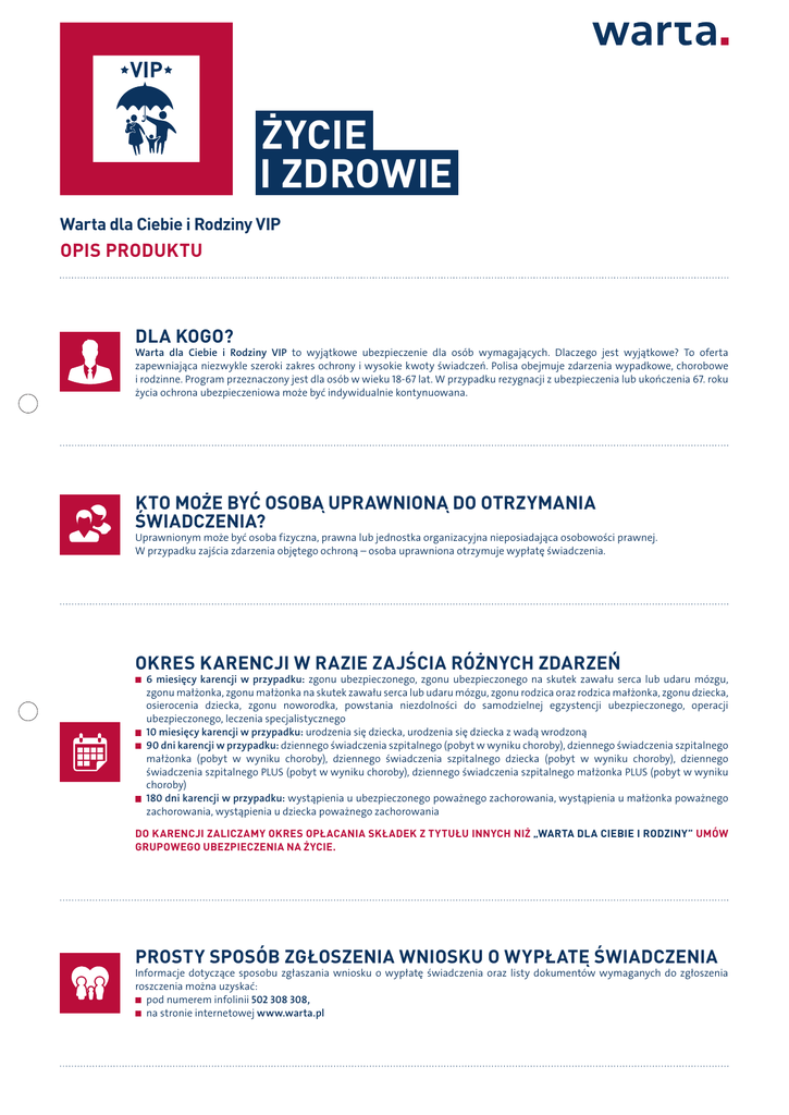 ŻYCIE I ZDROWIE Warta dla Ciebie i Rodziny VIP OPIS PRODUKTU DLA KOGO? Warta dla Ciebie i Rodziny VIP to wyjątkowe ubezpieczenie dla osób wymagających. Dlaczego jest wyjątkowe? To oferta zapewniająca niezwykle szeroki zakres ochrony i wysokie kwoty świadczeń. Polisa obejmuje zdarzenia wypadkowe, chorobowe i rodzinne. Program przeznaczony jest dla osób w wieku 18-67 lat. W przypadku rezygnacji z ubezpieczenia lub ukończenia 67. roku życia ochrona ubezpieczeniowa może być indywidualnie kontynuowana. KTO MOŻE BYĆ OSOBĄ UPRAWNIONĄ DO OTRZYMANIA ŚWIADCZENIA? Uprawnionym może być osoba fizyczna, prawna lub jednostka organizacyjna nieposiadająca osobowości prawnej. W przypadku zajścia zdarzenia objętego ochroną – osoba uprawniona otrzymuje wypłatę świadczenia. OKRES KARENCJI W RAZIE ZAJŚCIA RÓŻNYCH ZDARZEŃ 6 miesięcy karencji w przypadku: zgonu ubezpieczonego, zgonu ubezpieczonego na skutek zawału serca lub udaru mózgu, zgonu małżonka, zgonu małżonka na skutek zawału serca lub udaru mózgu, zgonu rodzica oraz rodzica małżonka, zgonu dziecka, osierocenia dziecka, zgonu noworodka, powstania niezdolności do samodzielnej egzystencji ubezpieczonego, operacji ubezpieczonego, leczenia specjalistycznego 1 0 miesięcy karencji w przypadku: urodzenia się dziecka, urodzenia się dziecka z wadą wrodzoną 9 0 dni karencji w przypadku: dziennego świadczenia szpitalnego (pobyt w wyniku choroby), dziennego świadczenia szpitalnego małżonka (pobyt w wyniku choroby), dziennego świadczenia szpitalnego dziecka (pobyt w wyniku choroby), dziennego świadczenia szpitalnego PLUS (pobyt w wyniku choroby), dziennego świadczenia szpitalnego małżonka PLUS (pobyt w wyniku choroby) 1 80 dni karencji w przypadku: wystąpienia u ubezpieczonego poważnego zachorowania, wystąpienia u małżonka poważnego zachorowania, wystąpienia u dziecka poważnego zachorowania DO KARENCJI ZALICZAMY OKRES OPŁACANIA SKŁADEK Z TYTUŁU INNYCH NIŻ „WARTA DLA CIEBIE I RODZINY” UMÓW GRUPOWEGO UBEZPIECZENIA NA ŻYCIE. PROSTY SPOSÓB ZGŁOSZENIA WNIOSKU O WYPŁATĘ ŚWIADCZENIA Informacje dotyczące sposobu zgłaszania wniosku o wypłatę świadczenia oraz listy dokumentów wymaganych do zgłoszenia roszczenia można uzyskać: p od numerem infolinii 502 308 308, n a stronie internetowej www.warta.pl Warta dla Ciebie i Rodziny VIP OPIS PRODUKTU SKŁADKA MIESIĘCZNA 195 zł 215 zł 350 zł Twoje Życie VIP Twoje Życie VIP Życie i Zdrowie Rodziny VIP ZAKRES KWOTA ŚWIADCZENIA W PRZYPADKU ZAJŚCIA DANEGO ZDARZENIA UBEZPIECZENIOWEGO zgon w wyniku wypadku komunikacyjnego przy pracy 320 000 zł 320 000 zł 480 000 zł zgon w wyniku wypadku komunikacyjnego 260 000 zł 260 000 zł 390 000 zł zgon w wyniku wypadku przy pracy 260 000 zł 260 000 zł 390 000 zł zgon w wyniku wypadku 200 000 zł 200 000 zł 300 000 zł 270 000 zł zgon w wyniku zawału serca, udaru mózgu 180 000 zł 180 000 zł zgon 100 000 zł 100 000 zł 150 000 zł inwalidztwo w wyniku wypadku 80 000 zł 80 000 zł 120 000 zł niezdolność do samodzielnej egzystencji 80 000 zł 80 000 zł 120 000 zł poważne zachorowanie 20 000 zł 20 000 zł 30 000 zł operacje 4 000 zł 4 000 zł 8 000 zł leczenie specjalistyczne 4 000 zł 4 000 zł 8 000 zł 800 zł 800 zł 1 200 zł 125 zł 125 zł 175 zł uszczerbek w wyniku wypadku – za 1% uszczerbku dzienne świadczenie szpitalne z tytułu choroby dzienne świadczenie szpitalne z tytułu wypadku dzienne świadczenie szpitalne OIOM, jednorazowe z tytułu choroby, wypadku dzienne świadczenie szpitalne PLUS: zawał, udar mózgu 200 zł 200 zł 300 zł 800 zł 800 zł 1 000 zł 225 zł 225 zł 325 zł dzienne świadczenie szpitalne PLUS: wypadek komunikacyjny 275 zł 275 zł 425 zł dzienne świadczenie szpitalne PLUS: wypadek przy pracy 275 zł 275 zł 425 zł dzienne świadczenie szpitalne PLUS: wypadek komunikacyjny przy pracy 350 zł 350 zł 550 zł dzienne świadczenie szpitalne PLUS: rehabilitacja urodzenie się dziecka 60 zł 60 zł 100 zł 1 500 zł 2 000 zł urodzenie się dziecka z wadą wrodzoną 3 000 zł 4 000 zł osierocenie dziecka 8 000 zł 12 000 zł zgon małżonka 10 000 zł 20 000 zł zgon dziecka 6 000 zł 9 000 zł zgon noworodka 5 000 zł 7 500 zł zgon rodzica 3 000 zł 4 000 zł zgon rodzica małżonka 3 000 zł 4 000 zł zgon małżonka w wyniku wypadku 40 000 zł zgon małżonka w wyniku wypadku komunikacyjnego 60 000 zł zgon małżonka w wyniku zawału, udaru mózgu 40 000 zł zgon dziecka w wyniku wypadku 18 000 zł zgon rodzica w wyniku wypadku 8 000 zł zgon rodzica małżonka w wyniku wypadku 8 000 zł inwalidztwo małżonka w wyniku wypadku 40 000 zł poważne zachorowanie małżonka 15 000 zł poważne zachorowanie dziecka dzienne świadczenie szpitalne małżonka OIOM, jednorazowe z tytułu choroby, wypadku dzienne świadczenie szpitalne małżonka z tytułu wypadku 15 000 zł dzienne świadczenie szpitalne małżonka z tytułu choroby 1 000 zł 150 zł 75 zł dzienne świadczenie szpitalne PLUS małżonka: zawał, udar mózgu 175 zł dzienne świadczenie szpitalne PLUS małżonka: wypadek komunikacyjny 250 zł dzienne świadczenie szpitalne PLUS małżonka: wypadek przy pracy dzienne świadczenie szpitalne PLUS małżonka: wypadek komunikacyjny przy pracy dzienne świadczenie szpitalne PLUS małżonka: rehabilitacja 250 zł dzienne świadczenie szpitalne dziecka z tytułu wypadku 150 zł dzienne świadczenie szpitalne dziecka z tytułu choroby 75 zł 350 zł 75 zł assistance medyczny Niniejsza ulotka ma charakter informacyjny i nie stanowi oferty w rozumieniu art. 66 kodeksu cywilnego. Warta dla Ciebie i Rodziny to produkt w formie grupowego ubezpieczenia na życie, dostępny w placówkach TUiR „WARTA” S.A. (występującego w roli Ubezpieczającego), przygotowany przez TUnŻ „WARTA” S.A. (występującego w roli ubezpieczyciela). Szczegółowe informacje dotyczące zakresu ubezpieczenia, wyłączenia i ograniczenia odpowiedzialności ubez