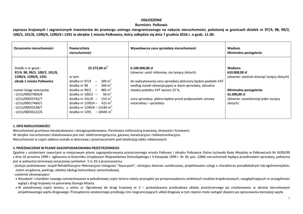 OGŁOSZENIE Burmistrz Polkowic zaprasza krajowych i zagranicznych inwestorów do przetargu ustnego nieograniczonego na nabycie nieruchomości, położonej w granicach działek nr 97/4, 98, 99/2, 100/2, 101/8, 1290/4, 1290/6 i 1291 w obrębie 1 miasta Polkowice, który odbędzie się dnia 7 grudnia 2016 r. o godz. 11.00. Oznaczenie nieruchomości Działki o nr geod.: 97/4, 98, 99/2, 100/2, 101/8, 1290/4, 1290/6, 1291 obręb 1 miasta Polkowice numer księgi wieczystej: - LE1U/00027869/8 - LE1U/00033742/7 - LE1U/00017469/1 - LE1U/00031528/7 - LE1U/00036122/6 Powierzchnia nieruchomości 2 25.272,00 m w tym: 2 działka nr 97/4 – 189 m 2 działka nr 98 – 344 m 2 działka nr 99/2 – 485 m 2 działka nr 100/2 – 58 m działka nr 101/8 – 153 m2 działka nr 1290/4 – 415 m2 działka nr 1290/6 – 13183 m2 działka nr 1291 – 10445 m2 Wywoławcza cena sprzedaży nieruchomości Wadium Minimalne postąpienie 6.100.000,00 zł (słownie: sześć milionów, sto tysięcy złotych) Wadium: 610.000,00 zł (słownie: sześćset dziesięć tysięcy złotych) do wylicytowanej ceny sprzedaży doliczony będzie podatek VAT według stawki obowiązującej w dacie sprzedaży, aktualna stawka podatku VAT wynosi 23 %, cena sprzedaży płatna będzie przed podpisaniem umowy notarialnej – sprzedaży Minimalne postąpienie: 61.000,00 zł (słownie: sześćdziesiąt jeden tysięcy złotych) 1. OPIS NIERUCHOMOŚCI Nieruchomość gruntowa niezabudowana i niezagospodarowana. Porośnięta roślinnością trawiastą, drzewami i krzewami. W obrębie nieruchomości zlokalizowana jest sieć: elektroenergetyczna, gazowa, kanalizacyjna i telekomunikacyjna. Nieruchomość w części oddana została w dzierżawę z przeznaczeniem pod lokalizację tablic reklamowych. 2. PRZEZNACZENIE W PLANIE ZAGOSPODAROWANIA PRZESTRZENNEGO Zgodnie z ustaleniami zawartymi w miejscowym planie zagospodarowania przestrzennego miasta Polkowic i obrębu Polkowice Dolne (uchwała Rady Miejskiej w Polkowicach Nr XI/83/99 z dnia 16 września 1999 r. ogłoszona w Dzienniku Urzędowym Województwa Dolnośląskiego z 3 listopada 1999 r. Nr 30, poz. 1284) nieruchomość będąca przedmiotem sprzedaży, położona jest w jednostce terenowej oznaczonej symbolem 5 U, KS o przeznaczeniu: - funkcja podstawowa: zespół Rehabilitacyjno–Rekreacyjno–Usługowy ”Aqua-park", istniejący dworzec autobusowy, projektowane usługi o charakterze ponadlokalnym lub ogólnomiejskim, zieleń urządzona, parkingi, obiekty obsługi komunikacji samochodowej. - ustalenia obowiązujące: Wysokość i charakter nowego zainwestowania w południowej części terenu należy przesądzić po przeprowadzeniu wnikliwych studiów krajobrazowych, uwzględniających w szczególności wgląd z drogi krajowej na panoramę Starego Miasta. W południowej części terenu, u wlotu ul. Ogrodowej do drogi krajowej nr 3 – przewidywana przebudowa układu przestrzennego po zrealizowaniu w okresie kierunkowym projektowanego węzła drogowego. Przesądzenie ostatecznego przebiegu linii rozgraniczających układ drogowy w tym rejonie może zastąpić dopiero po opracowaniu koncepcji węzła. 1 Do czasu opracowania koncepcji proj. węzła drogowego zaleca się ustalanie czasowych lokalizacji dla ew. zainwestowania w sąsiedztwie ul. Ogrodowej. Realizując zagospodarowanie terenów leżących na południe od Aquaparku zaleca się zachowanie możliwości poprowadzenia tędy ciągu pieszego łączącego Nowe Polkowice ze Starym Miastem. Ciąg pieszy przewiduje się wzdłuż ulicy zbiorczej oznaczonej K 17 Z, kładką nad drogą krajową i dalej w kierunku ul. Zachodniej. Tereny wzdłuż drogi krajowej zaleca się rezerwować pod zieleń izolacyjną lub ewentualnie osłony ograniczające uciążliwość hałasu drogowego. Na przedmiotowym terenie obowiązuje studium uwarunkowań i kierunków zagospodarowania przestrzennego gminy Polkowice, zatwierdzone uchwałą Rady Miejskiej w Polkowicach Nr XXXVI/418/14 z dnia 16 kwietnia 2014 r. Zgodnie z tym dokumentem, przedmiotowe działki znajdują się na obszarze o symbolu 3.U - tereny z przewagą usług. Zgodnie z ustaleniami studium 2 na tym terenie nie jest możliwa lokalizacja obiektów handlowych o powierzchni sprzedaży przekraczającej 400 m . W dniu 31 stycznia 2012 r. Rada Miejska w Polkowicach podjęła uchwałę Nr XV/165/12 w sprawie przystąpienia do sporządzenia miejscowego planu zagospodarowania przestrzennego dla terenów górniczych w obrębach: Polkowice I, II, III i IV w gminie Polkowice. Ustalenia studium są wiążące dla organów gminy przy sporządzaniu planów miejscowych, zatem projekt opracowywanego planu miejscowego sporządzony zgodnie z zapisami studium. 3. SPOSÓB ZAGOSPODAROWANIA NIERUCHOMOŚCI Zagospodarowanie nieruchomości nastąpi pod zabudowę handlowo-usługową. Uwagi: - w przypadku kolizji inwestycji z zielenią, ewentualne jej usunięcie może nastąpić zgodnie z obowiązującymi przepisami prawa, - wszelkie uzgodnienia z właścicielami mediów i dróg nabywca nieruchomości wykona we własnym zakresie i na własny koszt; niezbędną infrastrukturę potrzebną do funkcjonowania planowanej zabudowy oraz ewentualną przebudowę istniejącego uzbrojenia terenu Nabywca wykona we własnym zakresie i na własny koszt w porozumieniu z właścicielami sieci. 4. ZOBOWAZANIA I KARY UMOWNE 4.1. Sprzedawcy przysługiwało będzie prawo odkupu przedmiotu umowy w terminie 5 lat od daty aktu notarialnego przenoszącego własność nieruchomości po cenie zakupu oraz zwrotu nakładów koniecznych albo nakładów w granicach istniejącego zwiększenia wartości rzeczy. Prawo odkupu Sprzedawca wykona poprzez oświadczenie o skorzystaniu z tego prawa, które prześle Nabywcy – pod rygorem nieważności - na piśmie listem poleconym na adres Nabywcy. Nabywca winien zawiadomić Sprzedawcę o zmianie adresu do korespondencji pod rygorem uznania doręczenia na adres Nabywcy wskazany w umowie sprzedaży za skuteczne. W razie wykon