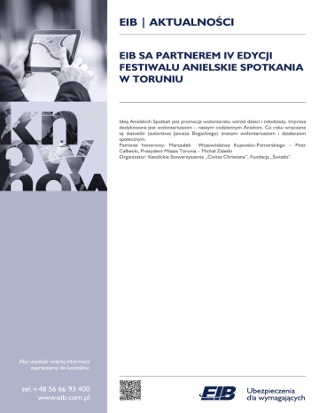 EIB | AKTUALNOŚCI EIB SA PARTNEREM IV EDYCJI FESTIWALU ANIELSKIE SPOTKANIA W TORUNIU Ideą Anielskich Spotkań jest promocja wolontariatu wśród dzieci i młodzieży. Impreza dedykowana jest wolontariuszom – naszym codziennym Aniołom. Co roku wręczane są statuetki (autorstwa Janusza Bogackiego) znanym wolontariuszom i działaczom społecznym. Patronat honorowy: Marszałek Województwa Kujawsko-Pomorskiego – Piotr Całbecki, Prezydent Miasta Torunia – Michał Zaleski Organizator: Katolickie Stowarzyszenie „Civitas Christiana”, Fundacja „Światło”. Aby uzyskać więcej informacji zapraszamy do kontaktu: tel.+48 56 66 93 400 www.eib.com.pl