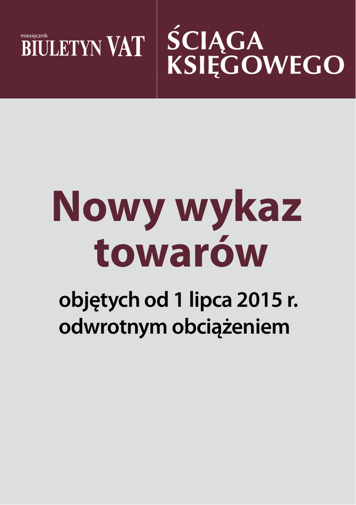miesięcznik ŚCIĄGA KSIĘGOWEGO Nowy wykaz towarów objętych od 1 lipca 2015 r. odwrotnym obciążeniem ściąga księgowego miesięcznik Nowy wykaz towarów objętych od 1 lipca 2015 r. odwrotnym obciążeniem Od 1 lipca 2015 r. został powiększony wykaz towarów objętych odwrotnym obciążeniem. Zmieniono również zasady rozliczania tych dostaw. Wprowadzono też dodatkowe obowiązki dla sprzedawców tych towarów. Rozliczenie VAT od dostaw towarów wymienionych w załączniku nr 11 do ustawy – od 1 lipca 2015 r. Lp. Status sprzedawcy 1 2 1. Podatnik VAT czynny Status nabywcy 3 Podatnik VAT czynny Kto rozlicza VAT Obowiązki sprzedawcy Obowiązki nabywcy 4 5 6 Rozliczy nabywca, gdy: n dostawa nie jest objęta zwolnieniem wskazanym w art. 43 ust. 1 pkt 2 lub art. 122 ustawy, n dostawa jest dokonana w ramach jednolitej gospodarczo transakcji o wartości przekraczającej 20 000 zł netto w przypadku towarów wymienionych w poz. 28a–28c. Gdy dostawa jest objęta zwolnieniem lub nie jest dokonywana w ramach jednolitej gospodarczo transakcji, której wartość przekracza 20 000 zł (w przypadku towarów wymienionych w poz. 28a–28c), VAT rozlicza sprzedawca. Gdy do rozliczenia VAT zobowiązany jest nabywca, to sprzedawca: n wystawia fakturę bez stawki i kwoty podatku, z adnotacją „odwrotne obciążenie”, n rozlicza dostawę w poz. 31 deklaracji VAT-7/VAT-7K/ VAT-7D, n składa informację podsumowującą (VAT-27). Jeśli nabywca rozlicza VAT za sprzedawcę, to: n nalicza VAT od kwoty wykazanej na fakturze dostawcy, n może wystawić dokument wewnętrzny, ale nie musi, n rozlicza dostawę w poz. 31 i 32 oraz 39 i 40 albo 41 i 42, gdy przysługuje mu prawo do odliczenia VAT w deklaracji VAT- 7 / VAT- 7 K / /VAT-7D. BIULETYN VAT nr 6/2015 1 2 3 4 5 6 2. Podatnik VAT czynny Podatnik VAT zwolniony lub osoba fizyczna, która nie prowadzi działalności gospodarczej Sprzedawca 3. Podatnik VAT zwolniony Podatnik VAT czynny lub zwolniony albo osoba fizyczna, która nie prowadzi działalności gospodarczej Nie rozlicza w VAT zaDostawa jest zwolniona z Sprzedawca: n ma obowiązek wy- kupu. VAT. stawić fakturę tylko na żądanie nabywcy, n nie składa deklaracji VAT ani informacji podsumowującej. 4. Osoba fizyczna nieprowadząca działalności gospodarczej Podatnik VAT czynny lub zwolniony Dostawa nie podlega opo- Nie rozlicza w VAT Nie rozlicza w VAT zadatkowaniu. dostawy. kupu. Nie rozlicza w VAT zaSprzedawca: n wystawia fakturę ze kupu. stawką i kwotą VAT, chyba że dostawa korzysta ze zwolnienia lub nie ma obowiązku jej wystawienia, n rozlicza VAT w deklaracji VAT-7/ /VAT-7K/VAT-7D od dokonanej dostawy, jak od „normalnej” sprzedaży, n nie składa informacji podsumowującej. Nowy wykaz towarów z zał. nr 11 do ustawy o VAT, w przypadku dostaw których podatnikiem na podstawie art. 17 ust. 1 pkt 7 ustawy jest nabywca 1 1 2 3 4 5 Symbol PKWiU 2 24.10.12.0 24.10.14.0 24.10.31.0 24.10.32.0 24.10.35.0 6 24.10.36.0 7 8 24.10.41.0 24.10.43.0 Poz. Nazwa towaru (grupy towarów) 3 Żelazostopy Granulki i proszek z surówki, surówki zwierciadlistej lub stali Wyroby płaskie walcowane na gorąco, o szerokości >= 600 mm, ze stali niestopowej Wyroby płaskie walcowane na gorąco, o szerokości < 600 mm, ze stali niestopowej Wyroby płaskie walcowane na gorąco, o szerokości >= 600 mm, z pozostałej stali stopowej, z wyłączeniem wyrobów ze stali krzemowej elektrotechnicznej Wyroby płaskie walcowane na gorąco, o szerokości < 600 mm, z pozostałej stali stopowej z wyłączeniem wyrobów ze stali krzemowej elektrotechnicznej Wyroby płaskie walcowane na zimno, o szerokości >= 600 mm, ze stali niestopowej Wyroby płaskie walcowane na zimno, o szerokości >= 600 mm, z pozostałej stali stopowej, z wyłączeniem wyrobów ze stali krzemowej elektrotechnicznej BIULETYN VAT nr 6/2015 1 9 2 24.10.51.0 10 24.10.52.0 11 12 24.10.61.0 24.10.62.0 13 24.10.65.0 14 24.10.66.0 15 24.10.71.0 16 24.10.73.0 17 18 24.31.10.0 24.31.20.0 19 20 24.32.10.0 24.32.20.0 21 24.33.11.0 Od 1 lipca 2015 r. 21a 22 24.33.20.0 24.34.11.0 3 Wyroby płaskie walcowane, o szerokości >= 600 mm, ze stali niestopowej, platerowane, powlekane lub pokrywane Wyroby płaskie walcowane, o szerokości >= 600 mm, z pozostałej stali stopowej, platerowane, powlekane lub pokrywane Pręty walcowane na gorąco, w nieregularnie zwijanych kręgach, ze stali niestopowej Pozostałe pręty ze stali, nieobrobione więcej niż kute, na gorąco walcowane, ciągnione lub wyciskane, włączając te, które po walcowaniu zostały skręcone Pręty walcowane na gorąco, w nieregularnie zwijanych kręgach, z pozostałej stali stopowej Pozostałe pręty z pozostałej stali stopowej, nieobrobione więcej niż kute, na gorąco walcowane, ciągnione lub wyciskane, włączając te, które po walcowaniu zostały skręcone Kształtowniki otwarte, nieobrobione więcej niż walcowane na gorąco, ciągnione na gorąco lub wyciskane, ze stali niestopowej Kształtowniki otwarte, nieobrobione więcej niż walcowane na gorąco, ciągnione na gorąco lub wyciskane, z pozostałej stali stopowej Pręty ciągnione na zimno oraz kątowniki, kształtowniki i profile, ze stali niestopowej Pręty ciągnione na zimno oraz kątowniki, kształtowniki i profile, z pozostałej stali stopowej Wyroby płaskie walcowane na zimno, ze stali, o szerokości < 600 mm, niepokrywane Wyroby płaskie walcowane na zimno, ze stali, o szerokości < 600 mm, platerowane, powlekane lub pokrywane Kształtowniki otwarte, formowane lub profilowane na zimno, ze stali niestopowej Arkusze żeberkowane ze stali niestopowej Drut ciągniony na zimno, ze stali niestopowej Od 1 lipca 2015 r. 22a ex 24.41.20.0 22b bez względu na symbol PKWiU ex 24.41.50.0 22c 22d 24.42.11.0 22e 24.43.11.0 22f 24.43.12.0 22g 24.43.13.0 23 24.44.12.0 24 24.44.13.0 25 24.44.21.0 26 24.44.22.0 27 24.44.23.0 Od 1 lipca 2015 r. 27a 24.45.11.0 Złoto nieobrobione plastycznie lub w postaci półproduktu, lub w postaci pros