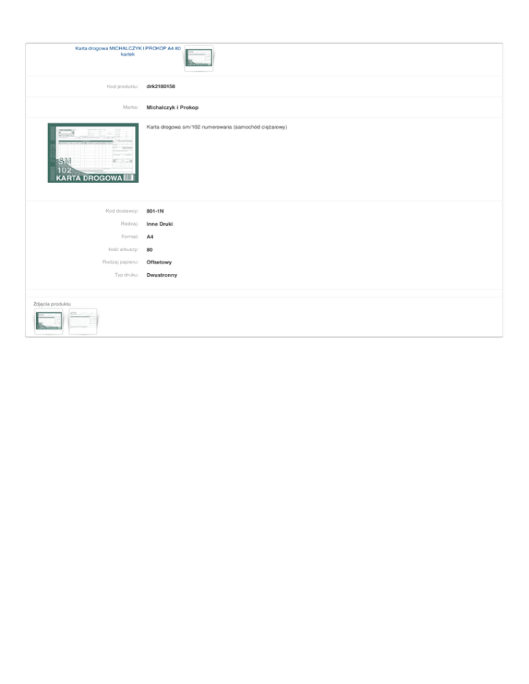 Karta drogowa MICHALCZYK I PROKOP A4 80 kartek Kod produktu: Marka: drk2180158 Michalczyk i Prokop Karta drogowa sm/102 numerowana (samochód ciężarowy) Kod dostawcy: Rodzaj: Inne Druki Format: A4 Ilość arkuszy: 80 Rodzaj papieru: Typ druku: Opakowanie: Zdjęcia produktu 801-1N Offsetowy Dwustronny
