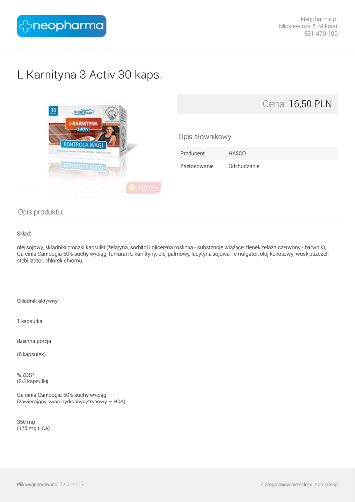 Neopharma.pl Mickiewicza 5, Mikstat 531-470-109 L-Karnityna 3 Activ 30 kaps. Cena: 16,50 PLN Opis słownikowy Producent HASCO Zastosowanie Odchudzanie Opis produktu Skład: olej sojowy, składniki otoczki kapsułki (żelatyna, sorbitol i gliceryna roślinna - substancje wiążące, tlenek żelaza czerwony - barwnik), Garcinia Cambogia 50% suchy wyciąg, fumaran L-karnityny, olej palmowy, lecytyna sojowa - emulgator, olej kokosowy, wosk pszczeli stabilizator, chlorek chromu. Składnik aktywny 1 kapsułka dzienna porcja (6 kapsułek) % ZDS* (2-3 kapsułki) Garcinia Cambogia 50% suchy wyciąg (zawierający kwas hydroksycytrynowy – HCA) 350 mg (175 mg HCA) Plik wygenerowano: 02-03-2017 Oprogramowanie sklepu: AptusShop Neopharma.pl Mickiewicza 5, Mikstat 531-470-109 700 - 1050 mg (350 - 525 mg HCA) Fumaran L-karnityny 200 mg 400 - 600 mg -Chrom 30 µg 60 - 90 µg 150% - 225% *ZDS – zalecane dzienne spożycie Właściwości i zastosowanie: Składnikami L-KARNITYNA 3 ACTIV NATURKAPS są L-karnityna, kwas hydroksycytrynowy (HCA) zawarty w wyciągu z owocu Garcinia Cambogia oraz chrom. Kwas hydroksycytrynowy (HCA) hamuje magazynowanie tłuszczów i tym samym przyspiesza wykorzystanie znajdujących się w organizmie zasobów energii. HCA wzmaga uczucie sytości i zmniejsza chęć do spożywania pokarmu. Chrom wspomaga działanie HCA, przyczynia się także do prawidłowego metabolizmu białek, tłuszczów i węglowodanów oraz pomaga w utrzymaniu prawidłowego poziomu cukru we krwi. Chrom wchodzi w skład czynnika tolerancji glukozy GTF (glucose tolerance factor), który stymuluje aktywność insuliny w organizmie. Wzmożone działanie insuliny korzystnie wpływa na katabolizm węglowodanów i tłuszczów, co pomaga w utrzymaniu wagi ciała. Kapsułki L-Karnityna 3 Activ Naturkaps uzupełniają dietę w aktywne składniki preparatu i są polecane: osobom z tendencją do nadwagi osobom dbającym o utrzymanie prawidłowej wagi ciała Sposób użycia: Dorośli: 1 kapsułka 2-3 razy dziennie na 30-60 minut przed posiłkiem popijając szklanką wody. Nie należy przekraczać zalecanej porcji do spożycia w ciągu dnia. Produkt nie może być stosowany jako substytut zróżnicowanej diety. Ważne jest prowadzenie zdrowego trybu życia i zrównoważonego sposobu żywienia. Plik wygenerowano: 02-03-2017 Powered by TCPDF (www.tcpdf.org) Oprogramowanie sklepu: AptusShop
