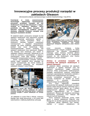 Innowacyjne procesy produkcji narzędzi w zakładach Gleason (tłumaczenie artykułu zamieszczonego w piśmie Geartechnology / maj 2013) Inwestycje w nowe, zaawansowane technologie zapewniają innowacyjność procesów produkcji narzędzi do kół stożkowych oraz do kół walcowych o dużym module w zakładach Gleason, która przekłada się na istotne korzyści dla klientów wymagających krótkich czasów dostawy, większej trwałości narzędzi oraz lepszych rezultatów obróbki. W ostatnich latach, producenci narzędzi do kół zębatych stożkowych oraz walcowych uzyskali znaczną poprawę parametrów, jakości i żywotności swoich produktów. Wraz z szybszymi, bardziej trwałymi maszynami numerycznymi z napędem bezpośrednim pojawiły się nowe materiały, zaawansowane powłoki oraz nowe konstrukcje, które zrewolucjonizowały proces produkcji kół zębatych stożkowych oraz walcowych. Miejsce ma również inna rewolucja, tym razem w zakładach liderów przemysłu. Rewolucja ta ma mniej do czynienia z wynalazkami, a więcej z inwestycjami, mówi Bob Phillips, Gleason Corporation wiceprezydent senior ds. narzędzi. „Nowe, wysokowydajne produkty stanowią istotną część podejścia firmy opartego na nowych rozwiązaniach, ale równie istotne są nowe procesy wdrażane we wszystkich zakładach Gleason” mówi Phillips. Zakład Gleason Cutting Tools w Loves Park, Illinois, w którym wprowadzono innowacyjne procesy produkcji frezów modułowych krążkowych oraz frezów ślimakowych (fotografia udostępniona przez Gleason Corp.). przez znacznie mniejszą liczbę zaawansowanych nowych urządzeń. To dobra wiadomość dla klientów wymagających krótszego czasu dostawy wysokiej jakości produktów. Najlepiej widać to na przykładzie narzędzi do kół stożkowych oraz frezów walcowych o dużym module.” Zmiany w produkcji narzędzi do produkcji kół zębatych stożkowych o zębach łukowych W ostatnich latach, produkcja kół zębatych stożkowych o zębach łukowych oraz kół zębatych hipoidalnych uległa znacznym zmianom. Wielu producentów wielkoseryjnych zastąpiło mechaniczne maszyny wykonujące tradycyjne pięcioetapowe frezowanie czołowe z pojedynczym indeksowaniem lub ostatnio procesy „completing” maszynami CNC o wysokiej wydajności do obróbki na sucho węglikami w procesie frezowania obwiedniowego lub kształtowego. Przy czym większość niewielkich producentów kół zębatych stożkowych na całym świecie nadal stosuje maszyny starszego typu z układami różnych typów głowic, np. z nożami zintegrowanymi (głowice monolityczne), w układzie segmentowym lub z nożami wkładanymi. Gleason jest dostawcą szerokiego asortymentu produktów oraz maszyn dla różnych technik frezowania. Firma wytwarza doskonale znane marki głowic z nożami wkładanymi Ridg-AC oraz Wedge-AC do obróbki zgrubnej odpowiednio kół i zębników; głowic Helixform oraz Hardac, również z nożami wkładanymi do Zintegrowany zespół IBG Gleason (Inserted Blade Grinder) zapewnia większą wydajność niż szlifierki manualne starego typu, podnosząc jakość i wydajność produkcji narzędzi z nożami wkładanymi do nowego poziomu. „W zakładzie w Loves Park w Illinois, maszyny starego typu stoją bezczynnie, a ich praca jest wykonywana z większą prędkością i precyzją 1 Dla producentów wykorzystujących pięcioetapowe procesy obróbki lub wykańczania kół zębatych stożkowych o zębach łukowych dostępne są głowice monolityczne oraz z nożami wkładanymi Gleason ze znacznie krótszymi czasami dostawy oraz znacznie zwiększoną dokładnością i powtarzalnością. Zespół do produkcji narzędzi Gleason o dużym module umożliwia wykonywanie narzędzi z pręta, nawet w przypadku frezów ślimakowych o średnicy 450 mm, długości 530 mm i module do 40, w terminie 6 tygodni. frezowania w trybie „completing” oraz wykańczającego kół i zębników oraz szereg głowic monolitycznych do frezowania w procesie „completing” oraz wykańczającego. Do niedawna, większa część noży/głowic wytwarzana była w zakładzie w Plymouth w Wielkiej Brytanii na kilkunastu maszynach manualnych wyprodukowanych w latach 50 ubiegłego wieku. Według Paula Chadwicka, menedżera produkcji w zakładzie Loves Park, proces produkcji w zbyt dużym stopniu zależał od umiejętności wykwalifikowanych operatorów maszyn, a także ich możliwości optymalnego wykorzystania wydajności i jakości maszyn. „Nawet operatorzy z trzydziestoletnim stażem mają często problem z wytworzeniem zestawu noży do głowic Hardac z materiału wyjściowego w czasie poniżej sześciu godzin z zastosowaniem maszyn starszego typu, a przygotowanie noży do frezów o dużej średnicy może zająć nawet 18 do 20 godzin” mówi Chadwick. „Proces ten jest wyjątkowo pracochłonny”. Wady tego procesu stały się oczywiste dla Phillipsa i jego zespołu w momencie przeniesienia produkcji nozy/głowic frezarskich do zakładu w Loves Park. W środowisku produkcyjnym, w którym szczególny nacisk położony jest na redukcję czasu produkcji, a zastosowanie metody produkcji „lean” oraz systemu Kanban skróciły czas dostawy produktów znacznie poniżej średniej dla przemysłu, starsze maszyny przestały być po prostu potrzebne, mówi Chadwick. „Pomimo, że proces wykrawania noży został zmodernizowany przez zastosowanie nowych centrów obróbczych CNC w zakładzie w Plymouth, nie była dostępna technologia zapewniająca podobne usprawnienia w procesach wykańczania. Nikt nie przypuszczał, że będziemy w stanie produkować te same noże i głowice monolityczne i głowice z nożami wkładanymi wielokrotnie szybciej i ze znacznie wyższą jakością przez operatorów bez wieloletniego doświadczeni, którzy przeszli kilkutygodniowe szkolenie.” Intensywne i wieloletnie zaangażowanie zespołu inżynierów Gleason na dwóch kontynentach zaowocowało opracowaniem dwóch rewolucyjnych 6-osiowych 