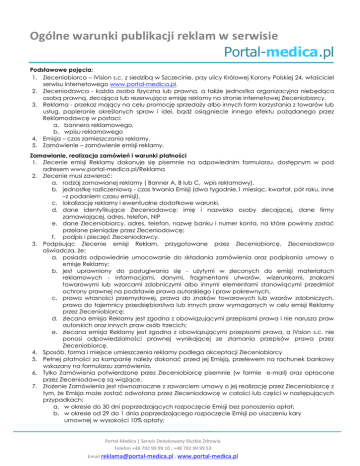 Ogólne warunki publikacji reklam w serwisie Portal-medica.pl Podstawowe pojęcia: 1. Zleceniobiorca – iVision s.c. z siedzibą w Szczecinie, przy ulicy Królowej Korony Polskiej 24, właściciel serwisu internetowego www.portal-medica.pl. 2. Zleceniodawca - każda osoba fizyczna lub prawna, a także jednostka organizacyjna niebędąca osobą prawną, zlecająca lub rezerwująca emisję reklamy na stronie internetowej Zleceniobiorcy. 3. Reklama - przekaz mający na celu promocję sprzedaży albo innych form korzystania z towarów lub usług, popieranie określonych spraw i idei, bądź osiągniecie innego efektu pożądanego przez Reklamodawcę w postaci: a. bannera reklamowego, b. wpisu reklamowego 4. Emisja – czas zamieszczania reklamy. 5. Zamówienie – zamówienie emisji reklamy. Zamawianie, realizacja zamówień i warunki płatności 1. Zlecenie emisji Reklamy dokonuje się pisemnie na odpowiednim formularzu, dostępnym w pod adresem www.portal-medica.pl/Reklama 2. Zlecenie musi zawierać: a. rodzaj zamawianej reklamy ( Banner A, B lub C, wpis reklamowy), b. jednostkę rozliczeniową - czas trwania Emisji (dwa tygodnie,1 miesiąc, kwartał, pół roku, inne –z podaniem czasu emisji), c. lokalizację reklamy i ewentualne dodatkowe warunki, d. dane identyfikujące Zleceniodawcę: imię i nazwisko osoby zlecającej, dane firmy zamawiającej, adres, telefon, NIP e. dane Zleceniobiorcy, adres, telefon, nazwę banku i numer konta, na które powinny zostać przelane pieniądze przez Zleceniodawcę; f. podpis i pieczęć Zleceniodawcy. 3. Podpisując Zlecenie emisji Reklam, przygotowane przez Zleceniobiorcę, Zleceniodawca oświadcza, że: a. posiada odpowiednie umocowanie do składania zamówienia oraz podpisania umowy o emisje Reklamy; b. jest uprawniony do posługiwania się - użytymi w zleconych do emisji materiałach reklamowych - informacjami, danymi, fragmentami utworów, wizerunkami, znakami towarowymi lub wzorcami zdobniczymi albo innymi elementami stanowiącymi przedmiot ochrony prawnej na podstawie prawa autorskiego i praw pokrewnych, c. prawa własności przemysłowej, prawa do znaków towarowych lub wzorów zdobniczych, prawa do tajemnicy przedsiębiorstwa lub innych praw wymaganych w celu emisji Reklamy przez Zleceniobiorcę; d. zlecana emisja Reklamy jest zgodna z obowiązującymi przepisami prawa i nie narusza praw autorskich oraz innych praw osób trzecich; e. zlecana emisja Reklamy jest zgodna z obowiązującymi przepisami prawa, a iVision s.c. nie ponosi odpowiedzialności prawnej wynikającej ze złamania przepisów prawa przez Zleceniobiorcę. 4. Sposób, forma i miejsce umieszczenia reklamy podlega akceptacji Zleceniobiorcy 5. Pełnej płatności za kampanię należy dokonać przed jej Emisją, przelewem na rachunek bankowy wskazany na formularzu zamówienia. 6. Tylko Zamówienia potwierdzone przez Zleceniobiorcę pisemnie (w formie e-mail) oraz opłacone przez Zleceniodawcę są wiążące. 7. Złożenie Zamówienia jest równoznaczne z zawarciem umowy o jej realizację przez Zleceniobiorcę z tym, że Emisja może zostać odwołana przez Zleceniodawcę w całości lub części w następujących przypadkach: a. w okresie do 30 dni poprzedzających rozpoczęcie Emisji bez ponoszenia opłat; b. w okresie od 29 do 1 dnia poprzedzającego rozpoczęcie Emisji po uiszczeniu kary umownej w wysokości 10% opłaty; Portal-Medica | Serwis Dedykowany Służbie Zdrowia Telefon +48 792 99 99 10 ; +48 792 99 99 53 Email [email protected] ; www.portal-medica.pl w trakcie Emisji po uiszczeniu kary umownej w wysokości 60% opłaty. 8. Rezygnacja z całości lub części Zamówienia musi być dokonana na piśmie lub w formie elektronicznej, w terminach podanych powyżej, pod rygorem nieważności. 9. Zleceniobiorca zastrzega sobie prawo zmiany terminów emisji z przyczyn programowych lub technicznych. W takiej sytuacji banner reklamowy zostanie wyemitowany w innym, najbliższym możliwym terminie, uzgodnionym przez Strony. 10. Zleceniodawca upoważnia Zleceniobiorcę do wystawienia faktur VAT bez podpisu Zleceniodawcy. Przestrzeganie prawa, treść i styl reklam 1. Zleceniodawca zobowiązany jest do zamieszczania Reklam nienaruszających praw osób trzecich, dobrych obyczajów ani przepisów obowiązującego prawa. 2. Zleceniodawca ponosi pełną odpowiedzialność za skutki zamieszczenia Reklamy. 3. Reklamy nie mogą naśladować ani symulować elementów stron, na których będą prezentowane i powinny być łatwo rozpoznawalne jako reklamy. 4. Zleceniodawca zobowiązany jest do naprawienia ewentualnych szkód powstałych po stronie Zleceniobiorcy w związku z treścią zamieszczonej reklamy. 5. Zleceniobiorca zastrzega sobie prawo do: a. odmowy oraz wstrzymania emisji Reklam bez podania przyczyny, w szczególności, jeżeli zachodzi uzasadnione podejrzenie, że z ich treści lub treści strony docelowej wynika, że są one sprzeczne z prawem lub zasadami współżycia społecznego lub naruszają słuszne prawa osób trzecich, w tym firmy lub pracowników iVision s.c. b. odmowy oraz do wstrzymania Emisji również w wypadku, jeżeli treść lub forma reklam jest sprzeczna z interesem Zleceniobiorcy, 6. Zleceniobiorca nie ponosi żadnej odpowiedzialności za: a. treść i zawartość merytoryczną zamieszczanych reklam, b. zamieszczanie przez Zleceniodawców danych niezgodnych z prawdą lub fałszywych, c. straty moralne i finansowe wynikłe z treści zamieszczanych Reklam. Warunki techniczne 1. Banner reklamowy to graficzny element strony html mający postać pliku gif, png lub jpg. Pliki typu gif mogą zawierać animację (tzw. gif animowany). 2. Do emisji przyjmowane są Bannery o wymiarach 728x90 (typ A) , 300 x 250 ( typ B ) oraz 468 x 90 (typ C) pikseli. 3. Maksymalna wielkość pojedynczego banera wynosi 50 kB. Wyższa, po dodatkowych uzgodnieniach i może wiązać się ze zwiększoną opłatą. 4. Integralną częścią Bannera typu A , B i C jest hiperłącze czyli od