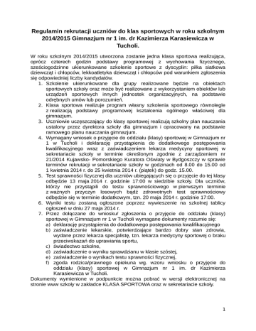 Regulamin rekrutacji uczniów do klas sportowych w roku szkolnym 2014/2015 Gimnazjum nr 1 im. dr Kazimierza Karasiewicza w Tucholi. W roku szkolnym 2014/2015 utworzona zostanie jedna klasa sportowa realizująca, oprócz czterech godzin podstawy programowej z wychowania fizycznego, sześciogodzinne ukierunkowane szkolenie sportowe z dyscyplin: piłka siatkowa dziewcząt i chłopców, lekkoatletyka dziewcząt i chłopców pod warunkiem zgłoszenia się odpowiedniej liczby kandydatów. 1. Szkolenie ukierunkowane dla grupy realizowane będzie na obiektach sportowych szkoły oraz może być realizowane z wykorzystaniem obiektów lub urządzeń sportowych innych jednostek organizacyjnych, na podstawie odrębnych umów lub porozumień. 2. Klasa sportowa realizuje program własny szkolenia sportowego równolegle z realizacją podstawy programowej kształcenia ogólnego właściwej dla gimnazjum. 3. Uczniowie uczęszczający do klasy sportowej realizują szkolny plan nauczania ustalony przez dyrektora szkoły dla gimnazjum i opracowany na podstawie ramowego planu nauczania gimnazjum. 4. Wymagany wniosek o przyjęcie do oddziału (klasy) sportowej w Gimnazjum nr 1 w Tucholi i deklarację przystąpienia do dodatkowego postępowania kwalifikacyjnego wraz z zaświadczeniem lekarza medycyny sportowej w sekretariacie szkoły w terminie określonym zgodnie z zarządzeniem nr 21/2014 Kujawsko- Pomorskiego Kuratora Oświaty w Bydgoszczy w sprawie terminów rekrutacji w sekretariacie szkoły w godzinach od 8.00 do 15.00 od 1 kwietnia 2014 r. do 25 kwietnia 2014 r. (piątek) do godz. 15.00. 5. Test sprawności fizycznej dla uczniów ubiegających się o przyjęcie do tej klasy odbędzie 13 maja 2014 r. godzinie 17:00 w siedzibie szkoły. Dla uczniów, którzy nie przystąpili do testu sprawnościowego w pierwszym terminie z ważnych przyczyn losowych bądź zdrowotnych test sprawnościowy odbędzie się w terminie dodatkowym, tzn. 20 maja 2014 r. godzinie 17:00. 6. Wyniki testu zostaną ogłoszone poprzez wywieszenie na szkolnej tablicy ogłoszeń w dniu 27 maja 2014 r. 7. Przez dołączane do wniosku/ zgłoszenia o przyjęcie do oddziału (klasy) sportowej w Gimnazjum nr 1 w Tucholi wymagane dokumenty rozumie się: a) deklarację przystąpienia do dodatkowego postępowania kwalifikacyjnego b) zaświadczenie lekarskie, potwierdzające bardzo dobry stan zdrowia, wydane przez lekarza specjalistę, tzn. lekarza medycyny sportowej o braku przeciwskazań do uprawiania sportu, c) świadectwo szkolne, d) zaświadczenie o wyniku sprawdzianu w klasie szóstej, e) zaświadczenie o wynikach testu sprawności fizycznej, f) zgoda rodzica/prawnego opiekuna wg. wzoru wniosku o przyjęcie do oddziału (klasy) sportowej w Gimnazjum nr 1 im. dr Kazimierza Karasiewicza w Tucholi. Dokumenty wymienione w podpunkcie można pobrać w wersji elektronicznej na stronie www szkoły w zakładce KLASA SPORTOWA oraz w sekretariacie szkoły. 1 HARMONOGRAM - REKRUTACJA DO ODZIAŁU (KLASY) SPORTOWEJ W GIMNAZJUM NR 1 W TUCHOLI DATA ETAP Od 1. 04.2014 r. do 25. 04. 2014 r. Składanie wniosków/ zgłoszeń o przyjęcie do oddziału (klasy) sportowej w Gimnazjum nr 1 w Tucholi i deklaracji przystąpienia do dodatkowego postępowania kwalifikacyjnego wraz z zaświadczeniem lekarza medycyny sportowej w sekretariacie szkoły. Test sprawności fizycznej. 13. 05.2014 r. 20. 05. 2014 r. 27. 05. 2014 r. do 30. 06. 2014 r. 1. 07. 2014 r. 2. 07. 2014 r. 04.07.2014 r. Test sprawności fizycznej dla kandydatów, którzy nie przystąpili do testu sprawnościowego w pierwszym terminie z ważnych przyczyn losowych bądź zdrowotnych. Ogłoszenie wyników testu sprawności fizycznej. Składanie w sekretariacie szkoły świadectwa ukończenia szkoły podstawowej i zaświadczeń Okręgowej Komisji Egzaminacyjnej o wynikach sprawdzianu oraz innych wymaganych dokumentów. Ogłoszenie list zakwalifikowanych do przyjęcia do oddziału (klasy) sportowej w Gimnazjum nr 1 w Tucholi Potwierdzenie woli podjęcia nauki w oddziale (klasie) sportowej przez kandydatów zakwalifikowanych do przyjęcia do oddziału (klasy) sportowej w Gimnazjum nr 1 w Tucholi Ogłoszenie listy uczniów przyjętych do oddziału (klasy) sportowej w Gimnazjum nr 1 w Tucholi 8. Obowiązki ucznia klasy sportowej: a) osiąganie zadowalających wyników w nauce i zachowaniu, pozwalające na realizację dodatkowych godzin wychowania fizycznego oraz 2 reprezentowania szkoły bez uszczerbku w realizacji podstaw programowych z przedmiotów przewidzianych w organizacji procesu kształcenia ucznia Gimnazjum nr 1 w Tucholi. b) osiąganie postępów w sporcie. c) uzyskiwanie co najmniej poprawnej oceny zachowania w trakcie nauki. d) reprezentowanie szkoły w zawodach sportowych zgodnie ze statutem szkoły. 9. Informacje dodatkowe: a) wszystkie zajęcia edukacyjne poza wychowaniem fizycznym realizowane są zgodnie z ramowym przydziałem godzin ustalonym dla klas ogólnych. b) w przypadku niewypełniania przez rodziców/opiekunów prawnych pkt 12, a przez ucznia pkt 8 włącznie z długotrwałymi zwolnieniami lekarskimi wykluczającymi z udziału czynnego w zajęciach sportowych, uczeń będzie przeniesiony do klasy na warunkach ogólnych. 10. O przyjęciu do klasy sportowej decyduje Komisja rekrutacyjna na podstawie zdobytych punktów z testu sprawności fizycznej i świadectwa ukończenia szkoły podstawowej (wymagana ocena z zachowania co najmniej poprawna, a z wychowania fizycznego co najmniej dobra) oraz wyniku sprawdzianu w klasie szóstej. 11. W indywidualnych przypadkach decyduje dyrektor szkoły. 12. Rodzic/opiekun prawny ucznia oddziału (klasy) sportowej zobowiązuje się do: a) dostarczania odpowiedniej dokumentacji lekarskiej . b) zakupu wymaganych strojów sportowych (obuwie sportowe, koszulka, spodenki, dresy, torba sportowa). c) kontrolowania postępów dziecka w nauce i sporcie. 13. Informacje dodatkowe: a) wszystkie zajęcia edukacyjne poza wychowaniem fizycznym realizowane są zgodnie z ra