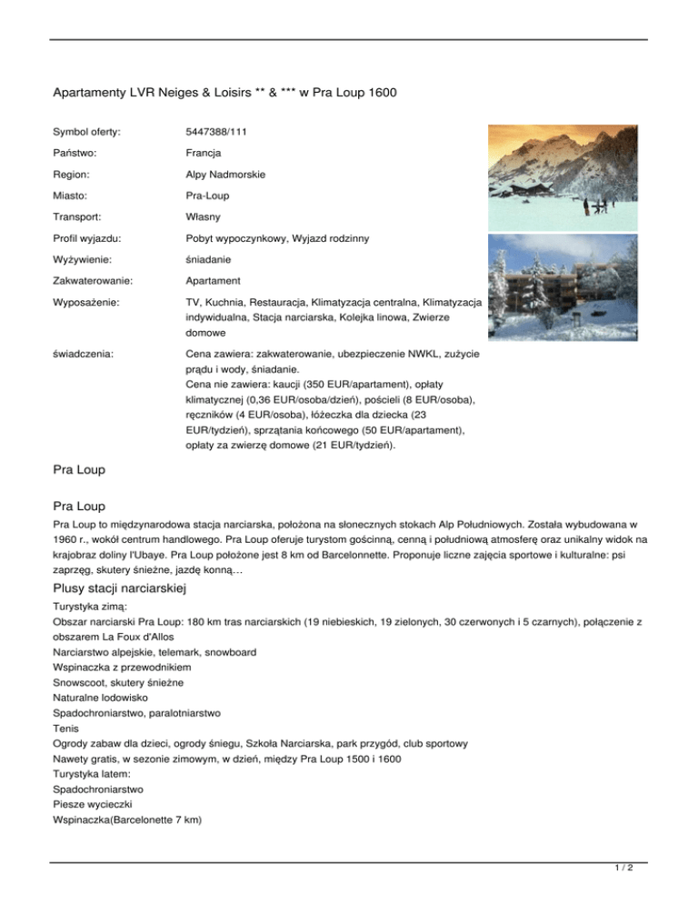 Apartamenty LVR Neiges & Loisirs ** & *** w Pra Loup 1600 Symbol oferty: 5447388/111 Państwo: Francja Region: Alpy Nadmorskie Miasto: Pra-Loup Transport: Własny Profil wyjazdu: Pobyt wypoczynkowy, Wyjazd rodzinny Wyżywienie: śniadanie Zakwaterowanie: Apartament Wyposażenie: TV, Kuchnia, Restauracja, Klimatyzacja centralna, Klimatyzacja indywidualna, Stacja narciarska, Kolejka linowa, Zwierze domowe świadczenia: Cena zawiera: zakwaterowanie, ubezpieczenie NWKL, zużycie prądu i wody, śniadanie. Cena nie zawiera: kaucji (350 EUR/apartament), opłaty klimatycznej (0,36 EUR/osoba/dzień), pościeli (8 EUR/osoba), ręczników (4 EUR/osoba), łóżeczka dla dziecka (23 EUR/tydzień), sprzątania końcowego (50 EUR/apartament), opłaty za zwierzę domowe (21 EUR/tydzień). Pra Loup Pra Loup Pra Loup to międzynarodowa stacja narciarska, położona na słonecznych stokach Alp Południowych. Została wybudowana w 1960 r., wokół centrum handlowego. Pra Loup oferuje turystom gościnną, cenną i południową atmosferę oraz unikalny widok na krajobraz doliny l'Ubaye. Pra Loup położone jest 8 km od Barcelonnette. Proponuje liczne zajęcia sportowe i kulturalne: psi zaprzęg, skutery śnieżne, jazdę konną… Plusy stacji narciarskiej Turystyka zimą: Obszar narciarski Pra Loup: 180 km tras narciarskich (19 niebieskich, 19 zielonych, 30 czerwonych i 5 czarnych), połączenie z obszarem La Foux d'Allos Narciarstwo alpejskie, telemark, snowboard Wspinaczka z przewodnikiem Snowscoot, skutery śnieżne Naturalne lodowisko Spadochroniarstwo, paralotniarstwo Tenis Ogrody zabaw dla dzieci, ogrody śniegu, Szkoła Narciarska, park przygód, club sportowy Nawety gratis, w sezonie zimowym, w dzień, między Pra Loup 1500 i 1600 Turystyka latem: Spadochroniarstwo Piesze wycieczki Wspinaczka(Barcelonette 7 km) 1/2 Rafting, canyoning Trasy rowerowe Basen w Barcelonnette Golf, strzelanie z łuku, jazda konna Club sportowy Położenie Neiges & Loisirs proponuje szeroki wybór apartamentów i chalets, znajdujących się w Pra Loup 1500 i 1600. Wszystkie apartamenty i chalets są o standardzie 2**. Apartamenty znajdują się maksymalnie 300 m od pierwszych wyciągów narciarskich, chalets - 500 m, a w Pra Loup - 500 m od sklepów. Apartamenty Wszystkie apartamenty i chalet wyposażone są w: aneks kuchenny (piec elektryczny, lodówka), łazienkę lub prysznic, WC, balkon. Studio 2-4-osobowe typu cabine: 20-25 m2 Apartament 2 pokojowy 4-6-osobowy typu cabine: 30-35 m2 Apartament 3 pokojowy 6-8-osobowy typu cabine: ok. 45 m2 Zakwaterowanie: sobota od godz. 17.00. Wykwaterowanie: sobota do godz. 10.00. Dojazd Pociąg: dworzec w Gap, następnie autobus do Pra Loup (w sezonie zimowym), wynajęty samochód lub taxi (w sezonie letnim). Samolot: lotnisko w Marseille Provence: transfer busem (w soboty, w sezonie zimowym), transfer tam i z powrotem TGV z Marsylii lub Aix en Provence. TERMINY: od: 2017-03-04 do: 2017-03-11 (8 dni), miejsca: zamów cena od: 361 PLN = 83 EUR od: 2017-03-11 do: 2017-03-18 (8 dni), miejsca: zamów cena od: 307 PLN = 71 EUR od: 2017-03-18 do: 2017-03-25 (8 dni), miejsca: zamów cena od: 307 PLN = 71 EUR od: 2017-03-25 do: 2017-04-01 (8 dni), miejsca: zamów cena od: 307 PLN = 71 EUR od: 2017-04-01 do: 2017-04-08 (8 dni), miejsca: zamów cena od: 307 PLN = 71 EUR od: 2017-04-08 do: 2017-04-15 (8 dni), miejsca: zamów cena od: 307 PLN = 71 EUR CENNIK: Długość pobytu: 8 dni 8 dni Grupa cenowa: A B Pobyt w obiekcie (do wyboru) apartament 3 pokojowy 6-8-osobowy standardowo dla osób: 8 minimalnie: 6 535 (*) studio 2-4-osobowe standardowo dla osób: 4 minimalnie: 2 255 apartament 2 pokojowy 4-6-osobowy standardowo dla osób: 6 minimalnie: 4 395 Ubezpieczenie (do wyboru) (*) ubezpieczenie NWKLSKI Ubezpieczenie (opcjonalne) ubezpieczenie od kosztów rezygnacji 602 305 459 7 7 2.4 % 2.4 % Waluta: EUR Aktualne ceny z systemu S.A.R.T. (-) - cena usługi, podatku kalkulowana przy osobie lub gratis (*) - kwota wliczona w cenę standardową 2/2