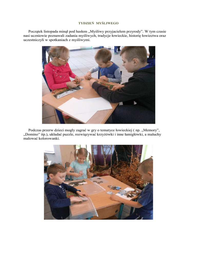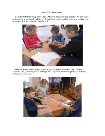 TYDZIEŃ MYŚLIWEGO Początek listopada minął pod hasłem „Myśliwy przyjacielem przyrody”. W tym czasie nasi uczniowie poznawali zadania myśliwych, tradycje łowieckie, historię łowiectwa oraz uczestniczyli w spotkaniach z myśliwymi. Podczas przerw dzieci mogły zagrać w gry o tematyce łowieckiej ( np. „Memory”, „Domino” itp.), układać puzzle, rozwiązywać krzyżówki i inne łamigłówki, a maluchy malować kolorowanki. W bibliotece przygotowana była czytelnia, gdzie na dzieci czekały książki dotyczące historii łowiectwa, roli myśliwego, a także książki przyrodnicze, m.in. dotyczące bażanta – tegorocznego bohatera konkursu „Ożywić pola”. Uwieńczeniem był konkurs plastyczny organizowany w dwóch kategoriach wiekowych: klasy I - III i klasy IV – VI. Wyniki podane zostały podczas „Szkolnych Uroczystości Hubertowskich”. Nagrody ufundowane zostały przez Łowczego Okręgowego Polskiego Związku Łowieckiego – Romana Rycombla oraz pana Edwarda Makówkę – wieloletniego przyjaciela naszej szkoły, myśliwego z KŁ „Widawa” we Wrocławiu. Wyniki konkursu plastycznego: Kategoria klasy I – III Kategoria klasy IV – VI I miejsce – Weronika Zalewska I miejsce – Patryk Budzik II miejsce – Marcel Klecki II miejsce – Bartosz Rzeszowski III miejsce – Malwina Kulok III miejsce – Justyna Pilarska Wyróżnienie – Paulina Cygan Wyróżnienie - Kacper Cygan Martyna Romankiewicz Marek Sobieski Dobrosława Płaczek Jakub Mastela