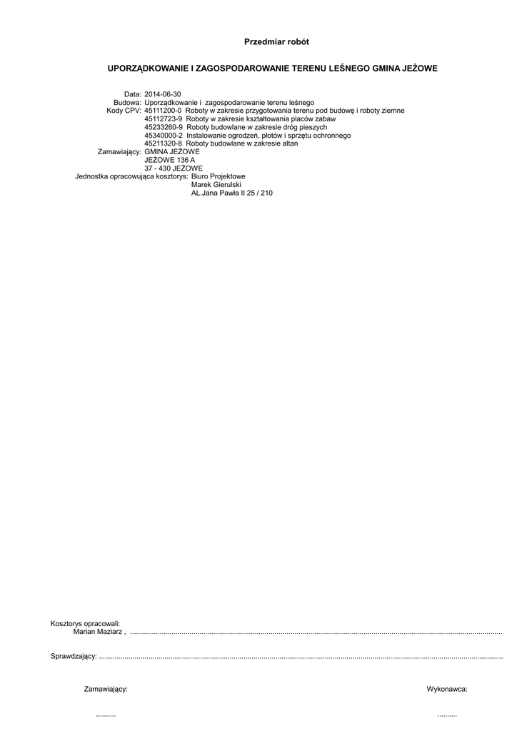 Przedmiar robót UPORZĄDKOWANIE I ZAGOSPODAROWANIE TERENU LEŚNEGO GMINA JEŻOWE Data: 2014-06-30 Budowa: Uporządkowanie i zagospodarowanie terenu leśnego Kody CPV: 45111200-0 Roboty w zakresie przygotowania terenu pod budowę i roboty ziemne 45112723-9 Roboty w zakresie kształtowania placów zabaw 45233260-9 Roboty budowlane w zakresie dróg pieszych 45340000-2 Instalowanie ogrodzeń, płotów i sprzętu ochronnego 45211320-8 Roboty budowlane w zakresie altan Zamawiający: GMINA JEŻOWE JEŻOWE 136 A 37 - 430 JEŻOWE Jednostka opracowująca kosztorys: Biuro Projektowe Marek Gierulski AL.Jana Pawła II 25 / 210 Kosztorys opracowali: Marian Maziarz , .................................................................................................................................................................................................... Sprawdzający: ................................................................................................................................................................................................................... Zamawiający: Wykonawca: .......... .......... UPORZĄDKOWANIE I ZAGOSPODAROWANIE TERENU LEŚNEGO GMINA JEŻOWE Zuzia (C) DataComp 1994-2009(lic. 14286) strona nr: 2 Ogólna charakterystyka obiektów lub robót Na terenie inwestycji przewiduje się wykonanie następujących robót: - prace pomiarowe z wytyczeniem elementów zagospodarowania terenu - wykonanie koryt na całej szerokości ciągów komunikacyjnych - wykonanie rowków pod krawężniki - wykonanie palisady schodów z drewna fi 10-12cm - profilowanie i zagęszczanie podłoża pod warstwy konstrukcyjne nawierzchni, grunt kategorii I-IV - wykonanie podbudowy z tłucznia, po zagęszczeni 15cm - wykonanie nawierzchni z kamienia tłuczonego 7cm - wykonanie nawierzchni z mączki ceglanej - wytyczenie ścieżek gruntowych - plantowanie na całej szerokości ścieżek mechanicznie, grunt kategorii I-IV - układanie nawierzchni gruntowych z ziemi urodzajnej torfowo piaszczystej - wykonanie trawników dywanowych siewem, kategoria gruntu III - ułożenie geowłókniny pod plac zabaw i zasypanie warstwą piasku gr. 30cm - montaż altany i urządzeń na placu zabaw - wykonanie ogrodzenia placu zabaw wraz z furtką z przęseł drewnianych o wysokości 0,98m - dostawa i montaż bramek do piłki ręcznej - wykonanie podłoża z kostki drewnianej dębowej 10cm- klocek okrągły dębowy na podsypce i zasypce gliniano- piaskowej - montaż koszy na śmieci - montaż stojaka na rowery - montaż ławek parkowych Przedmiar robót Podstawa nakładu, opis pozycji, wyliczenie ilości robót Ilość Krot. Jedn. 1 DOJŚCIA I PLACE POSTOJOWE 1 KNR 201/121/2 Roboty pomiarowe przy powierzchniowych robotach ziemnych, koryta pod nawierzchnie placów postojowych dojścia i place postojowe 568,74/10000 = 0,056874 0,06 2 KNNR 6/101/2 (1) Koryta wykonywane na całej szerokości jezdni i chodników, mechanicznie, głębokość 20·cm, kategoria gruntu II-VI, równiarka + walec wibracyjny - place postojowe place postojowe 231,33 = 231,330000 231,33 3 KNNR 6/101/1 (1) Koryta wykonywane na całej szerokości jezdni i chodników, mechanicznie, głębokość 10·cm, kategoria gruntu II-VI, równiarka + walec wibracyjny alejki dojścia 329,71+331,33 = 661,040000 661,04 4 KNR 231/401/6 Rowki pod krawężniki i ławy krawężnikowe, 30x40·cm, grunt kategorii III-IV dojścia do altanki 18,85+26,15+10,34+7,3+8,84 = 71,480000 71,48 5 KNNR 6/404/5 Obrzeża betonowe, 30x8·cm, podsypka cementowo-piaskowa, wypełnienie spoin zaprawą cementową dojścia do altanki 18,85+26,15+10,34+7,3+8,84 = 71,480000 71,48 6 KNR 211/521/1 Wykonanie palisady, stopnie z drewna fi 10 - 12 cm stopnie 1,2*14 = 16,800000 16,80 7 KNR 231/115/1 Podbudowy z kruszywa naturalnego z domieszkami ulepszającymi, 1-warstwowe, kruszywo łamane 18%, grubość warstwy po zagęszczeniu 15·cm place postojowe 231,31 = 231,310000 231,31 8 KNNR 6/204/4 Nawierzchnie z kamienia tłuczonego, warstwa górna, po uwałowaniu 7·cm alejki utwardzone 329,71 = 329,710000 329,71 9 KNR 223/106/5 Nawierzchnia z mieszanki: mączka ceglana 83·%, glina zmielona 17·% - warstwa grubości 3·cm R= 0,955 M= 1,000 S= 1,000 pow. placem zabaw 21,40+7,2 = 28,600000 28,60 0,06 ha 231,33 m2 661,04 m2 71,48 m 71,48 m 16,80 m 231,31 m2 329,71 m2 28,60 m2 UPORZĄDKOWANIE I ZAGOSPODAROWANIE TERENU LEŚNEGO GMINA JEŻOWE UPORZĄDKOWANIE I ZAGOSPODAROWANIE TERENU LEŚNEGO GMINA JEŻOWE Zuzia (C) DataComp 1994-2009(lic. 14286) strona nr: 3 Podstawa nakładu, opis pozycji, wyliczenie ilości robót 10 KNR 223/106/6 Nawierzchnia z mieszanki: mączka ceglana 83·%, glina zmielona 17·% - dodatek lub potrącenie za każdy 1·cm różnicy grubości - pogrubienie warstwy warstwy o gr 1 cm R= 0,955 M= 1,000 S= 1,000 pow. placem zabaw 21,40+7,2 = 28,600000 28,60 11 KNR 223/106/7 Nawierzchnia z mieszanki: mączka ceglana 93·%, glina zmielona 7·% - warstwa ścieralna grubości 1·cm R= 0,955 M= 1,000 S= 1,000 pow. placem zabaw 21,40+7,2 = 28,600000 28,60 Ilość Krot. Jedn. 28,60 m2 28,60 m2 0,63 km 1 149,624000 1 149,62 1 149,62 m2 2 TRASA NARCIARSKA 12 KNNR 1/111/1 Roboty pomiarowe przy liniowych robotach ziemnych, trasa ścieżek gruntowych trasa narciarska (10,15+15,19+15,04+39,13+2,5+18,85+5,7+ 46,91+1,7+15,96+4+20,76+7,6+23,11+ 19,33+5,4+15,4+50,83+2,4+10,3+4,04+ 40,85+3+15,5+10,35+10,57+9,5+3,85+2,5+ 13,26+190)/1000 13 KNR 201/505/2 Plantowanie powierzchni gruntu rodzimego, ręczne, kategoria gruntu IV trasa narciarska (10,15+15,19+15,04+39,13+2,5+18,85+5,7+ 46,91+1,7+15,96+4+20,76+7,6+23,11+ 19,33+5,4+15,4+50,83+2,4+10,3+4,04+ 40,85+3+15,5+10,35+10,57+9,5+3,85+2,5+ 13,26+195)*1,8 = = 0,633680 0,63 14 KNR 221/502/4 Układanie nawierzchni gruntowych placów i dróg ogrodowych, z ziemi urodzajnej torfowo piaszczystej gr 2 cm trasa narciarska R= 0,955 M= 1,000 S= 1,000 trasa narciarska (10,15+15,19+15,04+39,13+2,5+18,85+5,7+ 46,91+1,7+15,96+4+20,76+7,6+23,11+ 19,33+5,4+15,4+50,83+2