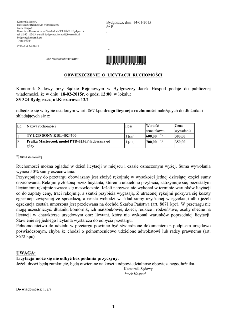 Komornik Sądowy przy Sądzie Rejonowym w Bydgoszczy Jacek Hospod Kancelaria Komornicza ul.Śniadeckich 9/3, 85-011 Bydgoszcz tel. 52-321-22-53 e-mail: [email protected] bydgoszczkomornik.eu Kms 160/14 sygn. XVI K 531/14 Bydgoszcz, dnia 14-01-2015 Sz P . #BP *0010000078249*/0419/ *0010000078249* OBWIESZCZENIE O LICYTACJI RUCHOMOŚCI Komornik Sądowy przy Sądzie Rejonowym w Bydgoszczy Jacek Hospod podaje do publicznej wiadomości, że w dniu 18-02-2015r. o godz. 12:00 w lokalu: 85-324 Bydgoszcz, ul.Koszarowa 12/1 odbędzie się w trybie ustalonym w art. 867 kpc druga licytacja ruchomości należących do dłużnika i składających się z: Lp. Nazwa ruchomości Ilość 1 2 TV LCD SONY KDL-4024500 Pralka Mastercook model PTD-3236P ładowana od góry 1 [szt.] 1 [szt.] Wartość szacunkowa 600,00 *) 700,00 *) Cena wywołania 300,00 350,00 *) cena za sztukę Ruchomości można oglądać w dzień licytacji w miejscu i czasie oznaczonym wyżej. Suma wywołania wynosi 50% sumy oszacowania. Przystępujący do przetargu obowiązany jest złożyć rękojmię w wysokości jednej dziesiątej części sumy oszacowania. Rękojmię złożoną przez licytanta, któremu udzielono przybicia, zatrzymuje się; pozostałym licytantom rękojmię zwraca się niezwłocznie. Jeżeli nabywca nie wykonał w terminie warunków licytacji co do zapłaty ceny, traci rękojmię, a skutki przybicia wygasają. Z utraconej rękojmi pokrywa się koszty egzekucji związanej ze sprzedażą, a reszta wchodzi w skład sumy uzyskanej w egzekucji albo jeżeli egzekucja została umorzona jest przelewana na dochód Skarbu Państwa (art. 8671 kpc). W przetargu nie mogą uczestniczyć: dłużnik, komornik, ich małżonkowie, dzieci, rodzice i rodzeństwo, osoby obecne na licytacji w charakterze urzędowym oraz licytant, który nie wykonał warunków poprzedniej licytacji. Stawienie się jednego licytanta wystarcza do odbycia przetargu. Pełnomocnictwo do udziału w przetargu powinno być stwierdzone dokumentem z podpisem urzędowo poświadczonym, chyba że chodzi o pełnomocnictwo udzielone adwokatowi lub radcy prawnemu (art. 8672 kpc) UWAGA: Licytacja może się nie odbyć bez podania przyczyny. Jeżeli drzwi będą zamknięte, będą otwierane na koszt i odpowiedzialność obowiązanegodłużnika. Komornik Sądowy Jacek Hospod Do wiadomości: 1. a/a 1