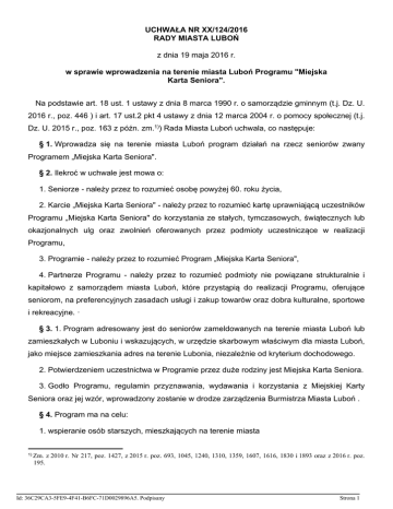 UCHWAŁA NR XX/124/2016 RADY MIASTA LUBOŃ z dnia 19 maja 2016 r. w sprawie wprowadzenia na terenie miasta Luboń Programu "Miejska Karta Seniora". Na podstawie art. 18 ust. 1 ustawy z dnia 8 marca 1990 r. o samorządzie gminnym (t.j. Dz. U. 2016 r., poz. 446 ) i art. 17 ust.2 pkt 4 ustawy z dnia 12 marca 2004 r. o pomocy społecznej (t.j. Dz. U. 2015 r., poz. 163 z późn. zm.1)) Rada Miasta Luboń uchwala, co następuje: § 1. Wprowadza się na terenie miasta Luboń program działań na rzecz seniorów zwany Programem „Miejska Karta Seniora". § 2. Ilekroć w uchwale jest mowa o: 1. Seniorze - należy przez to rozumieć osobę powyżej 60. roku życia, 2. Karcie „Miejska Karta Seniora" - należy przez to rozumieć kartę uprawniającą uczestników Programu „Miejska Karta Seniora" do korzystania ze stałych, tymczasowych, świątecznych lub okazjonalnych ulg oraz zwolnień oferowanych przez podmioty uczestniczące w realizacji Programu, 3. Programie - należy przez to rozumieć Program „Miejska Karta Seniora", 4. Partnerze Programu - należy przez to rozumieć podmioty nie powiązane strukturalnie i kapitałowo z samorządem miasta Luboń, które przystąpią do realizacji Programu, oferujące seniorom, na preferencyjnych zasadach usługi i zakup towarów oraz dobra kulturalne, sportowe i rekreacyjne. · § 3. 1. Program adresowany jest do seniorów zameldowanych na terenie miasta Luboń lub zamieszkałych w Luboniu i wskazujących, w urzędzie skarbowym właściwym dla miasta Luboń, jako miejsce zamieszkania adres na terenie Lubonia, niezależnie od kryterium dochodowego. 2. Potwierdzeniem uczestnictwa w Programie przez duże rodziny jest Miejska Karta Seniora. 3. Godło Programu, regulamin przyznawania, wydawania i korzystania z Miejskiej Karty Seniora oraz jej wzór, wprowadzony zostanie w drodze zarządzenia Burmistrza Miasta Luboń . § 4. Program ma na celu: 1. wspieranie osób starszych, mieszkających na terenie miasta 1) Zm. z 2010 r. Nr 217, poz. 1427, z 2015 r. poz. 693, 1045, 1240, 1310, 1359, 1607, 1616, 1830 i 1893 oraz z 2016 r. poz. 195. Id: 36C29CA3-5FE9-4F41-B6FC-71D0029896A5. Podpisany Strona 1 2. ułatwienie seniorom dostępu do rekreacji, sportu, kultury oraz innych usług, tym samym poprawę warunków ich życia. § 5. Cele Programu, o których mowa w § 4 niniejszej uchwały będę realizowane poprzez: 1. udostępnianie seniorom na preferencyjnych zasadach usług miejskich instytucji kultury, sportu i rekreacji, · 2. promocję i koordynację systemu ulg przyznawanych przez Partnerów Programu •. 3. uwzględnianie programach i wartości inicjatywach oraz potrzeb podejmowanych seniorów przez w dokumentach samorząd miasta strategicznych, Luboń, w tym podejmowanych we współpracy z organizacjami poza rządowymi, instytucjami i pracodawcami, 4. współpracę ze szkołami i innymi placówkami oświatowymi w realizacji promocji wsparcia seniorów 5. rozwój aktywności społecznej seniorów § 6. Realizatorami Programu są: - Miasto Luboń, - Partnerzy Programu. § 7. Instrumentami umożliwiającymi realizację celów, o których mowa w § 4 niniejszej uchwały będzie zapewnienie seniorom ulg polegających na umożliwieniu zakupu na preferencyjnych zasadach m.in. biletów wstępu na płatne imprezy kulturalne i sportowe organizowane przez instytucje miejskie oraz usług i towarów oferowanych przez Partnerów Programu. § 8. 1. Przystąpienie do realizacji Programu i uzyskanie statusu Partnera Programu następuje na podstawie deklaracji złożonej przez dany podmiot oraz porozumienia podpisanego z miastem Luboń . 2. Wzór deklaracji oraz porozumienia zostanie wprowadzony w drodze zarządzenia Burmistrza Miasta Luboń . 3. Partner Programu będzie uprawniony do korzystania z godła Programu. 4. Lista Partnerów Programu zostanie umieszczona na stronie internetowej Urzędu Miasta Luboń. § 9. Promocja działań określonych w niniejszej uchwale będzie obejmować rozpropagowanie idei Programu w mediach oraz na stronie internetowej Urzędu Miasta Luboń. Id: 36C29CA3-5FE9-4F41-B6FC-71D0029896A5. Podpisany Strona 2 § 10. Wykonanie uchwały powierza się Burmistrzowi Miasta Luboń. § 11. Uchwała wchodzi w życie z dniem 1 stycznia 2017r. Id: 36C29CA3-5FE9-4F41-B6FC-71D0029896A5. Podpisany Strona 3 Uzasadnienie Władze samorządowe miasta Luboń dostrzegają potrzebę aktywizacji społecznej, sportowej i kulturalnej seniorów. Podjęte do tej pory kroki (utworzenie uniwersytetu IlI wieku, domu "Senior - Wigor" czy Miejskiej Rady Seniora) są przejawem tego typu aktywności. Rada Miasta widząc potrzebę kontynuowania tych działań tworzy program "Miejska Karta Seniora", który na wzór programu "Duża Rodzina" ma wspierać aktywność seniorów w naszym mieście. Id: 36C29CA3-5FE9-4F41-B6FC-71D0029896A5. Podpisany Strona 1