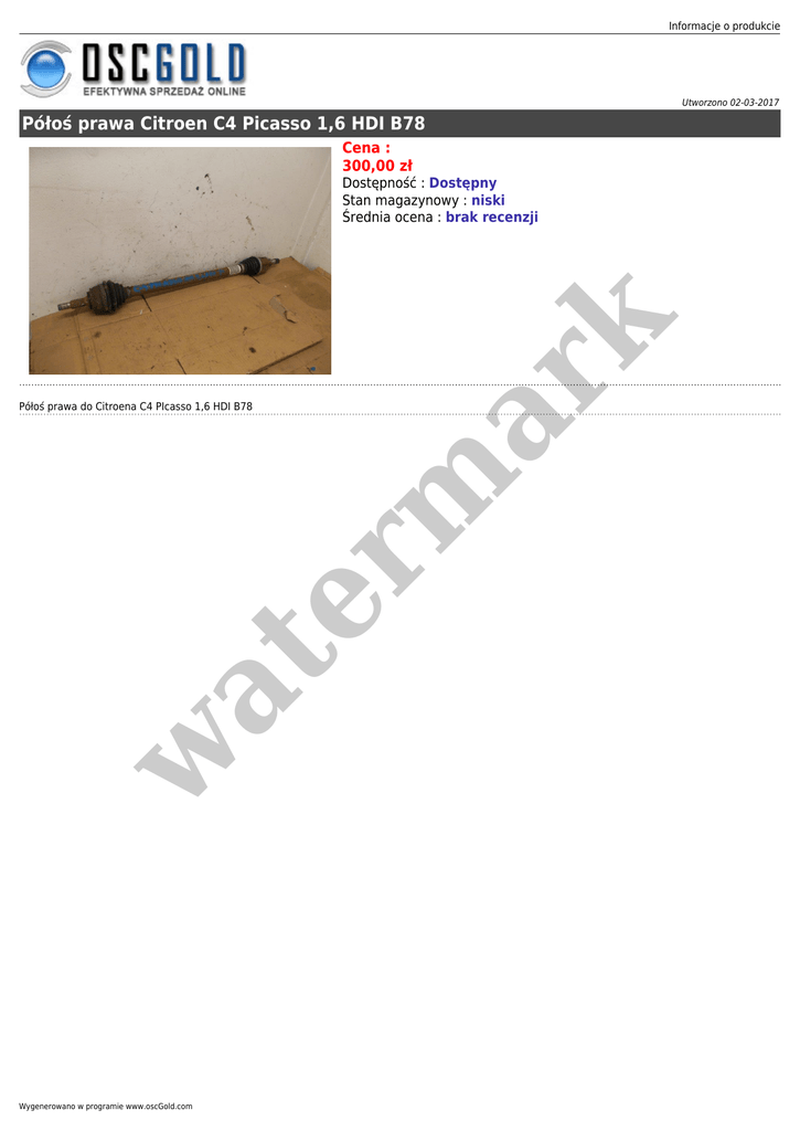 Informacje o produkcie Utworzono 02-03-2017 Półoś prawa Citroen C4 Picasso 1,6 HDI B78 Cena : 300,00 zł er m ar k Dostępność : Dostępny Stan magazynowy : niski Średnia ocena : brak recenzji w at Półoś prawa do Citroena C4 PIcasso 1,6 HDI B78 Wygenerowano w programie www.oscGold.com