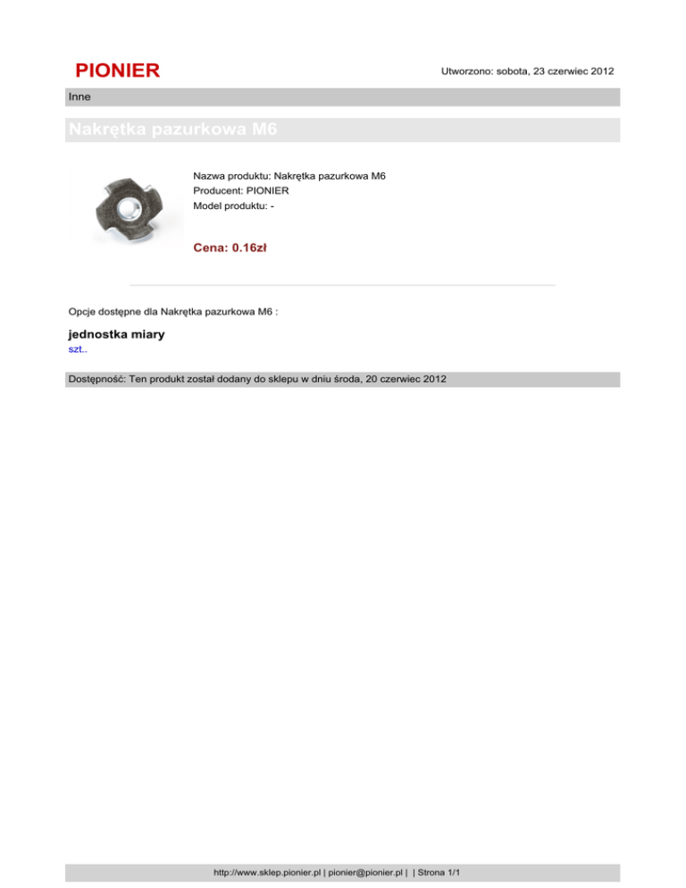 PIONIER Utworzono: sobota, 23 czerwiec 2012 Inne Nakrętka pazurkowa M6 Nazwa produktu: Nakrętka pazurkowa M6 Producent: PIONIER Model produktu: - Cena: 0.16zł Opcje dostępne dla Nakrętka pazurkowa M6 : jednostka miary szt.. Dostępność: Ten produkt został dodany do sklepu w dniu środa, 20 czerwiec 2012 http://www.sklep.pionier.pl | [email protected] | | Strona 1/1