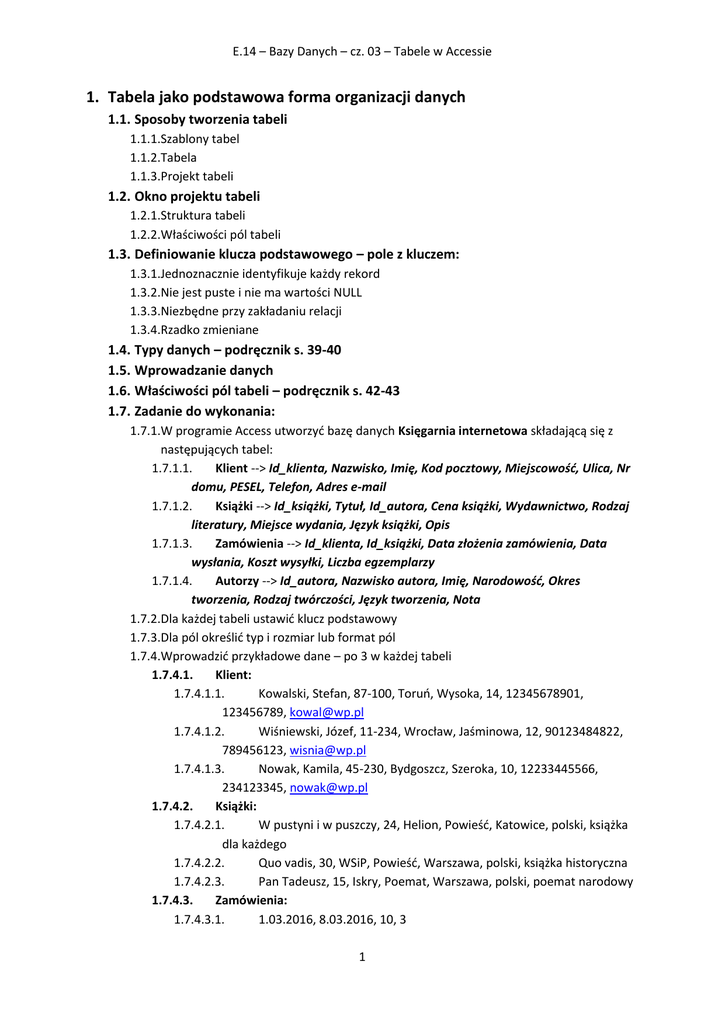 E.14 – Bazy Danych – cz. 03 – Tabele w Accessie 1. Tabela jako podstawowa forma organizacji danych 1.1. Sposoby tworzenia tabeli 1.1.1.Szablony tabel 1.1.2.Tabela 1.1.3.Projekt tabeli 1.2. Okno projektu tabeli 1.2.1.Struktura tabeli 1.2.2.Właściwości pól tabeli 1.3. Definiowanie klucza podstawowego – pole z kluczem: 1.3.1.Jednoznacznie identyfikuje każdy rekord 1.3.2.Nie jest puste i nie ma wartości NULL 1.3.3.Niezbędne przy zakładaniu relacji 1.3.4.Rzadko zmieniane 1.4. Typy danych – podręcznik s. 39-40 1.5. Wprowadzanie danych 1.6. Właściwości pól tabeli – podręcznik s. 42-43 1.7. Zadanie do wykonania: 1.7.1.W programie Access utworzyć bazę danych Księgarnia internetowa składającą się z następujących tabel: 1.7.1.1. Klient --> Id_klienta, Nazwisko, Imię, Kod pocztowy, Miejscowość, Ulica, Nr domu, PESEL, Telefon, Adres e-mail 1.7.1.2. Książki --> Id_książki, Tytuł, Id_autora, Cena książki, Wydawnictwo, Rodzaj literatury, Miejsce wydania, Język książki, Opis 1.7.1.3. Zamówienia --> Id_klienta, Id_książki, Data złożenia zamówienia, Data wysłania, Koszt wysyłki, Liczba egzemplarzy 1.7.1.4. Autorzy --> Id_autora, Nazwisko autora, Imię, Narodowość, Okres tworzenia, Rodzaj twórczości, Język tworzenia, Nota 1.7.2.Dla każdej tabeli ustawić klucz podstawowy 1.7.3.Dla pól określić typ i rozmiar lub format pól 1.7.4.Wprowadzić przykładowe dane – po 3 w każdej tabeli 1.7.4.1. Klient: 1.7.4.1.1. Kowalski, Stefan, 87-100, Toruń, Wysoka, 14, 12345678901, 123456789, [email protected] 1.7.4.1.2. Wiśniewski, Józef, 11-234, Wrocław, Jaśminowa, 12, 90123484822, 789456123, [email protected] 1.7.4.1.3. Nowak, Kamila, 45-230, Bydgoszcz, Szeroka, 10, 12233445566, 234123345, [email protected] 1.7.4.2. Książki: 1.7.4.2.1. W pustyni i w puszczy, 24, Helion, Powieść, Katowice, polski, książka dla każdego 1.7.4.2.2. Quo vadis, 30, WSiP, Powieść, Warszawa, polski, książka historyczna 1.7.4.2.3. Pan Tadeusz, 15, Iskry, Poemat, Warszawa, polski, poemat narodowy 1.7.4.3. Zamówienia: 1.7.4.3.1. 1.03.2016, 8.03.2016, 10, 3 1 E.14 – Bazy Danych – cz. 03 – Tabele w Accessie 1.7.4.3.2. 2.03.2016, 9.03.2016, 10, 1 1.7.4.3.3. 2.03.2016, 9.03.2016, 9, 2 1.7.4.4. Autorzy: 1.7.4.4.1. Sienkiewicz, Henryk, polska, 1880 – 1920, proza, polski, nagroda Nobla 1.7.4.4.2. Mickiewicz, Adam, polska, 1820 – 1850, poezja, polski, wieszcz narodowy 1.7.4.4.3. Słowacki, Juliusz, polska, 1830 – 1860, poezja, polski, wieszcz narodowy 1.8. Import i eksport danych 1.8.1.Wyeksportować tabelę Autorzy do pliku autorzy.txt – dopisać do niego dwóch kolejnych autorów, stosując odpowiednie formatowanie, jak w pliku i zaimportować do bazy danych 1.8.2.Zaimportować plik uczniowie.xls do bazy danych 1.9. Zasady tworzenia relacji między tabelami 1.9.1.Relacje: 1.9.1.1. Pomagają w projektowaniu kwerend z wielu tabel 1.9.1.2. Pomagają w projektowaniu formularzy i raportów z wielu tabel 1.9.1.3. Zapobiegają powstawaniu rekordów odłączonych 1.9.2.Warunki relacji: 1.9.2.1. Pola wspólne muszą mieć ten sam typ danych (Autonumerowanie – Liczba o takim samym rozmiarze pola) 1.9.2.2. Pole wspólne w tabeli ze strony jeden musi być polem klucza podstawowego 1.9.2.3. Pola łączone muszą zawierać informacje wzajemnie sobie odpowiadające 1.9.2.4. Pola wspólne nie muszą mieć tych samych nazw (choć często mają) 1.9.3.Relacja jeden do wielu 1.9.3.1. Narzędzia bazy danych 1.9.3.1.1. Przycisk Relacje 1.9.3.1.2. Pokaż Tabele i Dodaj 1.9.3.2. Wymuszaj więzy integralności 1.9.3.3. Ukrycie tabel nie usuwa relacji 1.10. 1.10.1. 1.10.2. 1.10.3. 1.10.4. 1.11. Dodanie tabeli z odnośnikami Utworzyć nową tabelę: Rodzaje --> Id_rodzaju, Rodzaj Wpisać trzy rodzaje: Poezja, Proza, Dramat W tabeli Autorzy w polu Rodzaj twórczości wybrać Kreator odnośników… I kierować się kreatorem Reguły integralności bazy danych 1.11.1. Trzy reguły – s.46 1.12. Sprawdzanie poprawności danych 1.12.1. Wartość domyślna 1.12.1.1. W tabeli Zamówienia dla pola Data złożenia zamówienia ustawić datę bieżącą we właściwości Wartość domyślna: Date() 1.12.1.2. W tabeli Książki dla pola Język książki ustawić wartość domyślną na polski 1.12.2. Maska wprowadzania 1.12.2.1. Informacje na temat masek wprowadzania – s. 48-49 2 E.14 – Bazy Danych – cz. 03 – Tabele w Accessie 1.12.2.2. W tabeli Klient 1.12.2.2.1. Dla pól Nazwisko i Imię wymusić wstawianie wielkiej litery na początku tekstu, pozostałe powinny być małe 1.12.2.2.1.1. Tekst 25 znaków, Maska wprowadzania: >L<L??????????????????????? i Imię Tekst 15 znaków, Maska wprowadzania: >L<L????????????? 1.12.2.2.2. Dla pól Nr domu zezwolić na wpisywanie liter i cyfr 1.12.2.2.2.1. Tekst 5 znaków, Maska wprowadzania: aaaaa 1.12.2.2.3. Dla pola PESEL zezwolić na wpisywanie cyfr 1.12.2.2.3.1. Tekst 11 znaków, Maska wprowadzania: 00000000000 1.12.2.2.4. Dla pola Telefon wpisywać według wzoru (56)1234567 1.12.2.2.4.1. Tekst 11 znaków, Maska wprowadzania: \(00”) ”0000000 1.12.2.2.5. Dla pola Kod pocztowy zezwolić na wpisywanie według wzoru 87-100 1.12.2.2.5.1. Tekst 6 znaków, Maska wprowadzania: 00-000 1.12.3. Reguły poprawności: 1.12.3.1. Reguła poprawności dla pola – dotyczy sprawdzania wartości wpisywanej do pola – przy opuszczaniu pola 1.12.3.1.1. W tabeli Klient dla pola Miejscowość wprowadzić Regułę spr poprawności: ”Warszawa” Or ”Gdańsk” Or ”Toruń” 1.12.3.2. Reguła poprawności rekordu – porównuje różne pola tej samej tabeli i sprawdza czy warunek został spełniony – ustawia się ją we właściwościach tabeli – Arkusz właściwości 1.12.3.2.1. W tabeli Zamówienia w widoku projektu otworzyć Arkusz właściwości, kliknąć wielokropek przy Regule spr poprawności i za pomocą Kreatora wyrażeń napisać regułę: [Data wysłania] = [Data złożenia zamówienia] + 7 2. Podsumowanie: 2.1. Baza danych Księgarnia in