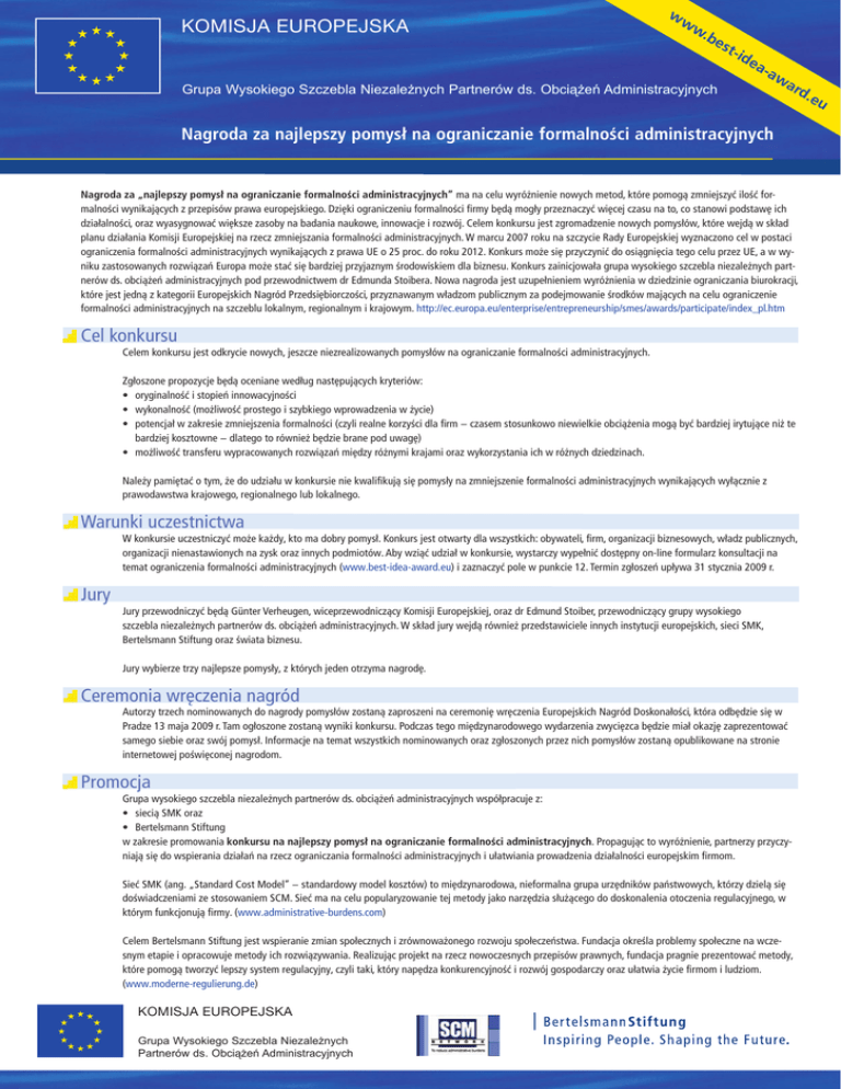 Komisja COMMISSION Europejska EUROPEAN ww w. be st- ide a-a Grupa Wysokiego Szczebla Niezależnych Partnerów ds. Obciążeń Administracyjnych wa rd .e Nagroda za najlepszy pomysł na ograniczanie formalności administracyjnych Nagroda za „najlepszy pomysł na ograniczanie formalności administracyjnych” ma na celu wyróżnienie nowych metod, które pomogą zmniejszyć ilość formalności wynikających z przepisów prawa europejskiego. Dzięki ograniczeniu formalności firmy będą mogły przeznaczyć więcej czasu na to, co stanowi podstawę ich działalności, oraz wyasygnować większe zasoby na badania naukowe, innowacje i rozwój. Celem konkursu jest zgromadzenie nowych pomysłów, które wejdą w skład planu działania Komisji Europejskiej na rzecz zmniejszania formalności administracyjnych. W marcu 2007 roku na szczycie Rady Europejskiej wyznaczono cel w postaci ograniczenia formalności administracyjnych wynikających z prawa UE o 25 proc. do roku 2012. Konkurs może się przyczynić do osiągnięcia tego celu przez UE, a w wyniku zastosowanych rozwiązań Europa może stać się bardziej przyjaznym środowiskiem dla biznesu. Konkurs zainicjowała grupa wysokiego szczebla niezależnych partnerów ds. obciążeń administracyjnych pod przewodnictwem dr Edmunda Stoibera. Nowa nagroda jest uzupełnieniem wyróżnienia w dziedzinie ograniczania biurokracji, które jest jedną z kategorii Europejskich Nagród Przedsiębiorczości, przyznawanym władzom publicznym za podejmowanie środków mających na celu ograniczenie formalności administracyjnych na szczeblu lokalnym, regionalnym i krajowym. http://ec.europa.eu/enterprise/entrepreneurship/smes/awards/participate/index_pl.htm Cel konkursu Celem konkursu jest odkrycie nowych, jeszcze niezrealizowanych pomysłów na ograniczanie formalności administracyjnych. Zgłoszone propozycje będą oceniane według następujących kryteriów: • oryginalność i stopień innowacyjności • wykonalność (możliwość prostego i szybkiego wprowadzenia w życie) • potencjał w zakresie zmniejszenia formalności (czyli realne korzyści dla firm − czasem stosunkowo niewielkie obciążenia mogą być bardziej irytujące niż te bardziej kosztowne − dlatego to również będzie brane pod uwagę) • możliwość transferu wypracowanych rozwiązań między różnymi krajami oraz wykorzystania ich w różnych dziedzinach. Należy pamiętać o tym, że do udziału w konkursie nie kwalifikują się pomysły na zmniejszenie formalności administracyjnych wynikających wyłącznie z prawodawstwa krajowego, regionalnego lub lokalnego. Warunki uczestnictwa W konkursie uczestniczyć może każdy, kto ma dobry pomysł. Konkurs jest otwarty dla wszystkich: obywateli, firm, organizacji biznesowych, władz publicznych, organizacji nienastawionych na zysk oraz innych podmiotów. Aby wziąć udział w konkursie, wystarczy wypełnić dostępny on-line formularz konsultacji na temat ograniczenia formalności administracyjnych (www.best-idea-award.eu) i zaznaczyć pole w punkcie 12. Termin zgłoszeń upływa 31 stycznia 2009 r. Jury Jury przewodniczyć będą Günter Verheugen, wiceprzewodniczący Komisji Europejskiej, oraz dr Edmund Stoiber, przewodniczący grupy wysokiego szczebla niezależnych partnerów ds. obciążeń administracyjnych. W skład jury wejdą również przedstawiciele innych instytucji europejskich, sieci SMK, Bertelsmann Stiftung oraz świata biznesu. Jury wybierze trzy najlepsze pomysły, z których jeden otrzyma nagrodę. Ceremonia wręczenia nagród Autorzy trzech nominowanych do nagrody pomysłów zostaną zaproszeni na ceremonię wręczenia Europejskich Nagród Doskonałości, która odbędzie się w Pradze 13 maja 2009 r. Tam ogłoszone zostaną wyniki konkursu. Podczas tego międzynarodowego wydarzenia zwycięzca będzie miał okazję zaprezentować samego siebie oraz swój pomysł. Informacje na temat wszystkich nominowanych oraz zgłoszonych przez nich pomysłów zostaną opublikowane na stronie internetowej poświęconej nagrodom. Promocja Grupa wysokiego szczebla niezależnych partnerów ds. obciążeń administracyjnych współpracuje z: • siecią SMK oraz • Bertelsmann Stiftung w zakresie promowania konkursu na najlepszy pomysł na ograniczanie formalności administracyjnych. Propagując to wyróżnienie, partnerzy przyczyniają się do wspierania działań na rzecz ograniczania formalności administracyjnych i ułatwiania prowadzenia działalności europejskim firmom. Sieć SMK (ang. „Standard Cost Model” − standardowy model kosztów) to międzynarodowa, nieformalna grupa urzędników państwowych, którzy dzielą się doświadczeniami ze stosowaniem SCM. Sieć ma na celu popularyzowanie tej metody jako narzędzia służącego do doskonalenia otoczenia regulacyjnego, w którym funkcjonują firmy. (www.administrative-burdens.com) Celem Bertelsmann Stiftung jest wspieranie zmian społecznych i zrównoważonego rozwoju społeczeństwa. Fundacja określa problemy społeczne na wczesnym etapie i opracowuje metody ich rozwiązywania. Realizując projekt na rzecz nowoczesnych przepisów prawnych, fundacja pragnie prezentować metody, które pomogą tworzyć lepszy system regulacyjny, czyli taki, który napędza konkurencyjność i rozwój gospodarczy oraz ułatwia życie firmom i ludziom. (www.moderne-regulierung.de) Komisja Europejska EUROPEAN COMMISSION Grupa Wysokiego Szczebla Niezależnych Partnerów ds. Obciążeń Administracyjnych u