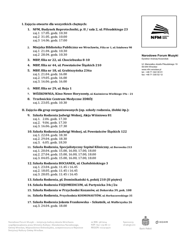 I. Zajęcia otwarte dla wszystkich chętnych: 1. NFM, Budynek Reprotechniki, p. II / sala 2, ul. Piłsudskiego 23 zaj.1 17.05. godz. 10.30 zaj.2 31.05. godz. 10.00 zaj.3 14.06. godz. 17.00 2. Miejska Biblioteka Publiczna we Wrocławiu, Filia nr 1, ul. Sztabowa 98 zaj.1 21.04. godz. 10.30 zaj.2 28.04. godz. 10.30 Narodowe Forum Muzyki 3. MBP, filia nr 22, ul. Chociebuska 8-10 Dyrektor Andrzej Kosendiak 4. MBP, filia nr 44, ul. Powstańców Śląskich 210 Ul .Marszałka Józefa Piłsudskiego 19 50-044 Wrocław www.nfm.wrocław.pl tel.: +48 71 342 30 01 fax: +48 71 330 52 12 5. MBP, filia nr 18, ul. Grabiszyńska 236a zaj.1. 21.04. godz. 16.00 zaj.2. 19.05. godz. 16.00 zaj.3. 16.06. godz. 16.00 6. MBP, filia nr 29, ul. Reja 1 7. WÓZKOWNIA, Kino Nowe Horyzonty, ul. Kazimierza Wielkiego 19a – 21 8. Trzebnickie Centrum Medyczne ZDRÓJ zaj.1. 23.05. godz. 10.30 II. Zajęcia dla grup zorganizowanych (np. szkoły rodzenia, żłobki itp.): 9. Szkoła Rodzenia Jadwigi Wolnej, Aleja Wiśniowa 81 zaj.1. 2.06. godz. 17.30 zaj.2. 9.06. godz. 17.30 zaj.3. 16.06. godz. 17.30 10. Szkoła Rodzenia Jadwigi Wolnej, ul. Powstańców Śląskich 122 zaj.1. 22.04. godz. 18.30 zaj.2. 29.04. godz. 18.30 zaj.3. 6.05. godz. 18.30 11. Szkoła Rodzenia, Specjalistyczny Szpital Kliniczny, ul. Borowska 213 zaj.1. 20.04. godz. 15.00, 16.00, 17.00, 18.00 zaj.2. 27.04. godz. 15.00, 16.00, 17.00, 18.00 zaj.3. 04.05. godz. 15.00, 16.00, 17.00, 18.00 12. Szkoła Rodzenia BOCIANEK, ul. Chałubińskiego 3 zaj.1. 23.04. godz. 11.45 i 16.45 zaj.2. 18.05. godz. 11.45 i 16.45 zaj.3. 28.05. godz. 11.45 i 16.45 13. Szkoła Rodzenia, pl. Dominikański 6, pokój 210 (II piętro) 14. Szkoła Rodzenia FIZJOMEDICUM, ul. Partynicka 34c/2u 15. Szkoła Rodzenia w Przychodni Kozanów, ul. Dokerska 39, pok. 108 16. Szkoła Rodzenia, Przychodnia KOSMONAUTÓW, ul. Horbaczewskiego 35 17. Szkoła Rodzenia Jolanta Frankowska – Szkutnik, ul. Wałbrzyska 26 zaj.3. 24.04. godz. 18.00 18. Szkoła Rodzenia Kraina Douli, ul. Kamiennogórska 10 19. Szkoła Rodzenia Luxmed, ul. Swobodna 1 20. Wrocławska Szkoła Rodzenia, ul. Kamieńskiego 71 zaj.1. 8.04. godz. 17.30 zaj.2. 13.04. godz. 17.30 zaj.3. 27.04. godz. 17.30 zaj.1. 30.04. godz. 18.00 zaj.2. 5.05. godz. 17.30 zaj.3. 7.05. godz. 17.30 21. Wrocławska Szkoła Rodzenia, Szpital im. A. Falkiewicza, ul. Warszawska 22. Szkoła noszenia PRZYWIĄZANIE, ul Wejherowska 28 23. Szkoła rodzenia, Klub Mam, Fundacja Evangelium Vitae, ul. Rydygiera 22-28 zaj.1. 22.04 godz. 13.00 zaj.2. 20.05. godz. 13.00 24. Przedszkole, Fundacja EUROPEUM, ul. Rakowiecka 45 zaj.1. 9.04. godz. 16.15 zaj.2. 16.04. godz. 16.15 zaj.3. 23.04. godz. 16.15 25. Przedszkole 58, grupa V Ekoludki, ul. Szkocka 64B 26. Przedszkole Promyk Słońca, ul. Swobodna 8a zaj.1. 16.04. godz. 16.00 zaj.2. 7.07. godz. 16.00 zaj.1. 29.04. godz. 16.00 zaj.2. 13.07. godz. 16.00 27. Przedszkole Alto, ul. Poleska 11-15/8a zaj.1. 10.04. godz. 16.00 zaj.2. 24.04. godz. 16.00 28. Przedszkole PLUSZOWY MIŚ, ul. Kolista 24 zaj.1. 13.03. godz. 17.00 zaj.2. terminy w trakcie ustaleń zaj.3. terminy w trakcie ustaleń 29. Klub CO-MAMY, Plac św. Macieja 5 zaj.1. 10.04 godz. 11.00 zaj.2. 17.04. godz. 11.00 zaj.3. 24.04. godz. 11.00 30. Koło Korczaka, Uniwersytecki Szpital, ul. Borowska 213 Zajęcia odbywają się w każdą środę o godz. 16.30 31. Klinika Transplantacji Szpiku, Onkologii i Hematologii Dziecięcej, ul. Bujwida 44 Zajęcia odbywają się w każdy czwartek o godz. 15.15 32. Hufiec ZHP, plac Św. Macieja 5a zaj.2. 24.04. godz. 16.30 33. WSS, ul. Kamieńskiego 73a, Oddz. Ginekologii i Położnictwa Zajęcia odbywają się w każdy wtorek i czwartek o godz. 15.30 34. Żłobek, ul. Brylantowa 33 zaj.1. 12.03. godz. 15.00 zaj.2. terminy w trakcie ustaleń zaj.3. terminy w trakcie ustaleń Strona 2 z 4 35. Żłobek, ul. Agatowa 38 zaj.1. 12.03. godz. 15.45 zaj.2. terminy w trakcie ustaleń zaj.3. terminy w trakcie ustaleń 36. Żłobek Tęczowa Akademia, ul. Tęczowa 3a zaj.1. 16.03. godz. 9.30 zaj.2. terminy w trakcie ustaleń 37. Żłobek, ul. Czaplińskiego 5 zaj.2. terminy w trakcie ustaleń zaj.3. terminy w trakcie ustaleń 38. Żłobek Promyk Słońca, ul. Manganowa 10 zaj.1. 14.05. godz. 15.45 Tutaj już śpiewaliśmy i jeszcze zaśpiewamy 1. BAJKOWA DOLINA, ul. Petrażyckiego 25 2. CZEKOLADZIARNIA, ul. Połaniecka 17 3. Centrum Rozwoju Dziecka BEREK, ul. B. Prusa 9 4. Centrum Twórczego Rozwoju Dziecka KRAINA WYOBRAŹNI, ul. Lądecka 7 5. HUMANITARIUM, ul. Stabłowicka 147 6. Klub GNIAZDKO, ul. Plac Staszica 22 7. Klub Maluszka TĘCZA, ul. Ślężna 161 8. Klub dla Dzieci i Rodziców Ha!mak, ul. Zwycięska 25 9. Klub dziecięcy przy Politechnice Wrocławskiej M-SZKRAB, ul. Górnickiego 22 10. Wrocławskie Centrum Twórczości Dziecka, ul. Kuźnicza 29a 11. MBP Filia nr 4, ul. Wieczysta 105 12. MOPS, ul. Rydygiera 43 13. Klub Maluszka TĘCZA, ul. Brossa 2 14. Klinika Ginekologii, UL. Dyrekcyjna 5/7 15. Przedszkole "Kajtuś", ul. Ukraińska 8 16. Przedszkole nr 11, ul. Stanisławowska 38/44 17. Przedszkole „Przyjaciele Żyrafy”, ul. Budziszyńska 37/1a 18. Przedszkole 58, grupa VI, ul. Strzegomska 322 19. Punkt Przedszkolny NOWA SZANSA, ul. Bukowa 20, Święta Katarzyna 20. Szkoła Rodzenia, CM LUX MED, pl. Dominikański 3 21. Szkoła Rodzenia LEK TANS, ul. Wałbrzyska 26 22. Szkoła Rodzenia, Przychodnia Stabłowice, ul. Stabłowicka 125 23. Szkoła Rodzenia BABY VITA, ul. Zelwerowicza 4 24. Szkoła Rodzenia KOBIETA I NATURA, ul. Borowska 242 25. Szkoła Rodzenia SAGE-FEMME, ul. Boya-Żeleńskiego 40/42 26. Szkoła Rodzenia PROMYK SŁOŃCA, ul. Swobodna 8a 27. Szkoła Rodzenia, pl. Dominikański 6 28. Szkoła Rodzenia, ul. Powstańców Śląskich 122 29. Szkoła Rodzenia, ul. Pułaskiego 26a 30. Szkoła Rodzenia MAMA I JA, ul. Rajska 71 31. Uniwersytecki Szpital Kliniczny, ul. Borowska 213 32. URWISEK, ul. Wejherowska 28 33. ZABAWIANKI, ul. Ołtaszyńska 27/1 34. Żłobek KAJTUŚ, ul. Ukraińska 8 35. Żłobek nr 14 ZACZAROWANA KRAINA, ul. 