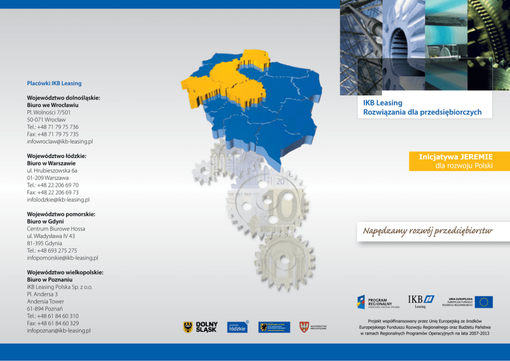 Placówki IKB Leasing Województwo dolnośląskie: Biuro we Wrocławiu Pl. Wolności 7/501 50-071 Wrocław Tel.: +48 71 79 75 736 Fax: +48 71 79 75 735 [email protected] Województwo łódzkie: Biuro w Warszawie ul. Hrubieszowska 6a 01-209 Warszawa Tel.: +48 22 206 69 70 Fax: +48 22 206 69 73 [email protected] Województwo pomorskie: Biuro w Gdyni Centrum Biurowe Hossa ul. Władysława IV 43 81-395 Gdynia Tel.: +48 693 275 275 [email protected] Województwo wielkopolskie: Biuro w Poznaniu IKB Leasing Polska Sp. z o.o. Pl. Andersa 3 Andersia Tower 61-894 Poznań Tel.: +48 61 84 60 310 Fax: +48 61 84 60 329 [email protected] IKB Leasing Rozwiązania dla przedsiębiorczych Inicjatywa JEREMIE dla rozwoju Polski Napędzamy rozwój przedsiębiorstw Projekt współfinansowany przez Unię Europejską ze środków Europejskiego Funduszu Rozwoju Regionalnego oraz Budżetu Państwa w ramach Regionalnych Programów Operacyjnych na lata 2007-2013 Inicjatywa JEREMIE - informacje ogólne Inicjatywa JEREMIE (Joint European Resources for Micro-to-Medium Enterprises - wspólne europejskie zasoby dla MŚP) to wspólna inicjatywa Dyrekcji Generalnej ds. Polityki Regionalnej oraz Europejskiego Funduszu Inwestycyjnego (EFI), z udziałem Europejskiego Banku Inwestycyjnego (EBI) w ramach Grupy EBI. Celem projektu JEREMIE jest pozadotacyjne wsparcie mikro, małych i średnich przedsiębiorstw nastawione na finansowanie inwestycji o zwiększonym ryzyku kredytowania oraz elastyczne podejście do indywidualnych potrzeb. Beneficjentami inicjatywy są między innymi przedsiębiorstwa znajdujące się w początkowej fazie rozwoju, które ze względu na brak historii kredytowej, czy niewystarczającą ilość zabezpieczeń mają problemy z uzyskaniem wsparcia finansowego. IKB Leasing Polska Sp. z o. o. – działania w ramach Inicjatywy Jeremie Inicjatywa Jeremie realizowana jest przez IKB Leasing Polska w ramach Regionalnych Programów Operacyjnych 4 województw: • dolnośląskiego • łódzkiego • pomorskiego • wielkopolskiego IKB Leasing Polska Sp. z o. o. – informacje ogólne IKB Leasing Polska jest dynamicznie rozwijającym się towarzystwem leasingowym, działającym na polskim rynku od ponad 12 lat. Wchodzimy w skład grupy IKB Leasing GmbH, dzięki czemu korzystamy z doświadczeń koncernu o 40-letniej tradycji w finansowaniu przedsiębiorstw. Specjalizujemy się w finansowaniu inwestycji w maszyny i urządzenia produkcyjne oraz aparaturę medyczną. Według danych publikowanych przez Związek Polskiego Leasingu jesteśmy liderem na rynku w finansowaniu maszyn i urządzeń przemysłowych z sektora poligraficznego, maszyn do obróbki metali i przetwórstwa tworzyw sztucznych oraz wózków widłowych. Budujemy długotrwałe relacje z klientami i wspieramy ich rozwój. Dlatego podjęliśmy decyzję o wdrażaniu Inicjatywy Jeremie, która wspiera przedsiębiorców oraz pomaga między innymi tym firmom, które dopiero rozpoczynają swoją działalność. www.jeremie.com.pl Łączna kwota, jaką dysponujemy w ramach Inicjatywy Jeremie dla przedsiębiorców to 54 mln zł. Udzielamy wsparcia finansowego w formie pożyczek na preferencyjnych warunkach na cele inwestycyjne (zakup maszyn i urządzeń, wyposażenia i innych ruchomości) dla przedsiębiorstw, które mają siedzibę lub prowadzą swoją działalność na terenie jednego z województw, gdzie jest realizowana Inicjatywa Jeremie: Charakterystyka oferty forma finansowania pożyczka na sfinansowanie zakupu maszyn, urządzeń i aparatów okres finansowania do 60 miesięcy waluta finansowania PLN oprocentowanie zmienne i stałe maksymalna kwota pożyczki ze środków Jeremie województwo: dolnośląskie - 500.000 PLN łódzkie - 500.000 PLN pomorskie - 400.000 PLN wielkopolskie - 1.000.000 PLN O pożyczki mogą ubiegać się przedsiębiorstwa, które planują zakup maszyn, urządzeń i aparatów w takich branżach jak: • obróbka metalu i blachy • przetwórstwo tworzyw sztucznych •poligrafia •medycyna •logistyka • obróbka drewna • przemysł spożywczy • oraz innych. województwo pomorskie dolnośląskie łódzkie wielkopolskie kategoria przedsiębiorstwa mikro lub małe mikro, małe lub średnie liczba osób zatrudnionych < 50 pracowników < 250 pracowników ≤ 10 mln euro ≤ 50 mln euro ≤ 10 mln euro ≤ 43 mln euro roczny obrót lub całkowity bilans roczny Inicjatywa JEREMIE dla rozwoju Polski www.jeremie.com.pl