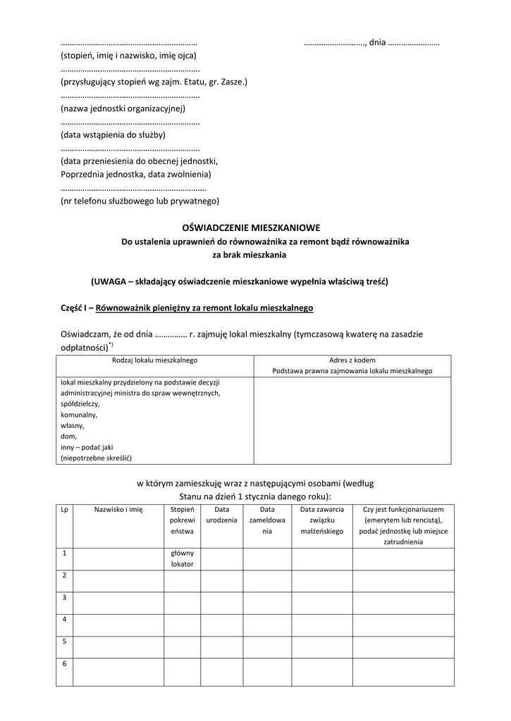 ……………………………………………………… (stopień, imię i nazwisko, imię ojca) ………………………………………………………. (przysługujący stopień wg zajm. Etatu, gr. Zasze.) ………………………………………………………. (nazwa jednostki organizacyjnej) ………………………………………………………. (data wstąpienia do służby) ………………………………………………………. (data przeniesienia do obecnej jednostki, Poprzednia jednostka, data zwolnienia) …………………………………………………………. (nr telefonu służbowego lub prywatnego) ………………………., dnia …………………… OŚWIADCZENIE MIESZKANIOWE Do ustalenia uprawnień do równoważnika za remont bądź równoważnika za brak mieszkania (UWAGA – składający oświadczenie mieszkaniowe wypełnia właściwą treść) Część I – Równoważnik pieniężny za remont lokalu mieszkalnego Oświadczam, że od dnia …………… r. zajmuję lokal mieszkalny (tymczasową kwaterę na zasadzie odpłatności)*) Rodzaj lokalu mieszkalnego Adres z kodem Podstawa prawna zajmowania lokalu mieszkalnego lokal mieszkalny przydzielony na podstawie decyzji administracyjnej ministra do spraw wewnętrznych, spółdzielczy, komunalny, własny, dom, inny – podać jaki (niepotrzebne skreślić) w którym zamieszkuję wraz z następującymi osobami (według Stanu na dzień 1 stycznia danego roku): Lp 1 2 3 4 5 6 Nazwisko i imię Stopień pokrewi eństwa główny lokator Data urodzenia Data zameldowa nia Data zawarcia związku małżeńskiego Czy jest funkcjonariuszem (emerytem lub rencistą), podać jednostkę lub miejsce zatrudnienia Zamieszkujący ze mną członkowie rodziny pobierają świadczenia: 1. Na remont lokalu mieszkalnego – (podać kto oraz adres instytucji realizującej wypłatę) ………………………………………………………………………………………………………………………………….. …………………………………………………………………………………………………………………………………… …………………………………………………………………………………………………………………………………… 2. Za brak lokalu mieszkalnego – (podać kto oraz adres instytucji realizującej wypłatę) …………………………………………………………………………………………………………………………………… …………………………………………………………………………………………………………………………………… …………………………………………………………………………………………………………………………………… Nie podnajmuję zajmowanego lokalu mieszkalnego w całości lub w części. Moje dzieci – osoby przysposobione – osoby przyjęte na wychowanie w ramach rodziny zastępczej*) (dotyczy również dzieci współmałżonka) pozostają na moim wyłącznym utrzymaniu i nie mają uprawnień do zajmowanego innego lokalu mieszkalnego domu) - podać kto: ………………………………………………………………………………………………………………………… …. Moi rodzice – osoby przysposabiające*) (dotyczy również rodziców i osób przysposabiających współmałżonka) pozostający ze mną we wspólnym gospodarstwie domowym i nie posiadający uprawnień do zajmowanego lokalu mieszkalnego (domu) – podać kto: ………………………………………………………………………………………………………………………… ………………………………………………………………………………………………………………………… Informacje dodatkowe ……………………………………………………………………………………………………………………………………………… ……………………………………………………………………………………………………………………………………………… Prawdziwość powyższych danych stwierdzam własnoręcznym podpisem ………………………………………………………….. (data i podpis – czytelnie) *) Niepotrzebne skreślić Część II – Równoważnik pieniężny za brak lokalu mieszkalnego Oświadczam, że : 1. Od dnia ……………….. r. nie posiadam lokalu mieszkalnego (tymczasowej kwatery)*), położonego w miejscu pełnienia służby bądź w miejscowości pobliskiej, oraz mój współmałżonek również nie posiada lokalu mieszkalnego (tymczasowej kwatery)*) 2. Od dnia ……………. R. zamieszkuję w …………………………..…….…. kod ……………...……….. przy ul. ………………………………………… w lokalu, do którego tytuł prawny posiada: ……………………………………………………………………………………………………………………………… (imię i nazwisko oraz stopień pokrewieństwa) - czas dojazdu z miejscowości pobliskiej, o której mowa w art. 74 ust. 3 ustawy z dnia 24 sierpnia 1991 r. o Państwowej Straży Pożarnej (Dz. U. z 2002 r. nr 147, poz. 1230, z późn. zm.), wynosi ………… minut. 3. Pozostaję/nie pozostaję*) we wspólnym gospodarstwie domowym z członkami rodziny, o których mowa w art. 75 ustawy z dnia 24 sierpnia 1991 r. o Państwowej Straży Pożarnej. 4. Zameldowanie na pobyt stały posiadam w ……………………………… kod ………………………. przy ul. …………………………………………………………………………………………………………………….. 5. Zamieszkujący ze mną członkowie rodziny nie pobierają/pobierają*) nas