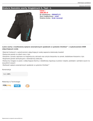 Informacje o produkcie Utworzono 02-03-2017 Endura Damskie szorty Singletrack II, Teal : L Cena : 269,00 zł Nr katalogowy : E8046TL/5 Stan magazynowy : niski Średnia ocena : brak recenzji Luźne szorty z możliwością wpięcia wewnętrznych spodenek w systemie Clickfast™ z wykończeniem DWR odpychającym wodę Materiał Cordura® z wykończeniem odpychającym wodę zapewnia doskonałą trwałość Elastyczne panele na udach oraz z tyłu Kieszenie z przodu zapinane na magnetyczny zatrzask oraz ukryta kieszonka na zamek; dodatkowe kieszenie z tyłu Rozpinane panele wentylacyjne z wewnętrzną siateczką Elastyczny ściągacz w pasie z oddychającej tkaniny z dodatkową regulacją w postaci rzepów; podwójne i potrójne szycie na wszystkich szwach Możliwość wpięcia wewnętrznych spodenek w systemie Clickfast™ Konstrukcja Nylon 100% Materialy & Technologie Wygenerowano w programie www.oscGold.com