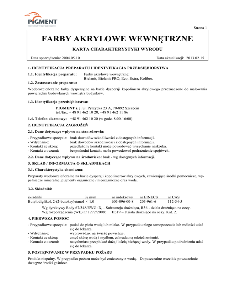 Strona 1 FARBY AKRYLOWE WEWNĘTRZNE KARTA CHARAKTERYSTYKI WYROBU Data sporządzenia: 2004.05.10 Data aktualizacji: 2013.02.15 1. IDENTYFIKACJA PREPARATU I IDENTYFIKACJA PRZEDSIĘBIORSTWA 1.1. Identyfikacja preparatu: Farby akrylowe wewnętrzne: Bielanit, Bielanit PRO, Eco, Extra, Koliber. 1.2. Zastosowanie preparatu: Wodorozcieńczalne farby dyspersyjne na bazie dyspersji kopolimeru akrylowego przeznaczone do malowania powierzchni budowlanych wewnątrz budynków. 1.3. Identyfikacja przedsiębiorstwa: PIGMENT s. j. ul. Pyrzycka 23 A, 70-892 Szczecin tel./fax: + 48 91 462 10 20, +48 91 462 11 86 1.4. Telefon alarmowy: +48 91 462 10 20 (w godz. 8:00-16:00) 2. IDENTYFIKACJA ZAGROśEŃ 2.1. Dane dotyczące wpływu na stan zdrowia: - Przypadkowe spoŜycie: - Wdychanie: - Kontakt ze skórą: - Kontakt z oczami: brak dowodów szkodliwości z dostępnych informacji. brak dowodów szkodliwości z dostępnych informacji. przedłuŜony kontakt moŜe powodować wysychanie naskórka. bezpośredni kontakt moŜe powodować podraŜnienie spojówek. 2.2. Dane dotyczące wpływu na środowisko: brak - wg dostępnych informacji. 3. SKŁAD / INFORMACJA O SKŁADNIKACH 3.1. Charakterystyka chemiczna: Preparaty wodorozcieńczalne na bazie dyspersji kopolimerów akrylowych, zawierające środki pomocnicze, wypełniacze mineralne, pigmenty organiczne / nieorganiczne oraz wodę. 3.2. Składniki: składniki % m/m Butylodiglikol, 2-(2-butoksy)etanol < 1,0 nr indeksowy 603-096-00-8 nr EINECS 203-961-6 nr CAS 112-34-5 Wg dyrektywy Rady 67/548/EWG: Xi – Substancja draŜniąca, R36 - działa draŜniąco na oczy. Wg rozporządzenia (WE) nr 1272/2008: H319 – Działa draŜniąco na oczy. Kat. 2. 4. PIERWSZA POMOC - Przypadkowe spoŜycie: podać do picia wodę lub mleko. W przypadku złego samopoczucia lub mdłości udać się do lekarza. - Wdychanie: wyprowadzić na świeŜe powietrze. - Kontakt ze skórą: zmyć skórę wodą i mydłem, zabrudzoną odzieŜ zmienić. - Kontakt z oczami: natychmiast przepłukać duŜą ilością bieŜącej wody. W przypadku podraŜnienia udać się do lekarza. 5. POSTĘPOWANIE W PRZYPADKU POśARU Produkt niepalny. W przypadku poŜaru moŜe być zmieszany z wodą. Dopuszczalne wszelkie powszechnie dostępne środki gaśnicze. PIGMENT FARBY AKRYLOWE WEWNĘTRZNE Strona 2 6. POSTĘPOWANIE W PRZYPADKU NIEZAMIERZONEGO UWOLNIENIA DO ŚRODOWISKA W przypadku wycieku lub rozlania wyrób zebrać do odpowiednich pojemników. Pozostałe, nie dające się zebrać resztki zmyć wodą z zanieczyszczonych powierzchni. Nie są wymagane specjalne środki ochrony osobistej. 7. POSTĘPOWANIE Z PREPARATEM I JEGO MAGAZYNOWANIE 7.1. Postępowanie z preparatem: Unikać bezpośredniego kontaktu ze skórą, błonami śluzowymi i odzieŜą. Po zakończeniu prac dokładnie zmyć zabrudzenia skóry wodą i mydłem. Wietrzyć pomieszczenia w czasie prac, a przed oddaniem do eksploatacji wietrzyć do zaniku zapachu. 7.2. Magazynowanie: Przechowywać w szczelnie zamkniętych opakowaniach, w suchym i chłodnym miejscu. Chronić przed bezpośrednim działaniem promieni słonecznych i innych źródeł ciepła oraz temperaturą poniŜej +5°C. 7.3. Specyficzne zastosowania: nie dotyczy. 8. KONTROLA NARAśENIA I ŚRODKI OCHRONY INDYWIDUALNEJ 8.1. Wartości graniczne naraŜenia: Składniki podlegające kontroli na stanowiskach pracy: brak danych. 8.2. Kontrola naraŜenia: 8.2.1. Kontrola naraŜenia w miejscu pracy: W czasie prac zapewnić odpowiednią wentylację. a) Ochrona dróg oddechowych: b) Ochrona rąk: rękawice robocze. c) Ochrona oczu: okulary ochronne. d) Ochrona skóry: kombinezon roboczy lub fartuch, nakrycie głowy. 8.2.2. Kontrola naraŜenia środowiska: brak danych. 9. WŁAŚCIWOŚCI FIZYKOCHEMICZNE 9.1. Informacje ogólne: - Postać: - Zapach: ciecz, barwy białej lub koloru zgodnego z kartą łagodny, charakterystyczny 9.2. WaŜne informacje dotyczące zdrowia, bezpieczeństwa i środowiska: - Wartość pH: - Temperatura wrzenia: - Temperatura zapłonu: - Palność: - Właściwości wybuchowe: - Właściwości utleniające: - PręŜność par: - Gęstość względna: - Rozpuszczalność w wodzie: - Współczynnik podziału n-oktanol/woda: - Lepkość: - Gęstość par: - Szybkość parowania: 9.3. Inne informacje: zamarza poniŜej 0ºC. 8.5÷9.5 nie dotyczy nie dotyczy niepalny nie dotyczy nie dotyczy nie dotyczy ok. 1,4-1,6 g/cm3 rozcieńczalny - PIGMENT FARBY AKRYLOWE WEWNĘTRZNE Strona 3 10. STABILNOŚĆ I REAKTYWNOŚĆ Produkt stabilny, uŜywany w warunkach zgodnych z instrukcją stosowania nie ulega rozkładowi. 10.1. Warunki, których naleŜy uniikać: Brak danych. 10.2. Czynniki, których naleŜy unikać: W reakcji z kwasami wydziela CO2. 10.3. Niebezpieczne produkty rozkładu: Nie są znane niebezpieczne produkty rozkładu. 11. INFORMACJE TOKSYKOLOGICZNE Nie są znane dane dotyczące szkodliwego wpływu wyrobu na zdrowie człowieka. Ze względu na lekko alkaliczny charakter preparatu, długotrwały kontakt ze skórą moŜe u osób wraŜliwych wywołać podraŜnienie naskórka, objawiające się zaczerwienieniem. 12. INFORMACJE EKOLOGICZNE Nie dopuszczać do przedostawania się wyrobu do ścieków i wód gruntowych. Brak danych na temat wpływu na środowisko naturalne. Brak danych na temat ulegania biodegradacji wyrobu. 12.1.Ekotoksyczność: 12.2. Mobilność: 12.3. Trwałość i zdolność do rozkładu: 12.4. Zdolność do biokumulacji: 12.5. Wyniki oceny właściwości PBT: 12.6. Inne szkodliwe skutki działania: - 13. POSTĘPOWANIE Z ODPADAMI Klasyfikacja odpadów wg Rozp. Min. Środowiska z dn. 27 września 2001 r. ( Dz. U. Nr 112, poz. 1206): niewielkie ilości, kod - 20 01 28, większe ilości, kod - 08 01 12. Zgodnie z rozp. odpady wyrobu nie są odpadami niebezpiecznymi. Usuwanie i neutralizacja odpadów powinny odbywać się zgodnie z lokalnymi przepisami obowiązującymi na danym obszarze. ZuŜyte opakowania: kategoria odpadów - Q5, kod - 15 01 02. Proces unieszkodliwiania odpadów prepa