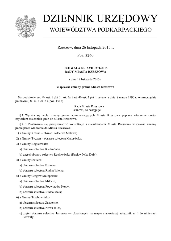 DZIENNIK URZĘDOWY WOJEWÓDZTWA PODKARPACKIEGO Rzeszów, dnia 26 listopada 2015 r. Poz. 3260 UCHWAŁA NR XVIII/371/2015 RADY MIASTA RZESZOWA z dnia 17 listopada 2015 r. w sprawie zmiany granic Miasta Rzeszowa Na podstawie art. 4b ust. 1 pkt 1, art. 5a i art. 40 ust. 2 pkt 1 ustawy z dnia 8 marca 1990 r. o samorządzie gminnym (Dz. U. z 2015 r. poz. 1515) Rada Miasta Rzeszowa stanowi, co następuje: § 1. Wyraża się wolę zmiany granic administracyjnych Miasta Rzeszowa poprzez włączenie części terytorium sąsiednich gmin do Miasta Rzeszowa. § 2. 1. Postanawia się przeprowadzić konsultacje z mieszkańcami Miasta Rzeszowa w sprawie zmiany granic przez włączenie do Miasta Rzeszowa: 1) z Gminy Krasne – obszaru sołectwa Malawa; 2) z Gminy Tyczyn – obszaru sołectwa Matysówka; 3) z Gminy Boguchwała: a) obszaru sołectwa Kielanówka, b) części obszaru sołectwa Racławówka (Racławówka Doły); 4) z Gminy Świlcza: a) obszaru sołectwa Bzianka, b) obszaru sołectwa Rudna Wielka; 5) z Gminy Głogów Małopolski: a) obszaru sołectwa Miłocin, b) obszaru sołectwa Pogwizdów Nowy, b) obszaru sołectwa Rudna Mała; 6) z Gminy Trzebownisko: a) obszaru sołectwa Zaczernie, b) obszaru sołectwa Nowa Wieś, c) części obszaru sołectwa Jasionka — określonych na mapie stanowiącej załącznik nr 1 do niniejszej uchwały. Dziennik Urzędowy Województwa Podkarpackiego –2– Poz. 3260 2. W przedmiocie konsultowanej sprawy ustala się następującej treści pytanie: "Czy jesteś za zmianą granic Miasta Rzeszowa polegającą na włączeniu do Miasta Rzeszowa obszaru sołectwa Malawa – z Gminy Krasne, obszaru sołectwa Matysówka – z Gminy Tyczyn, obszaru sołectwa Kielanówka i części obszaru sołectwa Racławówka (Racławówka Doły) – z Gminy Boguchwała, obszaru sołectwa Bzianka i obszaru sołectwa Rudna Wielka – z Gminy Świlcza, obszaru sołectwa Miłocin, obszaru sołectwa Pogwizdów Nowy i obszaru sołectwa Rudna Mała – z Gminy Głogów Małopolski oraz obszaru sołectwa Zaczernie, obszaru sołectwa Nowa Wieś i części obszaru sołectwa Jasionka – z Gminy Trzebownisko?". § 3. Uprawnionymi do udziału w konsultacjach są osoby stale zamieszkałe na terenie Miasta Rzeszowa, które w dniu konsultacji mają ukończone 18 lat. § 4. Wyrażenie opinii polegać będzie na umieszczeniu w odpowiedniej rubryce: "Jestem za", "Jestem przeciw", "Wstrzymuję się", znaku x i złożeniu podpisu na Ankiecie konsultacyjnej, według wzoru stanowiącego załącznik nr 2 do niniejszej uchwały. § 5. 1. Konsultacje z mieszkańcami Miasta Rzeszowa będą przeprowadzone poprzez udostępnienie Ankiet konsultacyjnych w: 1) Kancelarii Ogólnej Urzędu Miasta Rzeszowa, Ratusz, Rynek 1; 2) Punktach Informacji i Obsługi Mieszkańców Urzędu Miasta Rzeszowa: ul. Okrzei 1, pl. Ofiar Getta 7, ul. Kopernika 15, al. Witosa 21 (hipermarket „bi1”), al. Kopisto 1 (Centrum Kulturalno-Handlowe Millenium Hall), ul. Krakowska 20 (Galeria Handlowa Nowy Świat), al. Rejtana 65 (Centrum Handlowe Plaza) i al. Piłsudskiego 44 (Galeria Rzeszów); 3) siedzibach Rad Osiedlowych Miasta Rzeszowa; 4) siedzibach jednostek organizacyjnych Miasta Rzeszowa; 5) Biuletynie Informacji Publicznej Urzędu Miasta Rzeszowa (www.bip.erzeszow.pl). 2. Wypełnione Ankiety konsultacyjne mieszkańcy Miasta Rzeszowa mogą składać: 1) bezpośrednio osobom udostępniającym Ankiety konsultacyjne; 2) w miejscach udostępniania Ankiet konsultacyjnych. § 6. Projekt zmian granic Miasta zostanie udostępniony w: 1) Biurze Rady Miasta Rzeszowa, al. Pod Kasztanami 8; 2) Kancelarii Ogólnej Urzędu Miasta Rzeszowa, Ratusz, Rynek 1; 3) punktach informacyjnych, o których mowa w § 5 ust. 1 pkt 2; 4) siedzibach jednostek organizacyjnych Miasta Rzeszowa; 5) siedzibach Rad Osiedlowych Miasta Rzeszowa; 6) Biuletynie Informacji Publicznej Urzędu Miasta Rzeszowa. § 7. Termin rozpoczęcia i zakończenia konsultacji, skład osobowy Komisji ds. przeprowadzenia konsultacji oraz wzór protokołu zawierającego wyniki przeprowadzonych konsultacji określi Prezydent Miasta Rzeszowa. § 8. Prezydent Miasta Rzeszowa zawiadomi mieszkańców o zamiarze przeprowadzenia konsultacji na 7 dni przed ich terminem, w sposób zwyczajowo przyjęty. § 9. Z przeprowadzonych konsultacji Prezydent Miasta Rzeszowa złoży Radzie Miasta Rzeszowa sprawozdanie na najbliższej sesji po zakończeniu konsultacji. § 10. Wykonanie uchwały powierza się Prezydentowi Miasta Rzeszowa. Dziennik Urzędowy Województwa Podkarpackiego –3– Poz. 3260 § 11. Uchwała wchodzi w życie po upływie 14 dni od dnia ogłoszenia w Dzienniku Urzędowym Województwa Podkarpackiego. Przewodniczący Rady Miasta Rzeszowa Andrzej Dec Dziennik Urzędowy Województwa Podkarpackiego –4– Poz. 3260 Dziennik Urzędowy Województwa Podkarpackiego –5– Poz. 3260 Dziennik Urzędowy Województwa Podkarpackiego –6– Poz. 3260 Uzasadnienie Rzeszów stoi przed historyczną szansą przekształcenia się w miasto centralne obszaru metropolitalnego. W dotychczasowych koncepcjach zagospodarowania przestrzennego i strategiach rozwoju kraju, Polski Wschodniej i województwa podkarpackiego, opracowanych po roku 2000, uwzględnia się aspiracje Rzeszowa do pełnienia funkcji metropolitalnych. Mając na uwadze optymalne wykorzystanie tych szans, zasadne są konsekwentne działania budujące mocną stolicę województwa podkarpackiego. Powiększenie obszaru Rzeszowa do około 200 km2 i wzrost liczby mieszkańców do 200 tysięcy jest drogą do dalszego jego dynamicznego rozwoju, a także rozwoju całego regionu. Jest to również ogromna szansa na powstanie silnego ośrodka miejskiego w południowo-wschodniej części kraju. Propozycja zmian terytorialnych określona w projekcie uchwały wychodzi naprzeciw głosom mieszkańców, którzy w różnej formie zwracają się z prośbą do Prezydenta Rzeszowa o włączenie ich miejscowości do miasta. Duży potencjał finansowy Rzeszowa może 