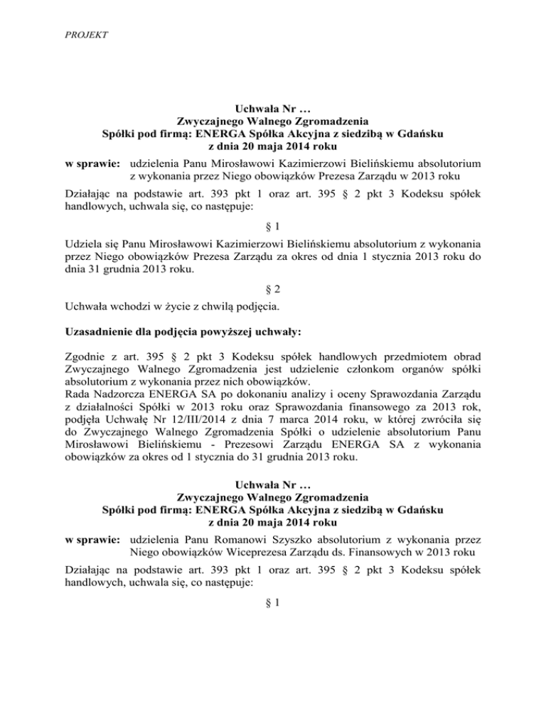 PROJEKT Uchwała Nr … Zwyczajnego Walnego Zgromadzenia Spółki pod firmą: ENERGA Spółka Akcyjna z siedzibą w Gdańsku z dnia 20 maja 2014 roku w sprawie: udzielenia Panu Mirosławowi Kazimierzowi Bielińskiemu absolutorium z wykonania przez Niego obowiązków Prezesa Zarządu w 2013 roku Działając na podstawie art. 393 pkt 1 oraz art. 395 § 2 pkt 3 Kodeksu spółek handlowych, uchwala się, co następuje: §1 Udziela się Panu Mirosławowi Kazimierzowi Bielińskiemu absolutorium z wykonania przez Niego obowiązków Prezesa Zarządu za okres od dnia 1 stycznia 2013 roku do dnia 31 grudnia 2013 roku. §2 Uchwała wchodzi w życie z chwilą podjęcia. Uzasadnienie dla podjęcia powyższej uchwały: Zgodnie z art. 395 § 2 pkt 3 Kodeksu spółek handlowych przedmiotem obrad Zwyczajnego Walnego Zgromadzenia jest udzielenie członkom organów spółki absolutorium z wykonania przez nich obowiązków. Rada Nadzorcza ENERGA SA po dokonaniu analizy i oceny Sprawozdania Zarządu z działalności Spółki w 2013 roku oraz Sprawozdania finansowego za 2013 rok, podjęła Uchwałę Nr 12/III/2014 z dnia 7 marca 2014 roku, w której zwróciła się do Zwyczajnego Walnego Zgromadzenia Spółki o udzielenie absolutorium Panu Mirosławowi Bielińskiemu - Prezesowi Zarządu ENERGA SA z wykonania obowiązków za okres od 1 stycznia do 31 grudnia 2013 roku. Uchwała Nr … Zwyczajnego Walnego Zgromadzenia Spółki pod firmą: ENERGA Spółka Akcyjna z siedzibą w Gdańsku z dnia 20 maja 2014 roku w sprawie: udzielenia Panu Romanowi Szyszko absolutorium z wykonania przez Niego obowiązków Wiceprezesa Zarządu ds. Finansowych w 2013 roku Działając na podstawie art. 393 pkt 1 oraz art. 395 § 2 pkt 3 Kodeksu spółek handlowych, uchwala się, co następuje: §1 PROJEKT Udziela się Panu Romanowi Szyszko absolutorium z wykonania przez Niego obowiązków Wiceprezesa Zarządu ds. Finansowych za okres od dnia 1 stycznia 2013 roku do dnia 31 grudnia 2013 roku. §2 Uchwała wchodzi w życie z chwilą podjęcia. Uzasadnienie dla podjęcia powyższej uchwały: Zgodnie z art. 395 § 2 pkt 3 Kodeksu spółek handlowych przedmiotem obrad Zwyczajnego Walnego Zgromadzenia jest udzielenie członkom organów spółki absolutorium z wykonania przez nich obowiązków. Rada Nadzorcza ENERGA SA po dokonaniu analizy i oceny Sprawozdania Zarządu z działalności Spółki w 2013 roku oraz Sprawozdania finansowego za 2013 rok, podjęła Uchwałę Nr 13/III/2014 z dnia 7 marca 2014 roku, w której zwróciła się do Zwyczajnego Walnego Zgromadzenia Spółki o udzielenie absolutorium Panu Romanowi Szyszko - Wiceprezesowi Zarządu ds. Finansowych ENERGA SA z wykonania obowiązków za okres od 1 stycznia do 31 grudnia 2013 roku. Uchwała Nr … Zwyczajnego Walnego Zgromadzenia Spółki pod firmą: ENERGA Spółka Akcyjna z siedzibą w Gdańsku z dnia 20 maja 2014 roku w sprawie: udzielenia Panu Wojciechowi Topolnickiemu absolutorium z wykonania przez Niego obowiązków Wiceprezesa Zarządu ds. Strategii Rozwoju w 2013 roku Działając na podstawie art. 393 pkt 1 oraz art. 395 § 2 pkt 3 Kodeksu spółek handlowych, uchwala się, co następuje: §1 Udziela się Panu Wojciechowi Topolnickiemu absolutorium z wykonania przez Niego obowiązków Wiceprezesa Zarządu ds. Strategii Rozwoju za okres od dnia 1 stycznia 2013 roku do dnia 31 grudnia 2013 roku. §2 Uchwała wchodzi w życie z chwilą podjęcia. Uzasadnienie dla podjęcia powyższej uchwały: Zgodnie z art. 395 § 2 pkt 3 Kodeksu spółek handlowych przedmiotem obrad Zwyczajnego Walnego Zgromadzenia jest udzielenie członkom organów spółki absolutorium z wykonania przez nich obowiązków. Rada Nadzorcza ENERGA SA po dokonaniu analizy i oceny Sprawozdania Zarządu z działalności Spółki w 2013 roku oraz Sprawozdania finansowego za 2013 rok, PROJEKT podjęła Uchwałę Nr 14/III/2014 z dnia 7 marca 2014 roku, w której zwróciła się do Zwyczajnego Walnego Zgromadzenia Spółki o udzielenie absolutorium Panu Wojciechowi Topolnickiemu - Wiceprezesowi Zarządu ds. Strategii Rozwoju ENERGA SA z wykonania obowiązków za okres od 1 stycznia do 31 grudnia 2013 roku.