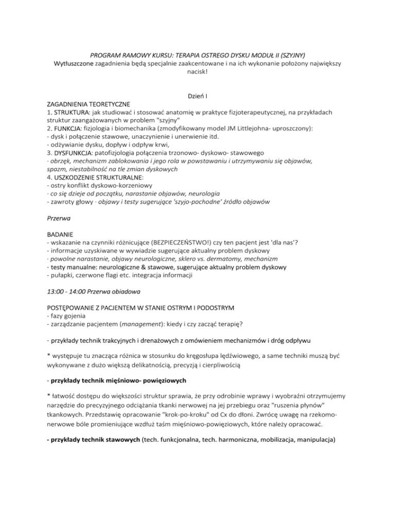 PROGRAM RAMOWY KURSU: TERAPIA OSTREGO DYSKU MODUŁ II (SZYJNY) Wytłuszczone zagadnienia będą specjalnie zaakcentowane i na ich wykonanie położony największy nacisk! Dzień I ZAGADNIENIA TEORETYCZNE 1. STRUKTURA: jak studiować i stosować anatomię w praktyce fizjoterapeutycznej, na przykładach struktur zaangażowanych w problem "szyjny" 2. FUNKCJA: fizjologia i biomechanika (zmodyfikowany model JM Littlejohna- uproszczony): - dysk i połączenie stawowe, unaczynienie i unerwienie itd. - odżywianie dysku, dopływ i odpływ krwi, 3. DYSFUNKCJA: patofizjologia połączenia trzonowo- dyskowo- stawowego · obrzęk, mechanizm zablokowania i jego rola w powstawaniu i utrzymywaniu się objawów, spazm, niestabilność na tle zmian dyskowych 4. USZKODZENIE STRUKTURALNE: - ostry konflikt dyskowo-korzeniowy · co się dzieje od początku, narastanie objawów, neurologia - zawroty głowy · objawy i testy sugerujące 'szyjo-pochodne' źródło objawów Przerwa BADANIE - wskazanie na czynniki różnicujące (BEZPIECZEŃSTWO!) czy ten pacjent jest 'dla nas'? - informacje uzyskiwane w wywiadzie sugerujące aktualny problem dyskowy · powolne narastanie, objawy neurologiczne, sklero vs. dermatomy, mechanizm - testy manualne: neurologiczne & stawowe, sugerujące aktualny problem dyskowy - pułapki, czerwone flagi etc. integracja informacji 13:00 - 14:00 Przerwa obiadowa POSTĘPOWANIE Z PACJENTEM W STANIE OSTRYM I PODOSTRYM - fazy gojenia - zarządzanie pacjentem (management): kiedy i czy zacząć terapię? - przykłady technik trakcyjnych i drenażowych z omówieniem mechanizmów i dróg odpływu * występuje tu znacząca różnica w stosunku do kręgosłupa lędźwiowego, a same techniki muszą być wykonywane z dużo większą delikatnością, precyzją i cierpliwością - przykłady technik mięśniowo- powięziowych * łatwość dostępu do większości struktur sprawia, że przy odrobinie wprawy i wyobraźni otrzymujemy narzędzie do precyzyjnego odciążania tkanki nerwowej na jej przebiegu oraz "ruszenia płynów" tkankowych. Przedstawię opracowanie "krok-po-kroku" od Cx do dłoni. Zwrócę uwagę na rzekomonerwowe bóle promieniujące wzdłuż taśm mięśniowo-powięziowych, które należy opracować. - przykłady technik stawowych (tech. funkcjonalna, tech. harmoniczna, mobilizacja, manipulacja) * wszystkie powyższe czynniki tj. łatwość dostępu, relatywnie mniejsze rozmiary oraz wrażliwość struktur wymagają przede wszystkim doskonałego czucia palpacyjnego i ciągłego monitorowania pacjenta podczas wykonywania zabiegu aby "nie przedobrzyć". Właściwe zastosowanie technik stawowych jest często kamieniem milowym w odzyskiwaniu równowagi miejsca uszkodzenia. - integracja powyższych w spójny model postępowania- esencja leczenia!!! Technika nie jest celem leczenia, jest jedynie środkiem do celu jakim jest przywrócenie homeostazy w obrębie i w okolicy uszkodzenia. Dobra technika wynika ze znajomości anatomii struktur na które działa. DZIEŃ II Kontynuacja nauki technik NEUROCHIRURGIA- pierwsza czy ostatnia deska ratunku w ostrym dysku? - kiedy operujemy - najpopularniejsze techniki zabiegowe - oczekiwania i co oznacza ‘dobry’ wynik operacji w odcinku szyjnym POSTĘPOWANIE POOPERACYJNE - fazy gojenia (co jest ‘uszkadzane’ w czasie operacji) - ochrona rezultatu zabiegu ‘na co dzień’ - przywracanie funkcjonalnej sprawności operowanego regionu - uruchamianie (co i po co?)- wykonywanie technik manipulacyjnych u osób operowanych (czy można,trzeba??) - techniki neuromobilizacji (czy warto? co przez to osiągamy??a może jest alternatywa? co to w ogóle oznacza uruchomić nerw? - techniki stabilizacji (czy rzeczywiście są potrzebne? jakie formy ruchu są wskazane?) Zakończenie kursu