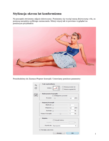 Stylizacja okresu lat konformizmu Na początek otwieramy zdjęcie dziewczyny. Postaramy się wyciąć naszą dziewczynę z tła, za pomocą narzędzia szybkiego zaznaczania. Mniej więcej tak to powinno wyglądać na poniższym przykładzie: Przechodzimy do Zaznacz/Popraw krawędź. Ustawiamy poniższe parametry: 1 Następnie w zakładce [wyniki do] zmieniamy na przezroczystość. Tak wygląda w moim przypadku: Jak widać pomiędzy nogami widać fragmenty tła. Można poprawić za pomocą narzędzia gumka. To dość intuicyjna praca, należy tak wycierać aby nie zetrzeć nóg. Tworzymy do tego maskę warstwy i za pomocą narzędzi pędzel/gumka pozbywamy się niepotrzebnych elementów. Na warstwie przezroczystej za pomocą narzędzia [kroplomierz] możemy zaszpachlować zbyt jasne/ciemne lub niechcący usunięte piksele. Praca ta jest jak już wspominałem wcześniej, dość intuicyjna, co za tym idzie wymaga cierpliwości. 2 Jak widać u góry, po prostu będziemy dość często stosować kroplomierz w celu, retuszowania zbędnych elementów. Po skończonej pracy mniej więcej w moim przypadku wygląda to tak: Powtórzę raz jeszcze – wszystko zależy od tego jak zostało zaznaczone za pomocą szybkiego zaznaczania nasze fragmenty postaci. Reszta poprawek to sprawa intuicyjna. Piksel po pikselu. Gdy już z tym się uporaliśmy, czas na kolejny etap. Tworzymy nową przezroczystą warstwę i wypełniamy ją kolorem [dad1b7]. Jeżeli zajdzie taka potrzeba, przechodzimy znowu do maski warstwy w celu skorygowania niedociągnięć typu kawałki tła itd. Następnie przechodzimy do Filtry/Konwertuj na inteligentne filtry [warstwa z tłem]. Następnie przechodzimy Filtry/Galeria filtrów. Ustawiamy poniższą opcję: 3 Znowu postępujemy tak samo jak przed chwilą, tylko tym razem zmienią się opcje: Tak wygląda nasza tekstura w tej chwili: Tworzymy nową przezroczystą warstwę, umieszczamy ją nad warstwą z naszą teksturą. Wybieramy kolor czarny, a następnie za pomocą pędzla o przezroczystej nasadce [czarny kolor!] przyciemniamy narożniki naszej kompozycji. Tutaj jak poprzednio, praca wymaga pewnej intuicji i wyczucia cieniowania. Tak wygląda mnie więcej w poniższym przykładzie: 4 Zmieniamy tryb krycia na [Nakładka]. Tak wygląda po zastosowaniu tego stylu: Kolejnym krokiem będzie stworzenie jeszcze dwóch duplikatów dla naszej dziewczyny. Przechodzimy na górną warstwę „dziewczyny”. Zastosujmy też maski warstwy do naszego zdjęcia [każdego duplikatu dziewczyny]. Zaznaczmy naszą dziewczynę a następnie przejdźmy do zakładki [Jaskrawość /Jaskrawość i Nasycenie na -30]. Duplikujemy warstwę z tłem i cieniem. Z kolei zaznaczamy nasz efekt jaskrawości/dziewczynę/tło i cień, a następnie tworzymy dla nich grupę. Następną naszą dziewczynę, konwertujemy na obiekt inteligentny. Kolejnym krokiem będzie Filtr/Galeria filtrów [Wcześniej również dla tej dziewczyny ustawiamy taką samą jaskrawość i nasycenie jak poprzednio]. Ustawiamy poniższe wartości: 5 Efekt wygląda tak: Zmieniamy na łagodne światło: 6 Stworzymy teraz cień dla naszej dziewczyny. W tym celu przechodzimy do dolnej warstwy z pierwszą „panią” i wypełniamy kolorem czarnym. Konwertujemy ją na obiekt inteligentny i przenosimy ją do [Grupy I]. Za pomocą [Ctrl + T] dopasujmy nasz cień. Za pomocą rozmycia Gaussa, tworzymy nasz cień [wartość – 5 pikseli]. Jeżeli fragmenty cienia będą wystawać [usuwamy za pomocą gumki]. Tworzymy maskę warstwy i za pomocą gradientu nadajmy dla naszego cienia większego realizmu, możemy też zmniejszyć krycie: 7 Wybieramy czcionkę [Snell Roundhand] i piszemy dowolny tekst: Wybieramy naszą teksturę, a następnie dopasujemy ją do niniejszego projektu. W poniższym przykładzie krycie to [Nakładka]. Do tego możemy znowu zastosować w rogach cienie. Efekt wygląda w taki oto sposób: 8
