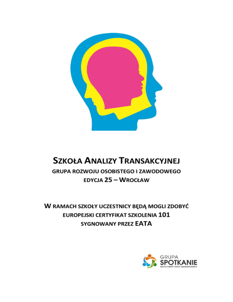 SZKOŁA ANALIZY TRANSAKCYJNEJ GRUPA ROZWOJU OSOBISTEGO I ZAWODOWEGO EDYCJA 25 – WROCŁAW W RAMACH SZKOŁY UCZESTNICY BĘDĄ MOGLI ZDOBYĆ EUROPEJSKI CERTYFIKAT SZKOLENIA 101 SYGNOWANY PRZEZ EATA Szkoła Analizy Transakcyjnej skierowana jest do osób pragnących rozwinąć się osobiście oraz poszerzyć kompetencje zawodowe. Zdobyta wiedza, umiejętności oraz doświadczenie może posłużyć, jako narzędzie do pracy zawodowej w obszarach: pomoc grupowa i indywidualna, szkolnictwo, edukacja i inne. Wielu uczestników, korzystając ze zdobytej wiedzy, przebudowuje i zmienia ważne w ich życiu osobistym relacje. Dla kogo: Szkoła Analizy Transakcyjnej jest to program skierowany do: trenerów praktyków psychologów i pedagogów szkolnych terapeutów pracowników pomocy społecznej kuratorów sądowych nauczycieli studentów kierunków humanistycznych wszystkich osób, które pracują z ludźmi dla tych, których sukces w pracy zawodowej jest zależny od jakości relacji międzyludzkich Korzyści: Dzięki udziałowi w tym programie: zdiagnozujesz siebie, mechanizmy swoich zachowań i własne sposoby komunikacji, będziesz świadomie budował swoje relacje zawodowe i osobiste, rozpoznasz i rozwiniesz własne zasoby w pracy zawodowej, poznasz mechanizmy powodujące określone rodzaje zachowań u dzieci i dorosłych, poznasz reguły komunikacji i ich związek ze stanami Ja oraz nauczysz się dostosowania sposobu komunikacji do możliwości i potrzeb rozmówcy, zdobędziesz narzędzia do diagnozy i interwencji, uzyskasz wsparcie uczestników i trenerów, będziesz mógł zdobyć certyfikat 101 z Analizy Transakcyjnej (zgodny z założeniami European Association of Transactional Analysis EATA). Grupa Spotkanie 60-786 Poznań, ul. Grunwaldzka 42/2, tel. 0 61 657 09 77, 0 606 42 42 00 [email protected] www.grupaspotkanie.pl Program: MODUŁ 1: SZKOLENIE 101 MODUŁ 2: WPROWADZENIE DO AT I MODEL FUNKCJONALNY MODUŁ 3: MODEL STRUKTURALNY I TRANSAKCJE MODUŁ 4: ZNAKI ROZPOZNANIA, NIEROZPOZNANIA I STRUKTURALIZACJA CZASU MODUŁ 5: GRY PSYCHOLOGICZNE MODUŁ 6: POZYCJE ŻYCIOWE I SKRYPT MODUŁ 7: AUTONOMIA Zakres merytoryczny Szkoły Analizy Transakcyjnej: Założenia i źródła koncepcji Analizy Transakcyjnej. Możliwości zastosowania Analizy Transakcyjnej w praktyce. Analiza stanów JA - model funkcjonalny, model strukturalny i patologia stanów JA. Strukturalizacja czasu. Rodzaje oraz kolekcjonowanie znaków rozpoznania. Zasady komunikacji w Analizie Transakcyjnej. Analiza transakcji, pojęcie transakcji oraz ich rodzaje. Nierozpoznania i zachowania pasywne. Pozycje życiowe. Problematyka emocji w Analizie Transakcyjnej. Gry transakcyjne - znaczenie i funkcje gier, trójkąt dramatyczny, klasyfikacja gier wg Bene’a, sposoby wychodzenia z gier, analiza gier za pomocą formuły gry, biblioteka gier. Kształtowanie się skryptu i konskryptu, klasyfikacja i rozpoznawanie zakazów i nakazów. Scenariusz życiowy - przyzwolenia, programy, matryca skryptu wg Steiner’a, klasyfikacja skryptu wg Berne’a, klasyfikacja skryptu wg Stainer’a. Pojęcie autonomii w Analizie Transakcyjnej. Organizacja zajęć: Grupa: Godziny zajęć: Tryb zajęć: Ilość godzin: Forma pracy: Miejsce: ok. 10 - 14 osobowa piątek 15.00-21.00, sobota 9.00-18.00, niedziela 9.00-14.30 szkolenie 101 modułu 2-7 piątek 15.00-21.00, sobota 9.00-18.45. 7 spotkań weekendowych 140 godzin szkoleniowych warsztat ul. Pieszycka 7, 50-537 Wrocław Grupa Spotkanie 60-786 Poznań, ul. Grunwaldzka 42/2, tel. 0 61 657 09 77, 0 606 42 42 00 [email protected] www.grupaspotkanie.pl Harmonogram: Inwestycja: moduł 1: moduł 2: moduł 3: moduł 4: moduł 5: moduł 6: 18-20.11.2016r. 16-17.12.2016r. 27-28.01.2017r. 24-25.02.2017r. 17-18.03.2017r. 21-22.04.2017r. moduł 7: 19-20.05.2017r. wpisowe: 1 rata ( opłata za certyfikowane szkolenie 101) 6 rat po całość: 450 zł 600 zł 420 zł 420 zł 3 570 zł Zapisy: Warunkiem udziału w szkoleniu jest odbycie rozmowy z trenerem prowadzącym, wypełnienie ankiety informacyjnej, podpisanie umowy i wpłacenie wpisowego. Na rozmowę z trenerem można się umówić pod numerem telefonu 61 657 09 77 lub 606 42 42 00 w dni powszednie w godzinach od 8.00 do 15.30. Trenerzy prowadzący: Joanna Gosk psycholog, absolwentka UAM, specjalizacja kliniczna, absolwentka Szkoły Trenerów w Pracowni "Trop" w Warszawie rekomendowanej przez Polskie Towarzystwo Psychologiczne, uczestniczka szkolenia I i II stopnia "Diagnoza i interwencja w Analizie Transakcyjnej", zdała egzamin "101" w zakresie Analizy Transakcyjnej, ukończyła szkolenie podstawowe z zakresu terapii systemowej w Wielkopolskim Towarzystwie Terapii Systemowej, absolwentka rocznego "Programu edukacji psychologicznej w zakresie psychoterapii, psychoedukacji i rozwoju osobistego". Wykładowca Podyplomowych Studiów Wyższej Szkoły Bankowej. Od ponad ośmiu lat pracuje z grupami młodzieży i dorosłych w organizacjach pozarządowych. Marta Drażyńska psycholog, psychoterapeuta, trener. Ukończyła psychologię, specjalizację kliniczną na Uniwersytecie Adama Mickiewicza w Poznaniu oraz filologię polską. Odbyła pięcioletnie szkolenie w zakresie psychoterapii w podejściu Analizy Transakcyjnej, szkoliła się także w psychoterapii gestalt. Jest absolwentką „Studium Umiejętności Pracy z Grupą”, programu rekomendowanego przez Polskie Towarzystwo Psychologiczne. Obecnie szkoli się w "Laboratorium Psychoedukacji" w Warszawie w ramach pięcioletniego Studium Psychoterapii. Przygotowuje się do certyfikacji PTP. Jako trener zajmuje się szkoleniami z Analizy Transakcyjnej oraz różnego rodzaju umiejętności interpersonalnych. Szkoliła m. in. psychologów, pedagogów, kuratorów sądowych oraz trenerów. Grupa Spotkanie 60-786 Poznań, ul. Grunwaldzka 42/2, tel. 0 61 657 09 77, 0 606 42 42 00 [email protected] www.grupaspotkanie.pl