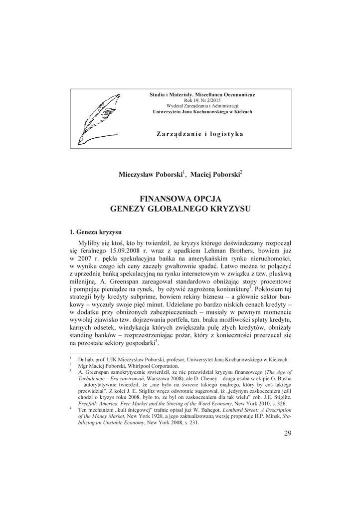 Studia i Materiały. Miscellanea Oeconomicae Rok 19, Nr 2/2015 Wydział Zarządzania i Administracji Uniwersytetu Jana Kochanowskiego w Kielcach Zarządzanie i logistyka Mieczysław Poborski1, Maciej Poborski2 FINANSOWA OPCJA GENEZY GLOBALNEGO KRYZYSU 1. Geneza kryzysu Myliłby się ktoś, kto by twierdził, że kryzys którego doświadczamy rozpoczął się feralnego 15.09.2008 r. wraz z upadkiem Lehman Brothers, bowiem już w 2007 r. pękła spekulacyjna bańka na amerykańskim rynku nieruchomości, w wyniku czego ich ceny zaczęły gwałtownie spadać. Łatwo można to połączyć z uprzednią bańką spekulacyjną na rynku internetowym w związku z tzw. pluskwą milenijną. A. Greenspan zareagował standardowo obniżając stopy procentowe i pompując pieniądze na rynek, by ożywić zagrożoną koniunkturę3. Pokłosiem tej strategii były kredyty subprime, bowiem rekiny biznesu – a głównie sektor bankowy – wyczuły swoje pięć minut. Udzielane po bardzo niskich cenach kredyty – w dodatku przy obniżonych zabezpieczeniach – musiały w pewnym momencie wywołaj zjawisko tzw. dojrzewania portfela, tzn. braku możliwości spłaty kredytu, karnych odsetek, windykacja których zwiększała pulę złych kredytów, obniżały standing banków – rozprzestrzeniając pożar, który z konieczności przerzucał się na pozostałe sektory gospodarki4. 1 2 3 4 Dr hab. prof. UJK Mieczysław Poborski, profesor, Uniwersytet Jana Kochanowskiego w Kielcach. Mgr Maciej Poborski, Whirlpool Corporation. A. Greenspan samokrytycznie stwierdził, że nie przewidział kryzysu finansowego (The Age of Turbulencje – Era zawirowań, Warszawa 2008), ale D. Cheney – druga osoba w ekipie G. Busha – autorytatywnie twierdził, że „nie było na świecie takiego mądrego, który by coś takiego przewidział”. Z kolei J. E. Stiglitz wręcz odwrotnie sugerował, iż „jedynym zaskoczeniem jeśli chodzi o kryzys roku 2008, było to, że był on zaskoczeniem dla tak wielu” zob. J.E. Stiglitz, Freefall: America, Free Market and the Sincing of the Word Economy, New York 2010, s. 326. Ten mechanizm „kuli śniegowej” trafnie opisał już W. Bahegot, Lombard Street: A Description of the Money Market, New York 1920, a jego zaktualizowaną wersję proponuje H.P. Minsk, Stabilizing un Unstable Economy, New York 2008, s. 231. 29 Genezę kryzysu łączyć zatem należy z funkcjonowaniem sektora finansowego, bo już we wrześniu 2007 r. brytyjski Northern Rock wystąpił o pomoc do Banku Anglii, należał bowiem do grupy podmiotów too big to fail, w związku z czym państwo musiało przejąć bank, z którego klienci zaczęli masowo wycofywać depozyty. Amerykańska zaraza zainfekowała również europejskie banki i trudno żeby było inaczej, jeżeli amerykańskie banki transferowały gotówkę ze swoich europejskich filii z częstotliwością 12 godzin na dobę. Ten samonapędzający się mechanizm był bardzo czytelny, bowiem nawet polskie banki poszły tym śladem generując kredyty walutowe, których jedynym uzasadnieniem były różnice stóp procentowych pomiędzy poszczególnymi walutami a przede wszystkim wysoka stopa referencyjna NBP. Autor sam przecierał oczy, gdy spotykał oferty instytucji parabankowych oferujących kredyty z 75-letnim (sic) terminem spłaty. Autorzy takich ofert zapewne wiedzieli co robią, nie do końca chyba wiedzieli ci, którzy zapowiadali wejście Polski do strefy euro już w 2011 r., bo jakby w odpowiedzi kurs złotego obniżył się w ciągu kilku miesięcy do euro – 36,5%, do dolara – 45,7%, a do szwajcarskiego franka – 58,2%. Efekt kuli śniegowej widoczny był już na początku 2008 r., bo z powodu chybionych inwestycji w kredyty hipoteczne zachwiał się potężny Bear Stearns i dopiero interwencja rządu USA umożliwiła przejęcie go przez jeszcze potężniejszy J. P. Morgan Chase. Upadek Lehman Brothers był już zatem efektem domina, w wyniku którego rząd USA musiał przejąć Freddie Mac i Fannie Mae – olbrzymie instytucje poręczające kredyty hipoteczne5. Oczywiście nic nie dzieje się za darmo, bowiem już w końcu 2008 r. Kongres USA zatwierdzić musiał 700 miliardów dolarów pomocy dla banków, zaś rezerwa federalna (Fed) pożyczyła 900 miliardów bankom i 1,3 biliona dolarów przedsiębiorstwom. Interwencja państwowa była niezbędna, bowiem banki zaczęły gwałtownie zawężać kredyty dla przedsiębiorstw, co w efekcie obniżyło indeks Dow Jones o 22% w ciągu tygodnia. W świetle tych faktów dziwić musi optymizm polskiego rządu, który w tym samym czasie zaczął przymiarki do wejścia w strefę euro, podczas gdy było wiadomo, że Polska nie spełnia podstawowych warunków Traktatu z Maastricht od stóp procentowych poczynając a na wahaniach kursu do głównej waluty kończąc6. Krzyżowanie się warunków mikro (banki – przedsiębiorstwa) z wymogami makro (deficyty budżetowe – dług publiczny) wymuszało na rządach państw bardziej aktywną politykę, w związku z czym europejskie rządy zaczęły rozszerzać gwa5 6 30 Kryzys globalny ma już obszerną literaturę i to zarówno anglo jak i polskojęzyczną. Ph. Legrain, Aftershock: Reshaping the World Economy After the Crisis, London 2010; A. Liakwat, Lord of Finance: The Bankers Who Broke the World, New York 2009; P. Krugman, The Return of Depression Economics and the Crisis of 2008, New York 2008; G. Soros, The New Paradigm for Financial Markets. The Credit, Crisis of 2008, New York 2008; W.M. Orłowski, Świat, który oszalał, Warszawa 2008; W. Szymański, Kryzys globalny. Pierwsze przybliżenie, Warszawa 2009; G.W. Kołodko, Globalizacja, kryzys i co dalej, Warszawa 2010. Zob. M. Ziemba, Kryzys w strefie euro – geneza zjawiska, Łódź 2014; por. M. Gotz, Kryzys i przyszłość strefy Euro, Warszawa 2014. rancje depozytów bankowych wyprzedzając narastającą panikę, a najdalej poszedł w tym kierunku rząd Islandii – zagrożonej upadłością całego państ