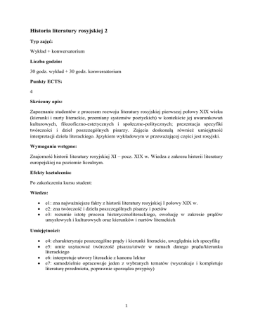 Historia literatury rosyjskiej 2 Typ zajęć: Wykład + konwersatorium Liczba godzin: 30 godz. wykład + 30 godz. konwersatorium Punkty ECTS: 4 Skrócony opis: Zapoznanie studentów z procesem rozwoju literatury rosyjskiej pierwszej połowy XIX wieku (kierunki i nurty literackie, przemiany systemów poetyckich) w kontekście jej uwarunkowań kulturowych, filozoficzno-estetycznych i społeczno-politycznych; prezentacja specyfiki twórczości i dzieł poszczególnych pisarzy. Zajęcia doskonalą również umiejętność interpretacji dzieła literackiego. Językiem wykładowym w przeważającej części jest rosyjski. Wymagania wstępne: Znajomość historii literatury rosyjskiej XI – pocz. XIX w. Wiedza z zakresu historii literatury europejskiej na poziomie licealnym. Efekty kształcenia: Po zakończeniu kursu student: Wiedza: e1: zna najważniejsze fakty z historii literatury rosyjskiej I połowy XIX w. e2: zna twórczość i dzieła poszczególnych pisarzy i poetów e3: rozumie istotę procesu historycznoliterackiego, ewolucję w zakresie prądów umysłowych i kulturowych oraz kierunków i nurtów literackich Umiejętności: e4: charakteryzuje poszczególne prądy i kierunki literackie, uwzględnia ich specyfikę e5: umie usytuować twórczość pisarza/utwór w ramach danego prądu/kierunku literackiego e6: interpretuje utwory literackie z kanonu lektur e7: samodzielnie opracowuje jeden z wybranych tematów (wyszukuje i kompletuje literaturę przedmiotu, poprawnie sporządza przypisy) 1 Kompetencje społeczne: e8: potrafi odpowiednio określić priorytety służące realizacji określonych zadań e9: uczestniczy w zespołowym rozwiązywaniu problemu, przyjmując i oceniając różne punkty widzenia Treści kształcenia: Treści programowe obejmują literaturę rosyjską – od romantyzmu (lata dwudzieste XIX w.) do realizmu (tzw. lata czterdzieste XIX w.). Periodyzacja literatury rosyjskiej lat 1801–1855 z wyszczególnieniem kierunków literackich (preromantyzm, romantyzm, realizm). Specyficzne cechy romantyzmu rosyjskiego (romantyzm dekabrystowski; romantyzm A. Puszkina i poetów jego kręgu; romantyzm filozoficzny). Literatura dekabrystowska (liryka obywatelska K. Rylejewa; historyzm w ujęciu romantycznym na podstawie poematu Wojnarowski). Komedia A. Gribojedowa Mądremu biada (cechy poetyki, wymowa ideowa – między oświeceniem a romantyzmem). Koncepcja poezji i roli poety w liryce A. Puszkina i M. Lermontowa. Poematy romantyczne Puszkina i Lermontowa na tle tradycji tego gatunku (cechy poetyki: typ bohatera, struktura konfliktu, koncepcja miłości). Dramat romantyczny na przykładzie Borysa Godunowa i Małych tragedii A. Puszkina oraz Maskarady M. Lermontowa (problematyka i jej związek z romantycznym widzeniem świata, typ bohatera, swobodna kompozycja, odrzucenie wymogu trzech jedności, fragmentaryczność akcji). Cyklizacja w literaturze rosyjskiej lat trzydziestych XIX w. (zasady kompozycyjne cyklu literackiego – Opowieści Biełkina A. Puszkina, Wieczory na futorze koło Dikańki i Opowieści petersburskie M. Gogola; Bohater naszych czasów M. Lermontowa – pierwsza w literaturze rosyjskiej powieść psychologiczna posiadająca cechy cyklu. Bohater jako reprezentant pokolenia lat 30-tych XIX w. Komedia Rewizor Gogola (obraz Rosji Mikołajowskiej, poetyka komizmu, śmiech jako kategoria estetyczna, kompozycja komedii i budowa akcji). Martwe dusze Gogola – problematyka i poetyka (Rosja jako temat i jako bohater, rola Cziczikowa, specyfika gatunkowa). „Szkoła naturalna” jako zapowiedź realizmu w literaturze rosyjskiej (przedstawiciele, tematyka, gatunki). Rosyjska proza realistyczna (typ bohatera w powieściach I. Turgieniewana i I. Gonczarowa tle pozytywistycznych tendencji epoki i: tzw. „zbędny człowiek” i „nowy człowiek”–nihilista). Dramaturgia A. Ostrowskiego – na przykładzie Burzy. Na wykładzie dodatkowo realizowane są następujące tematy: Poezja W. Küchelbeckera jako przedstawiciela romantyzmu dekabrystowskiego. Nurt filozoficzny w romantyzmie rosyjskim (lubomudrzy – W. Odojewski). Eugeniusz Oniegin i Jeździec Miedziany A. Puszkina. Poezja lat 1840–1860 (Tiutczew, Niekrasow, Fet). 2 Metody i kryteria oceniania: Na ocenę końcową składają się oceny cząstkowe z konwersatorium i wykładu w stosunku 50% do 50%. Warunkiem przystąpienia do egzaminu jest zaliczenie konwersatorium. Na ocenę z konwersatorium składają się: aktywność studenta na zajęciach (systematyczne sprawdzanie zdobywanej wiedzy oraz znajomości lektur). Sprawdzane są: e1, e2, e4, e5, e6, e9 (20% oceny z konwersatorium). pisemna praca semestralna (opracowanie jednego z wybranych tematów) oceniana w skali 2–5 i stanowiąca 30% oceny z konwersatorium. Sprawdzane są: e1, e2, e5, e6, e7, e8. odpowiedź ustna sprawdzająca efekty kształcenia w zakresie wiedzy i umiejętności e1–e8, oceniana w skali 2–5 (50% oceny z konwersatorium). Na ocenę z wykładu składają się: obecność na wykładzie – 20% egzamin ustny – 80%. Podczas egzaminu student losuje zestaw dwóch pytań (jedno przekrojowe, drugie – szczegółowe), ma czas na przygotowanie się i następnie przystępuje do odpowiedzi ustnej. Sprawdzane są wszystkie efekty kształcenia. Metody dydaktyczne: Wykład: metoda podająca Konwersatorium: metoda objaśniająco-poglądowa (reprodukcyjna) metoda problemowa metoda częściowo-poszukująca Literatura: Zasoby biblioteczne IR: Literatura rosyjska pod red. M. 3Jakubca, t. I – II, Warszawa 1976. Literatura rosyjska w zarysie, red. Z. Barański, A. Semczuk, Warszawa 1975. История русской литературы в 4 томах, Ленинград 1980, т. 3–4. Русская литература XIX–XX веков, ред. В. Бугров, M. Голубков, Moсквa 1998, т. 1. Materiały udostępniane przez wykładowcę: O. Główko, Cykl nowelistyczny jako zapowiedź powieści (Na przykładzie „Opowieści Biełkina