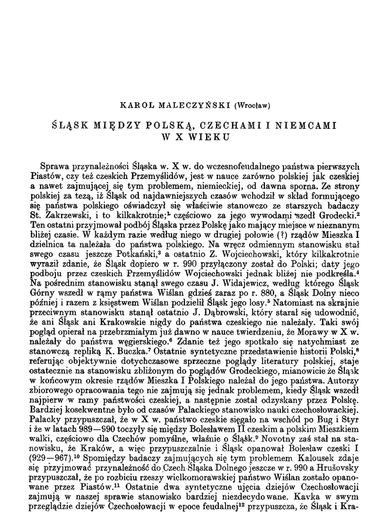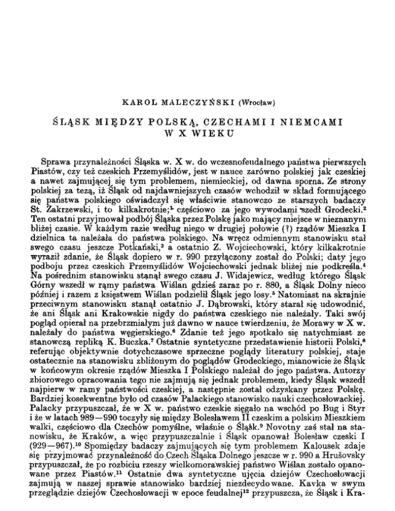 KAROL MALECZYŃSKI (Wrocław) ŚLĄSK MIĘDZY POLSKĄ, CZECHAMI I NIEMCAMI W X WIEKU Sprawa przynależności Śląska w. X w. do wczesnofeudalnego państwa pierwszych Piastów, czy też czeskich Przemyślidów, jest w nauce zarówno polskiej jak czeskiej a nawet zajmującej się tym problemem, niemieckiej, od dawna sporna. Ze strony polskiej za tezą, iż Śląsk od najdawniejszych czasów wchodził w skład formującego się państwa polskiego oświadczył się właściwie stanowczo ze starszych badaczy St. Zakrzewski, i to kilkakrotnie; częściowo za jego wywodami •szedł Gródecki. Ten ostatni przyjmował podbój Śląska przez Polskę jako mający miejsce w nieznanym bliżej czasie. W każdym razie według niego w drugiej połowie (?) rządów Mieszka I dzielnica ta należała do państwa polskiego. Na wręcz odmiennym stanowisku stał swego czasu jeszcze Potkański, a ostatnio Z. Wojciechowski, który kilkakrotnie wyraził zdanie, że Śląsk dopiero w r. 990 przyłączony został do Polski; daty jego podboju przez czeskich Przemyślidów Wojciechowski jednak bliżej nie podkreśla. Na pośrednim stanowisku stanął swego czasu J . Widajewicz, według którego Śląsk Górny wszedł w ramy państwa Wiślan gdzieś zaraz po r. 880, a Śląsk Dolny nieco później i razem z księstwem Wiślan podzielił Śląsk jego losy. Natomiast na skrajnie przeciwnym stanowisku stanął ostatnio J . Dąbrowski, który starał się udowodnić, że ani Śląsk ani Krakowskie nigdy do państwa czeskiego nie należały. Taki swój pogląd opierał na przebrzmiałym już dawno w nauce twierdzeniu, że Morawy w X w. należały do państwa węgierskiego. Zdanie też jego spotkało się natychmiast ze stanowczą repliką K . Buczka. Ostatnie syntetyczne przedstawienie historii Polski, referując objektywnie dotychczasowe sprzeczne poglądy literatury polskiej, staje ostatecznie na stanowisku zbliżonym do poglądów Gródeckiego, mianowicie że Śląsk w końcowym okresie rządów Mieszka I Polskiego należał do jego państwa. Autorzy zbiorowego opracowania tego nie zajmują się jednak problemem, kiedy Śląsk wszedł najpierw w ramy państwości czeskiej, a następnie został odzyskany przez Polskę. Bardziej kosekwentne było od czasów Pałackiego stanowisko nauki czechosłowackiej. Palacky przypuszczał, że w X w. państwo czeskie sięgało na wschód po Bug i Styr i że w latach 989—990 toczyły się między Bolesławem II czeskim a polskim Mieszkiem walki, częściowo dla Czechów pomyślne, właśnie o Śląsk. Novotny zaś stał na sta nowisku, że Kraków, a więc przypuszczalnie i Śląsk opanował Bolesław czeski I (929—967). Spomiędzy badaczy zajmujących się tym problemem Kalousek zdaje się przyjmować przynależność do Czech Śląska Dolnego jeszcze w r. 990 a Hruśovsky przypuszczał, że po rozbiciu rzeszy wiclkomorawskiej państwo Wiślan zostało opano wane przez Piastów. Ostatnie dwa syntetyczne ujęcia dziejów Czechosłowacji zajmują w naszej sprawie stanowisko bardziej niezdecydowane. Kavka w swym przeglądzie dziejów Czechosłowacji w epoce feudalnej przypuszcza, że Śląsk i Kra1 2 3 4 5 8 7 8 9 10 11 12 10 ŚLĄSK W X WIEKU kowskie należały do Czech na długo przed r. 965/66, a ostatnie wydanie Historii Czechosłowacji przez Instytut Historii Czechosłowackiej Akademii Nauk zajmuje się wyłącznie kwestią przynależności do Czech Małopolski, pomijając zagadnienie Śląska zupełnie. Wreszcie spomiędzy badaczy niemieckich zajmujących się tym problemem wymienić wypadnie ostatnio Holzmanna, który dwukrotnie zabierał w tej sprawie głos. Według niego plemiona wymienione na terenie Śląska przez Geografa bawarskiego należały do r. 973 do Czech, a jeszcze w tym roku cały zachodni brzeg Odry po zostawał wciąż pod zwierzchnictwem książąt czeskich. Opolanie (po obu brzegach Odry) wchodzili w skład państwa Bolesława II czeskiego, łącząc w taki sposób Czechy właściwe z Krakowskiem i Małopolską. Wreszcie autorzy ostatniej niemieckiej syn tezy dziejów Śląska stoją na stanowisku, że Śląsk z Wrocławiem jeszcze za czasów Wratysława I (894—921) uznawał zwierzchnictwo czeskich Przemyślidów. Przyczyną tych tak sprzecznych opinii na temat przynależności państwowej Śląska do końca prawie X w. jest ubóstwp źródeł. Posiadamy zaledwie trzy dane źródłowe dla tego zagadnienia, z których dwie pierwsze o wiek przeszło późniejsze i niezbyt wiarogodne (dokument praski z r. 1086 i kronika Kosmasa praskiego) rozmaicie bywały przez badaczy interpretowane. Nawet stosunkowo późna, lecz na ogół nigdy nie kwestionowana wiadomość Mnicha sazawskiego o utracie w r. 990 przez Czechów Niemczy, bywała odnoszona raz do Niemczy Kłodzkiej, raz do Łużyckiej. Podobnie nie dają dostatecznych danych zabytki numizmatyczne i wnioski wyciągane z pojawie nia się w „skarbach" odkopywanych na Śląsku a pochodzących z X w. Do r. 980 przeważają wśród nich monety arabskie,po nich ilościowo najliczniej reprezentowane są niemieckie, polskich brak zupełny, a czeskie spotykamy w znikomej ilości. Nawet tajemniczy denar z napisem „VRATSAO" „BOLESLAV" uważany jest zarówno przez numizmatyków polskich jak czechosłowackich raczej jako monetą czeska (od czeskiego Vratslav) i o czeskiej przynależności Śląska ze stolicą Wrocławiem świad czyć nie może. Jeszcze szczuplejsze są dotychczasowe źródła archeologiczne. Poza bardzo skąpymi importami czeskimi brak na terenie bodaj całego Śląska jakichkolwiek śladów silniejszych wpływów kulturowych czeskich w X w., które mogłyby świadczyć o przynależności państwowej Śląska w tym czasie. Ale i ten argument nie może być rozstrzygający, jako że podobny brak zabytków archeologicznych prowenjencji czeskiej spotykamy i na terenie Małopolski; a o jej przynależności do państwa pierwszych Przemyślidów nie można wątpić. Przy tak sprzecznych wiadomościach z
