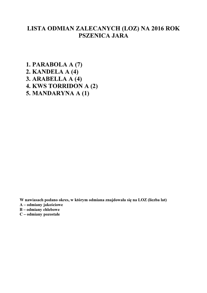LISTA ODMIAN ZALECANYCH (LOZ) NA 2016 ROK PSZENICA JARA 1. PARABOLA A (7) 2. KANDELA A (4) 3. ARABELLA A (4) 4. KWS TORRIDON A (2) 5. MANDARYNA A (1) W nawiasach podano okres, w którym odmiana znajdowała się na LOZ (liczba lat) A – odmiany jakościowe B – odmiany chlebowe C – odmiany pozostałe PSZENICA JARA – LOZ 2016 PARABOLA Odmiana jakościowa (grupa A). Odporność na wszystkie ważniejsze choroby - średnia. Rośliny średniej wysokości, o przeciętnej odporności na wyleganie. Termin kłoszenia wczesny, dojrzewania dość wczesny. Masa 1000 ziarn bardzo duża, gęstość w stanie zsypnym średnia. Odporność na porastanie ziarna w kłosie mała. Liczba opadania duża do bardzo dużej, zawartość białka duża, wskaźnik sedymentacji SDS bardzo duży. Ilość glutenu duża do bardzo dużej. Plenność dobra. Tolerancja na zakwaszenie gleby dość mała. Hodowca: Małopolska HR-HBP KANDELA Odmiana jakościowa (grupa A). Plenność dobra do bardzo dobrej. Przyrost plonu przy uprawie na wysokim poziomie agrotechniki średni. Odporność na rdzę żółtą – duża do bardzo dużej, na mączniaka i rdzę brunatną – duża, na brunatną plamistość liści, septoriozę liści i plew – średnia, na fuzariozę kłosów oraz choroby podstawy źdźbła – dość mała. Rośliny średniej wysokości, o małej odporności na wyleganie. Termin kłoszenia i dojrzewania średni. Masa 1000 ziaren średnia, wyrównanie dość słabe, gęstość w stanie zsypnym bardzo duża. Odporność na porastanie ziarna przeciętna, liczba opadania duża do bardzo dużej. Zawartość białka i ilość glutenu duże. Wskaźnik sedymentacyjny SDS bardzo duży. Wydajność ogólna mąki dość dobra. Tolerancja na zakwaszenie gleby przeciętna. Hodowca: Danko HR Choryń. ARABELLA Odmiana jakościowa (grupa A). Plenność dobra do bardzo dobrej. Przyrost plonu przy uprawie na wysokim poziomie agrotechniki poniżej średniej. Odporność na mączniaka i rdzę żółtą – duża, na rdzę brunatną – dość duża, na septoriozę liści i plew, fuzariozę kłosów oraz brunatną plamistość liści – średnia, na choroby podstawy źdźbła – dość mała. Rośliny średniej wysokości, o przeciętnej odporności na wyleganie. Termin kłoszenia wczesny, dojrzewania dość wczesny. Masa 1000 ziaren dość mała, wyrównanie przeciętne, gęstość w stanie zsypnym bardzo duża. Odporność na porastanie w kłosie dość mała, liczba opadania duża. Zawartość białka duża, ilość glutenu dość duża. Wskaźnik sedymentacyjny SDS bardzo duży. Wydajność ogólna mąki średnia. Tolerancja na zakwaszenie gleby przeciętna. Hodowca: Danko HR Choryń. KWS TORRIDON Odmiana jakościowa (grupa A). Odporność na rdzę brunatną – duża, na mączniaka prawdziwego, brunatną plamistość liści i septoriozę liści – dość duża, na choroby podstawy źdźbła, septoriozę plew oraz fuzariozę kłosów – średnia. Rośliny niskie, o dużej odporności na wyleganie. Termin kłoszenia dość późny, dojrzewania średni. Masa 1000 ziaren średnia, wyrównanie dość słabe, gęstość w stanie zsypnym dość duża. Odporność na porastanie w kłosie średnia, liczba opadania bardzo duża. Zawartość białka duża, ilość glutenu duża do bardzo dużej. Wskaźnik sedymentacyjny SDS duży do bardzo dużego. Wydajność ogólna mąki średnia. Tolerancja na zakwaszenie gleby średnia. Przedstawiciel hodowcy: KWS Lochow Polska MANDARYNA Odmiana jakościowa (grupa A). Przyrost plonu przy uprawie na wysokim poziomie agrotechniki większy niż średnio dla gatunku. Odporność na mączniaka prawdziwego, rdzę brunatną i septoriozę plew – dość duża, na choroby podstawy źdźbła, brunatną plamistość liści, septoriozy liści oraz fuzariozę kłosów – średnia. Rośliny dość wysokie, o dość dużej odporności na wyleganie. Termin kłoszenia dość wczesny, dojrzewania średni. Masa 1000 ziaren bardzo mała, wyrównanie dość słabe, gęstość w stanie zsypnym bardzo duża. Odporność na porastanie w kłosie dość mała, liczba opadania duża do bardzo dużej. Zawartość białka średnia, ilość glutenu duża. Wskaźnik sedymentacyjny SDS bardzo duży. Wydajność ogólna mąki dość duża. Tolerancja na zakwaszenie gleby dość mała. Hodowca: Danko HR Choryń.