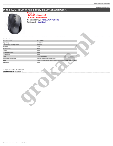 Informacje o produkcie Utworzono 02-03-2017 MYSZ LOGITECH M705 Silver, BEZPRZEWODOWA Cena : 143,09 zł (netto) 176,00 zł (brutto) Nr katalogowy : PERLOGMYS0186 Producent : Logitech Opis Techniczny: 910-001950 Typ myszy Laserowa Komunikacja z komputerem Radiowa Interfejs USB Rozdzielczość 1000 Zasięg 10 m Liczba przycisków 5 szt. Liczba rolek 1 szt. Kolor czarno-niebieski Informacje dodatkowe produkt dla osób praworęcznych www http://www.logitech.com/en-roeu/mice-pointers/mice/devices/7108 Gwarancja 36M gr as ok kod producenta: 910-001950 synchronizacja: 2014-12-12 Wygenerowano w programie www.oscGold.com .p l Kod Producenta
