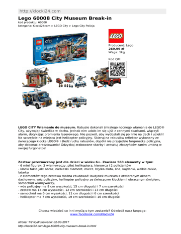 http://klocki24.com Lego 60008 City Museum Break-in kod produktu: 60008 kategoria: Klocki24com > LEGO City > Lego City Policja Producent: Lego 269,99 zł Waga: 1kg Kod QR: LEGO CITY Włamanie do muzeum. Rabusie dokonali śmiałego nocnego włamania do LEGO® City, używając świetlika w dachu. Jednak nim udało im się ujść z cennymi skarbami, włączyli alarm, dotykając promienia laserowego. Nie pozwól, aby wydostali się po linie na dach i uciekli! Na szczęście na miejscu jest helikopter policyjny. Skieruj na rabusiów reflektor wykonany ze świecącego klocka LEGO® i śledź ruchy rabusiów, dopóki nie przyjedzie furgonetka policyjna, aby dokonać aresztowania! Odzyskaj zrabowane skarby i aresztuj złoczyńców zanim umkną w swojej furgonetce! Zestaw przeznaczony jest dla dzieci w wieku 6+. Zawiera 563 elementy w tym: - 6 mini figurek: 2 włamywaczy, pilot helikoptera, kierowca i 2 policjantów - klocki takie jak: obraz, niebieski diament, miecz, bryłka złota, lina, kajdanki, walkie-talkie, latarka - z elementów tego zestawu można zbudować: budynek muzeum z otwieranym oknem dachowym, wóz policyjny, helikopter policyjny ze świecącym klockiem i obracanym śmigłem, samochód włamywaczy, - wóz policyjny ma 8 cm wysokości, 15 cm długości i 7 cm szerokości - zestaw ma 14 cm wysokości, 12 cm szerokości i 13 cm długości - samochód ma 6 cm wysokości, 11 cm długości i 6 cm szerokości - helikopter ma 7 cm wysokości, 19 cm szerokości i 16 cm długości Chcesz wiedzieć co inni myślą o tym zestawie? Odwiedź nasz fanpage: www.facebook.com/Klocki24 strona: 1/2 wydrukowano: 02-03-2017 http://klocki24.com/lego-60008-city-museum-break-in.html Kod EAN/ISBN 5702014959606 strona: 2/2 wydrukowano: 02-03-2017 http://klocki24.com/lego-60008-city-museum-break-in.html