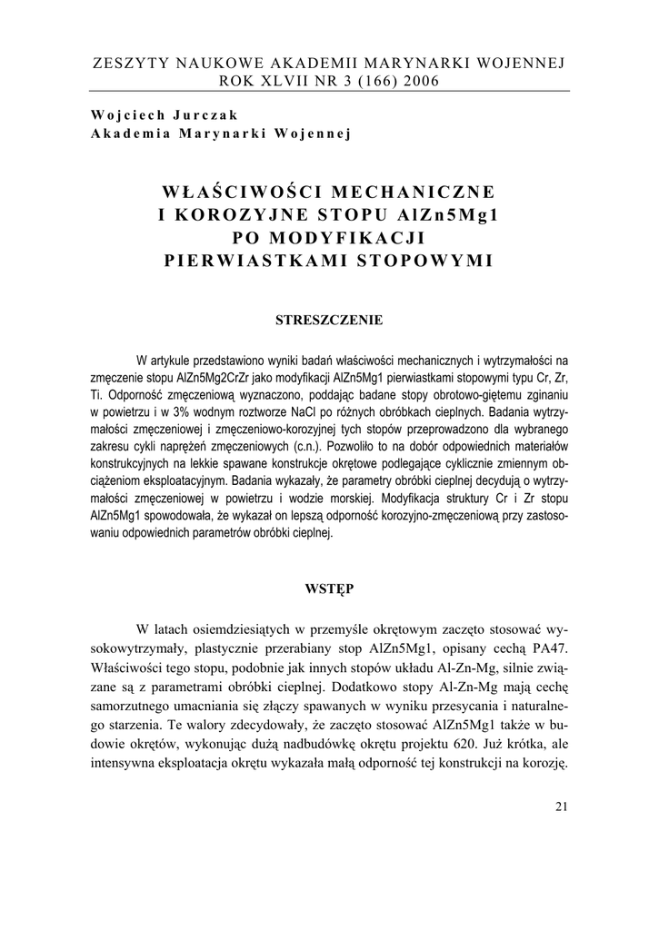 ZESZYTY NAUKOWE AKADEMII MARYNARKI WOJENNEJ ROK XLVII NR 3 (166) 2006 Wojciech Jurczak Akademia Marynarki Wojennej WŁAŚCIWOŚCI MECHANICZNE I KOROZYJNE STOPU AlZn5Mg1 PO MODYFIKACJI PIERWIASTKAMI STOPOWYMI STRESZCZENIE W artykule przedstawiono wyniki badań właściwości mechanicznych i wytrzymałości na zmęczenie stopu AlZn5Mg2CrZr jako modyfikacji AlZn5Mg1 pierwiastkami stopowymi typu Cr, Zr, Ti. Odporność zmęczeniową wyznaczono, poddając badane stopy obrotowo-giętemu zginaniu w powietrzu i w 3% wodnym roztworze NaCl po różnych obróbkach cieplnych. Badania wytrzymałości zmęczeniowej i zmęczeniowo-korozyjnej tych stopów przeprowadzono dla wybranego zakresu cykli naprężeń zmęczeniowych (c.n.). Pozwoliło to na dobór odpowiednich materiałów konstrukcyjnych na lekkie spawane konstrukcje okrętowe podlegające cyklicznie zmiennym obciążeniom eksploatacyjnym. Badania wykazały, że parametry obróbki cieplnej decydują o wytrzymałości zmęczeniowej w powietrzu i wodzie morskiej. Modyfikacja struktury Cr i Zr stopu AlZn5Mg1 spowodowała, że wykazał on lepszą odporność korozyjno-zmęczeniową przy zastosowaniu odpowiednich parametrów obróbki cieplnej. WSTĘP W latach osiemdziesiątych w przemyśle okrętowym zaczęto stosować wysokowytrzymały, plastycznie przerabiany stop AlZn5Mg1, opisany cechą PA47. Właściwości tego stopu, podobnie jak innych stopów układu Al-Zn-Mg, silnie związane są z parametrami obróbki cieplnej. Dodatkowo stopy Al-Zn-Mg mają cechę samorzutnego umacniania się złączy spawanych w wyniku przesycania i naturalnego starzenia. Te walory zdecydowały, że zaczęto stosować AlZn5Mg1 także w budowie okrętów, wykonując dużą nadbudówkę okrętu projektu 620. Już krótka, ale intensywna eksploatacja okrętu wykazała małą odporność tej konstrukcji na korozję. 21 Wojciech Jurczak Naprężenia eksploatacyjne (cykliczne zmienne) w połączeniu z naprężeniami (pozostającymi) związanymi z etapem budowy (spawanie, prostowanie itp.) spotęgowały intensywność korozji. Wygenerowało to konieczność modyfikacji składu chemicznego PA47 pierwiastkami zwiększającymi odporność na korozję, przede wszystkim zmęczeniową. Konstrukcje okrętowe, zwłaszcza jednostek szybkich, np. kadłuby okrętów typu półśliskiego, katamarany i poduszkowce, podlegają połączonemu oddziaływaniu dużych, zmiennych obciążeń eksploatacyjnych i korozyjnego środowiska morskiego (wody i atmosfery morskiej). W przypadku ich niewłaściwego zabezpieczenia zestawami farb (lub ich uszkodzenia) istotną właściwością okrętowego materiału konstrukcyjnego jest jego wytrzymałość zmęczeniowo-korozyjna. Celem przeprowadzonych badań było określenie wpływu losowo zmiennych obciążeń (praca konstrukcji okrętu na fali) i korozyjnego oddziaływania środowiska morskiego na wytrzymałość zmęczeniową i zmęczeniowo-korozyjną stopu AlZn5Mg2CrZr oraz porównanie jego właściwości z właściwościami obecnie stosowanego stopu PA47. Porównanie uzyskanych wyników badań pozwoliło na ustalenie, w jakim stopniu modyfikacja składu chemicznego stopu PA47 polegająca na zwiększeniu zawartości Cr, Zr, Ti i ograniczeniu Mn oraz odpowiednio dobrana obróbka cieplna wpływają na prędkość i przebieg pękania zmęczeniowego i zmęczeniowo-korozyjnego stopów Al-Zn-Mg. Modyfikacja miała ograniczyć wpływ wielkości i nasilenia obecności faz wtórnych w granicach ziaren (GZ) oraz w otaczających je strefach wolnych od wydzieleń (SWW), co było przyczyną intensywnej korozji PA47. SKŁAD CHEMICZNY I PARAMETRY ZASTOSOWANEJ OBRÓBKI CIEPLNEJ MATERIAŁÓW UŻYTYCH DO BADAŃ Składy chemiczne stopów AlZn5Mg2CrZr i AlZn5Mg1 podano odpowiednio w tabelach 1. i 2. Efektywne umocnienie stopów aluminium polega na wprowadzeniu atomów obcych i dyslokacji do sieci metalu podstawowego oraz na tworzeniu odpowiedniej liczby bardzo mocnych i stabilnych wydzieleń faz międzymetalicznych w postaci drobnych i równomiernie rozmieszczonych cząstek. W celu zapewnienia wysokiego udziału objętościowego wydzieleń powinny one powstawać z pominięciem atomów metalu podstawowego i w miarę możliwości poza granicami ziaren i innych defek22 Zeszyty Naukowe AMW Właściwości mechaniczne i korozyjne stopu AlZn5Mg1 po modyfikacji... tów struktury krystalicznej. Defekty te bowiem obniżają barierę energetyczną zarodkowania, a przez to staja się uprzywilejowanymi miejscami wydzielania faz wtórnych [5, 8, 10]. Tabela 1. Skład chemiczny stopu AlZn5Mg2CrZr (spr. IMN-OML nr 4550/91,336 OML/91/) [4] Nr wytopu 507 Skład chemiczny [%] Zn Mg 5.13 1.9 Cr Zr Ti Fe Si Cu Mn Ni Al Nr partii i atestu 0.16 0.15 0.07 0.27 0.15 0.08 0.057 0.006 reszta 1086 Tabela 2. Skład chemiczny stopu AlZn5Mg1 (2945/485/4 ZN 81/MH MN-190-06) [4] Wytop Skład chemiczny [%] Nr partii i atestu AlZn5Mg1 Mg Mn Ti 1,25 0,18 0,034 Zn Cr Si Fe Cu Zr Al − reszta 5,3 0,14 0,16 0,32 0,05 0,04 485/4 W stopie AlZn5Mg2CrZr w stosunku do PA47 zwiększono zawartość Cr, Zr, które tworzą wydzielenia koherentne faz wtórnych, sterujące procesami rekrystalizacji i rozrostu ziaren lub związków typu Al3Mg2, a ich obecność zwykle poprawia ciągliwość i wytrzymałość zmęczeniową badanych stopów. Zwiększona zawartość Ti spowodowała drobnoziarnistość struktury przez zmniejszenie rozmiaru ziaren i udziału dużych cząstek faz wtórnych w osnowie ziaren i ich granicach (SWW), przyczyniając się do wzrostu wytrzymałości zmęczeniowej i odporności na pękanie stopów Al-Zn-Mg. Zmniejszenie zawartości Fe i Si w dużych wydzieleniach powinno zwiększyć ciągliwość badanych stopów [1, 2]. Z przeglądu literatury [1, 2, 3, 4, 11, 12] wynika, że parametry zastosowanej obróbki cieplnej decydują nie tylko o właściwościach mechanicznych badanych materiałów, ale mają istotny wpływ na wytrzymałości zmęczeniową i zmęczeniowo-korozyjną. Dlatego badane stopy poddano