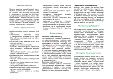 Kierowca autobusu Kierowca autobusu prowadzi pojazdy samochodowe przeznaczone do przewozu więcej niż dziesięciu osób (autobusy), bez przyczep i z przyczepami. Sprawdza stan techniczny i przygotowuje pojazd do jazdy. Kieruje autobusem zgodnie z przepisami prawa ruchu drogowego i posiadanymi uprawnieniami, przewożąc pasażerów i bagaż na wyznaczonych trasach w komunikacji krajowej (miejskiej, podmiejskiej, dalekobieżnej) i zagranicznej. Zadania i czynności robocze Zadania zawodowe kierowcy autobusu obejmują: organizowanie stanowiska pracy z uwzględnieniem przepisów prawa pracy, bhp, ochrony przeciwpożarowej oraz ochrony środowiska; sprawdzanie przed wyjazdem stanu technicznego autobusu; przygotowanie autobusu do jazdy; kierowanie autobusem zgodnie z przepisami ruchu drogowego i posiadanymi uprawnieniami; dbanie o bezpieczeństwo własne, pasażerów i innych użytkowników drogi; udzielanie pierwszej pomocy ofiarom wypadków drogowych; usuwanie usterek autobusu powstałych podczas jazdy; sprzedawanie biletów pasażerom z wykorzystaniem kasy fiskalnej; dokonywanie kontroli biletów pasażerów; prowadzenie autobusu zgodnie z wyznaczoną trasą i według rozkładu jazdy; obsługę pasażerów zgodnie z instrukcją przewoźnika; zabezpieczenie autobusu przed kradzieżą, uruchomieniem i użyciem przez osoby niepowołane; przestrzeganie czasu prowadzenia pojazdu, przerw oraz odpoczynku; prowadzenie dokumentacji przewozu oraz dokumentacji pojazdu; wykonywanie czynności obsługowych autobusu po zakończeniu jazdy; współpracę z przełożonymi i klientami w zakresie realizacji zadań przewozowych; sporządzanie raportów ze sprzedanych biletów; poddawanie się w wyznaczonym terminie okresowym badaniom lekarskim i psychologicznym. Środowisko pracy Materialne środowisko pracy Praca kierowcy ma charakter indywidualny – sam odpowiada za sprawny i bezpieczny przebieg zadań przewozowych, podejmując decyzje wpływające na los jego i pasażerów. Specyficzną kontrolę nad kierowcą pełnią odbiorcy usług transportowych i patrole drogowe, sprawdzające stan techniczny autobusu. W swojej pracy kierowca narażony jest na zanieczyszczenia spalinami, hałas i drgania. Praca wykonywana jest głównie w pozycji siedzącej, co może powodować przewlekłe choroby narządu ruchu. Konieczność wykonywania zadań w dzień i w nocy może doprowadzić do zaburzeń widzenia. Społeczne środowisko pracy Kierowca autobusu, podczas wykonywania zadań zawodowych, kontaktuje się z klientami i pasażerami. W związku z tym powstaje ryzyko konfliktów, zwłaszcza w sytuacji awarii autobusu czy zablokowania drogi przejazdu. Organizacyjne środowisko pracy Miejscem pracy kierowcy jest autobus. Czas prowadzenia pojazdu jest dla wszystkich kierowców taki sam i wynosi maksymalnie 9 godzin jazdy na dobę. Kierowcy transportu miejskiego pracują w dni powszednie i święta w systemie zmianowym. W pracy kierowcy dominują czynności rutynowe, ale występują też nietypowe, będące wynikiem sytuacji na drodze. Na tym stanowisku pracy obowiązuje schludny ubiór lub strój firmowy. Wymagania psychologiczne Kierowca autobusu powinien posiadać wysoką sprawność sensomotoryczną dotyczącą: ostrości wzroku, rozróżniania barw, widzenia stereoskopowego umożliwiającego ocenę odległości, dobrego widzenia o zmierzchu oraz koordynacji wzrokowo - ruchowej. Dodatkowo wymaga się od niego spostrzegawczości, refleksu, koncentracji i podzielności uwagi, a także zdolności do pracy w warunkach monotonnych. Praca w tym zawodzie wymaga przede wszystkim odpowiedzialności za zdrowie i życie innych osób oraz za powierzone mienie. Wymagania fizyczne i zdrowotne Pracę kierowcy autobusu zalicza się do prac średnio ciężkich pod względem obciążenia fizycznego. Od kierowcy wymaga się dużej sprawności narządu wzroku, narządu słuchu i zmysłu równowagi oraz układu kostnostawowego. Przeciwwskazaniem bezwzględnym do wykonywania tego zawodu jest: brak widzenia obuocznego, niedosłyszenie, dysfunkcje kończyn, cukrzyca oraz padaczka. Wymagany poziom kwalifikacji i ścieżka kształcenia w zawodzie Pracę w transporcie drogowym jako kierowca autobusu przewożący pasażerów, można rozpocząć mając 24 lata i ukończony kurs kwalifikacji wstępnej lub po ukończeniu szkolenia okresowego (zależnie od daty uzyskania uprawnień). Po zdanym egzaminie na kwalifikację wstępną i/lub po ukończonym szkoleniu okresowym, kierowca uzyskuje od razu uprawnienia do wykonywania zawodowo transportu osób dla całej grupy kategorii pojazdów, czyli odpowiednio dla kat. D, D1, D+E, D1+E. Przed ukończeniem kursu kwalifikacji zawodowej należy przejść badania lekarskie i psychotechniczne, by uzyskać orzeczenie lekarskie o zdolności do podjęcia pracy zawodowej na stanowisku kierowcy (wydane na podstawie art. 39j ust. 4 Ustawy o transporcie drogowym). Wpis o posiadanych uprawnieniach do wykonywania zawodowo transportu osób uzyskuje się w Wydziale Komunikacji w Urzędzie Miasta lub Starostwie Powiatowym właściwym ze względu na miejsce zamieszkania. Należy tam przedłożyć komplet dokumentów obejmujący: orzeczenie lekarskie, orzeczenie psychologiczne, zaświadczenie o ukończeniu szkolenia okresowego lub zaświadczenie o zdaniu egzaminu i ukończeniu kursu kwalifikacji wstępnej. Pracując jako kierowca autobusu należy się liczyć z tym, że po upływie każdych 5 lat trzeba odbyć szkolenie okresowe (35-godzinne). Ponadto obowiązkiem kierowcy jest także poddanie się okresowo wymaganym badaniom lekarskim. Centrum Informacji i Planowania Kariery Zawodowej to wyspecjalizowana placówka Wojewódzkiego Urzędu Pracy, która gromadzi i udostępnia informacje o zawodach, rynku pracy, możliwościach zdobywania kwalifikacji zawodowych oraz pomaga klientom w podejmowaniu decyzji zawodowych i planowaniu kariery. Kierowca autobusu W ramach bezpłatnych usług, w Centrum można skorzystać z pomocy doradcy