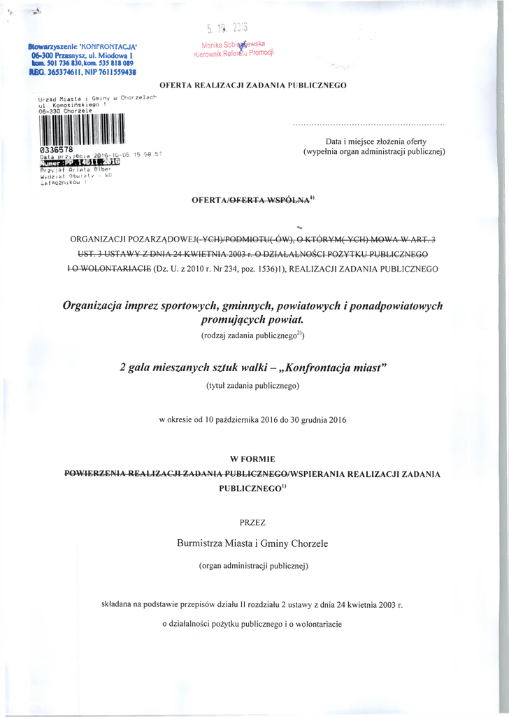 —V 5 15 2016 , . Monika Sobiąjśewska Kierownik Referatu Promocji Stowarzyszenie ‘KONFRONTACJA’ 06*300 Przasnysz, ul. Miodowa I kom. 501 736 830,kom. 53$ 818 089 REG. 365374611, NIP 7611559438 OFERTA REALIZACJI ZADANIA PUBLICZNEGO Urz«d Miasta i Gminy w Chorzelach ul. Komosiński ego 1 0336578 Data przy Data i miejsce złożenia oferty (wypełnia organ administracji publicznej) cia 2016-10-05 15 58.57 Numer:PP.14611.201 Przyjął Pr 1eta 01 ber Wydział Oświat y - WO Za łą czników 1 OFERTA/OFERTA WSPÓLNA" ORGANIZACJI POZARZĄDOWEJ!-YCH)/PODMIOTU(-ÓW), O KTÓRYM(-YCH) MOWA W ART. 3 UST-.-3 USTAWY Z DNIA 24 KWIETNIA 2003 r. O DZIAŁALNOŚCI POŻYTKU PUBLICZNEGO 1 O WOLONTARIACIE (Dz. U. z 2010 r. Nr 234, poz. 1536) 1), REALIZACJI ZADANIA PUBLICZNEGO Organizacja imprez sportowych, gminnych, powiatowych i ponadpowiatowych promujących powiat. (rodzaj zadania publicznego2*) 2 gala mieszanych sztuk walki - „Konfrontacja miast” (tytuł zadania publicznego) w okresie od 10 października 2016 do 30 grudnia 2016 W FORMIE POWIERZENIA REALIZACJI ZADANIA PUBLICZNEGO/WSPIERANIA REALIZACJI ZADANIA PUBLICZNEGO" PRZEZ Burmistrza Miasta i Gminy Chorzele (organ administracji publicznej) składana na podstawie przepisów działu II rozdziału 2 ustawy z dnia 24 kwietnia 2003 r. o działalności pożytku publicznego i o wolontariacie I. Dane oferenta/eferentówl>,3> 1) nazwa: KONFRONTACJA............................................................................................... 2) forma prawna:4> (x) stowarzyszenie () fundacja () kościelna osoba prawna () kościelna jednostka organizacyjna () spółdzielnia socjalna () inna................................................... 3) numer w Krajowym Rejestrze Sądowym, w innym rejestrze lub ewidencji:^’ .............. 0000634572........................................................................................................... 4) data wpisu, rejestracji lub utworzenia:6’ .... 9 WRZESIEŃ 2016....................................... 5) nr N IP:...........7611559438...................nr REGON: 365374611...................................... 6) adres: 06-300 PRZASNYSZ miejscowość: PRZASNYSZ....................... u l.: MIODOWA 1 ....................................... dzielnica lub inna jednostka pomocnicza:7’ ........................................................................... gmina:....PRZASNYSZ..........................................powiat:8) PRZASNYSZ........................ województwo:.................... MAZOWIECKIE...................................................................... kod pocztowy: 06-300............. poczta: ...PRZASNYSZ........................................................ 7) tek :..........0 501 736 830.......................................................faks:................................... e-mail:[email protected]........... http://.................................................................... 8) numer rachunku bankowego:............................................................................................. nazwa banku: BGŻ S.A 20 1600 1462 1837 5082 1000 0001 9) nazwiska i imiona osób upoważnionych do reprezentowania oferenta/oferentów 1): a) ...MARCIN KRZYSZTOF SOBOCIŃSKI....................................................................... b) ...IRENA OLSZEWSKA.................................................................................................. 10) nazwa, adres i telefon kontaktowy jednostki organizacyjnej bezpośrednio wykonującej zadanie, o którym mowa w ofercie:9’ 11) osoba upoważniona do składania wyjaśnień dotyczących oferty (imię i nazwisko oraz nr telefonu kontaktowego) Marcin Sobociński, 0 501 736 830.................................................... 12) przedmiot działalności pożytku publicznego: Celem stowarzyszenia jest prowadzenie wszelkiej działalności w następujących obszarach: 1. edukacji, 2. kultury i ochrony dziedzictwa narodowego, 3. promocji i ochrony zdrowia, 4. kultury fizycznej, sportu, turystki i zdrowego stylu życia 5. ratownictwa i ochrony ludności, 6. pomocy społecznej, w tym pomocy rodzinom i osobom w trudnej sytuacji życiowej oraz wyrównania szans tych rodzin i osób, działalności na rzecz integracji i reintegracji zawodowej i społecznej osób zagrożonych wykluczeniem społecznym oraz działalności na rzecz osób niepełnosprawnych: 7. ekologii i ochrony środowiska. II. Informacja o sposobie reprezentacji oferentów wobec organu administracji publicznej wraz z przytoczeniem podstawy prawnej101 Nie dotyczy III. Szczegółowy zakres rzeczowy zadania publicznego proponowanego do realizacji 1. Krótka charakterystyka zadania publicznego W roku 2016 na terenie miasta i gminy Chorzele odbędzie się Gala Mieszanych Sztuk Walki - „Konfrontacja Miast”. W tegorocznej edycji zawodów planujemy konfrontację zawodników z Powiatu Przasnyskiego z zawodnikami z jednego z powiatów ościennych - najprawdopodobniej będzie to Wyszków. Podczas tego przedsięwzięcia zawodnicy zmierzą się w różnych stylach walk m.in.: karate, kickboxing i różnych kategoriach wagowych z udziałem profesjonalnych sędziów oraz publiczności. Projekt będzie realizowany na terenie powiatu Przasnyskiego, gdzie mieszka ok. 53 tysiące osób. 2. Opis potrzeb wskazujących na konieczność wykonania zadania publicznego, opis ich przyczyn oraz skutków W naszym przekonaniu to przedsięwzięcie jest idealnym, rekreacyjnym spędzeniem czasu wolnego dla mieszkańców miasta i gminy Chorzele ich rodzin. Ta inicjatywa ma na celu dotrzeć do młodzieży jak i osób starszych i wypełnić im czas wolny w życiu codziennym. Mieszkańcy miasta i gminy Chorzele będą mieli okazję nawiązać nowe znajomości oraz będzie to idealny sposób na upowszechnianie kultury fizycznej i sportu. Nie bez znaczenia jest fakt, że dzięki tej inicjatywie miasto i gmina Chorzele zyska w sferze medialnej na terenie Województwa Mazowieckiego jak i
