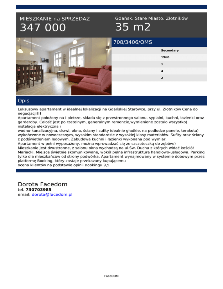 MIESZKANIE na SPRZEDAŻ 347 000 Gdańsk, Stare Miasto, Złotników 35 m2 708/3406/OMS Secondary 1960 1 4 2 Opis Luksusowy apartament w idealnej lokalizacji na Gdańskiej Starówce, przy ul. Złotników Cena do negocjacji!!! Apartament położony na I pietrze, składa się z przestronnego salonu, sypialni, kuchni, łazienki oraz garderoby. Całość jest po rzetelnym, generalnym remoncie,wymienione zostało wszystko( instalacja elektryczna i wodno-kanalizacyjna, drzwi, okna, ściany i sufity idealnie gładkie, na podłodze panele, terakota) wykończone w nowoczesnym, wysokim standardzie z wysokiej klasy materiałów. Sufity oraz ściany z podświetleniem ledowym. Zabudowa kuchni i łazienki wykonana pod wymiar. Apartament w pełni wyposażony, można wprowadzać się ze szczoteczką do zębów:) Mieszkanie jest dwustronne, z salonu okna wychodzą na ul.Św. Ducha z których widać kościół Mariacki. Miejsce świetnie skomunikowane, wokół pełna infrastruktura handlowo-usługowa. Parking tylko dla mieszkańców od strony podwórka. Apartament wynajmowany w systemie dobowym przez platformę Booking, który zostaje przekazany kupującemu ocena klientów na podstawie opinii Bookingu 9,5 Dorota Facedom tel. 730703985 email: [email protected] FaceDOM Powered by TCPDF (www.tcpdf.org)