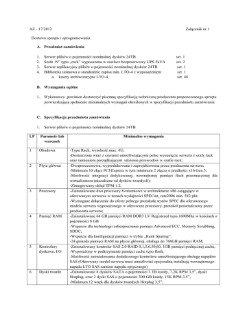 Załącznik nr 1 AZ - 17/2012 Dostawa sprzętu i oprogramowania A. Przedmiot zamówienia 1. 2. 3. 4. Serwer plików o pojemności nominalnej dysków 24TB Szafa 19” typu „rack” wyposażona w zasilacz bezprzerwowy UPS 5kVA Serwer replikacyjny plików o pojemności nominalnej dysków 24TB Biblioteka taśmowa o standardzie zapisu min. LTO-4 z wyposażeniem a. kasety archiwizacyjne LTO-4 szt. 1 szt. 2 szt. 1 szt. 1 szt. 48 B. Wymagania ogólne 1. Wykonawca powinien dostarczyć pisemną specyfikację techniczną producenta proponowanego sprzętu potwierdzającą spełnienie minimalnych wymagań określonych w specyfikacji przedmiotu zamówienia C. Specyfikacja przedmiotu zamówienia 1. Serwer plików o pojemności nominalnej dysków 24TB LP Parametr lub warunek 1 Obudowa 2 Płyta główna 3 Procesory 4 Pamięć RAM 5 Kontrolery dyskowe, I/O 6 Dyski twarde Minimalne wymagania -Typu Rack, wysokość max. 4U; -Dostarczona wraz z szynami umożliwiającymi pełne wysunięcie serwera z szafy rack oraz ramieniem porządkującym ułożenie przewodów w szafie rack; -Dwuprocesorowa, wyprodukowana i zaprojektowana przez producenta serwera; -Minimum 10 złącz PCI Express w tym minimum 2 złącza o prędkości x16 Gen.3; -Możliwość integracji dedykowanej, wewnętrznej pamięci flash przeznaczonej dla wirtualizatora (niezależne od dysków twardych); -Zintegrowany układ TPM 1.2; -Zainstalowane dwa procesory 8-rdzeniowe w architekturze x86 osiągające w oferowanym serwerze w testach wydajności SPECint_rate2006 min. 542 pkt; -Wymagane dołączenie do oferty pełnego protokołu testów SPEC dla oferowanego modelu serwera wyposażonego w oferowane procesory, protokół poświadczony przez producenta serwera; -Zainstalowane 64 GB pamięci RAM DDR3 LV Registered typu 1600Mhz w kościach o pojemności 8 GB -Wsparcie dla technologii zabezpieczania pamięci Advanced ECC, Memory Scrubbing, SDDC; -Wsparcie dla konfiguracji pamięci w trybie „Rank Sparing”; -24 gniazda pamięci RAM na płycie głównej, obsługa do 768GB pamięci RAM; -Zainstalowany kontroler SAS 2.0 RAID 0,1,5,6,50,60, 1GB pamięci podręcznej cache, -Wyposażony w podtrzymanie pamięci cache typu flash; -Możliwość zainstalowania dodatkowego kontrolera umożliwiającego obsługę napędów SAS (Oferowany model serwera musi umożliwiać opcjonalną instalację wewnętrznego napędu LTO SAS zamiast napędu optycznego) -Zainstalowane 8 dysków SATA o pojemności 3 TB każdy, 7,2K RPM 3,5”, dyski Hotplug, oraz 2 dyski SAS o pojemności 300 GB każdy, 15K RPM 3,5”, -Minimum 12 wnęk dla dysków twardych Hotplug 3,5”; 7 Inne napędy zintegrowane -Zintegrowany napęd DVD-RW -Możliwość instalacji wewnętrznego streamera LTO; 8 Kontrolery LAN -4x 1Gb/s LAN, ze wsparciem iSCSI i iSCSI 9 Kontrolery I/O -2 dwuportowe karty FC 8Gb/s 10 Porty 11 Zasilanie, chłodzenie 12 Zarządzanie 13 Wspierane OS -zintegrowana karta graficzna ze złączem VGA; -9x USB 2.0, w tym minimum 2 na panelu przednim i minimum 4 na panelu tylnym; minimum jedno USB 2.0 wewnętrzne umożliwiające instalację pendrive; -1x RS-232; -dodatkowe złącze VGA z przodu obudowy; -Redundantne zasilacze hotplug o sprawności 94% (tzw klasa Platinum) o mocy maksymalnej 800W; -Redundantne wentylatory hotplug; -Wbudowane diody informacyjne lub wyświetlacz informujące o stanie serwera -Zintegrowany z płytą główną serwera kontroler sprzętowy zdalnego zarządzania zgodny z IPMI 2.0 o funkcjonalnościach: Niezależny od systemu operacyjnego, sprzętowy kontroler umożliwiający pełne zarządzanie, zdalny restart serwera; Dedykowana karta LAN 1 Gb/s RJ-45 do komunikacji wyłącznie z kontrolerem zdalnego zarządzania z możliwością przeniesienia tej komunikacji na inną kartę sieciową współdzieloną z systemem operacyjnym; Dodatkowe złącze serwisowe RJ-45 1Gb/s dostępne z przodu obudowy Dostęp poprzez przeglądarkę Web (także SSL, SSH) Zarządzanie mocą i jej zużyciem oraz monitoring zużycia energii Zarządzanie alarmami (zdarzenia poprzez SNMP) Możliwość przejęcia konsoli tekstowej Przekierowanie konsoli graficznej na poziomie sprzętowym oraz możliwość montowania zdalnych napędów i ich obrazów na poziomie sprzętowym (cyfrowy KVM) Karta zarządzająca musi sprzętowo wspierać wirtualizację warstwy sieciowej serwera, bez wykorzystania zewnętrznego hardware – wirtualizacja MAC i WWN na wybranych kartach zainstalowanych w serwerze (co najmniej wsparcie dla technologii kart 10Gbit/s Ethernet i kart FC 8Gbit/s oferowanych przez producenta serwera) Oprogramowanie zarządzające i diagnostyczne wyprodukowane przez producenta serwera umożliwiające konfigurację kontrolera RAID, instalację systemów operacyjnych, zdalne zarządzanie, diagnostykę i przewidywanie awarii w oparciu o informacje dostarczane w ramach zintegrowanego w serwerze systemu umożliwiającego monitoring systemu i środowiska (m.in. temperatura, dyski, zasilacze, płyta główna, procesory, pamięć operacyjna itd.). -Windows 2008 R2 Hyper-V, Windows Server 2012, Vmware, Suse SLES11, RHEL 6 14 Dostarczone systemy operacyjne Windows Storage Server 2012 standard 15 Gwarancja -3 lata gwarancji onsite z gwarantowanym czasem naprawy NBD – potwierdzone oświadczeniem producenta -W przypadku awarii - dyski twarde, pozostają u Zamawiającego -Dostępność części zamiennych przez 5 lat od momentu zakupu serwera;- potwierdzone oświadczeniem producenta. n T i teamingu, RJ-45; 16 Dokumentacja, inne -Elementy, z których zbudowane są serwery muszą być produktami producenta tych serwerów lub być przez niego certyfikowane (wymagane oświadczenie producenta dołączone do oferty) oraz muszą być objęte gwarancją producenta, potwierdzoną przez oryginalne karty gwarancyjne; -Serwer musi być fabrycznie nowy i pochodzić z oficjalnego kanału dystrybucyjnego w Polsce – Wymagane oświadczenie producenta serwera, że oferowany do przetargu sprzęt spełnia ten wymóg; -Oferent