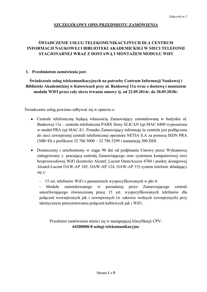 Załącznik nr 2 SZCZEGÓŁOWY OPIS PRZEDMIOTU ZAMÓWIENIA ŚWIADCZENIE USŁUG TELEKOMUNIKACYJNYCH DLA CENTRUM INFORMACJI NAUKOWEJ I BIBLIOTEKI AKADEMICKIEJ W SIECI TELEFONII STACJONARNEJ WRAZ Z DOSTAWĄ I MONTAŻEM MODUŁU WIFI 1. Przedmiotem zamówienia jest: Świadczenie usług telekomunikacyjnych na potrzeby Centrum Informacji Naukowej i Biblioteki Akademickiej w Katowicach przy ul. Bankowej 11a wraz z dostawą i montażem modułu WIFI przez cały okres trwania umowy tj. od 22.09.2014r. do 30.09.2018r. Świadczenie usług powinno odbywać się w oparciu o: Centrale telefoniczną będącą własnością Zamawiający zainstalowaną w budynku ul. Bankowej 11a – centrala telefoniczna PABX firmy SLICAN typ MAC 6400 wyposażona w moduł PRA typ MAC-E1. Ponadto Zamawiający informuję że centrala jest podłączona do sieci zewnętrznej centrali telefonicznej operatora NETIA S.A za pomocą ISDN PRA (30B+D) z prefiksem 32 786 5000 – 32 786 5299 i numeracją 300 DDI. Dostarczony i uruchomiony w ciągu 90 dni od podpisania Umowy przez Wykonawcę zintegrowany z pracującą centralą Zamawiającego oraz systemem komputerowej sieci bezprzewodowej WiFi (kontroler Alcatel_Lucent OmniAccess 4704 i punkty dostępowej Alcatel-Lucent OAW-AP 105, OAW-AP 124, OAW-AP 15) system telefonii składający się z: - 15 szt. telefonów WiFi o parametrach wyspecyfikowanych w pkt 4: - Modułu zainstalowanego w posiadanej przez Zamawiającego centrali umożliwiającego równoczesną pracę 15 szt. wyspecyfikowanych telefonów dla połączeń wewnętrznych jak i zewnętrznych (w zakresie wolnych zewnętrznych) przy identycznym priorytetowaniu połączeń kablowych jak i WiFi. Przedmiot zamówienia mieści się w następującej klasyfikacji CPV: 64200000-8 usługi telekomunikacyjne Strona 1 z 5 2. W ramach wykonywanej usługi telekomunikacyjnej Wykonawca zapewni Zamawiającemu stały dostęp do sieci telefonii stacjonarnej ISDN 30B + D z numeracją 300 DDI oferując następujące usługi : - sekundowy system naliczania, bez opłaty za inicjację połączenia, - połączenia lokalne i strefowe, - połączenia międzystrefowe, - połączenia do sieci komórkowych, - połączenia międzynarodowe, - zapewnienie transmisji faksów, - połączenia pozostałe (połączenia do biura numerów 118913, teleinformatyczne, itp.), - połączenia bezpłatne do służb powołanych ustawowo do niesienia pomocy posiadających numery skrócone, tj. 112, 997, 998, 999, 986, 991, 992, 993, 994, - automatyczne serwisy informacyjne, infolinie 0800, 0801, 0804, linie informacyjne 91XX, 93XX, 95XX, - przekierowanie połączeń, - prezentację numerów telefonicznych CLIP połączeń przychodzących na aparatach systemowych oraz na aparatach analogowych mających funkcję prezentacji numeru, - bezpłatną całodobową możliwość zgłaszania usterek, - bezpłatną pomoc techniczną związaną ze świadczeniem usług telekomunikacyjnych, po zgłoszeniu przez Zamawiającego, - dostęp do telefonicznych konsultacji technicznych, - automatyczny wybór prefiksu operatora, - bezpłatną blokadę połączeń: 0700…, 0400…., 0300…, oraz innych jeśli zajdzie taka konieczność. - w przypadku zmiany operatora bezpłatne przeniesienie sieci numerów telefonów dotychczas wykorzystywanych przez Zamawiającego bez nieuzasadnionej przerwy w pracy. Dotychczasowy operator : Netia S.A.. Przeniesienie numerów winno się odbyć poza godzinami pracy Zamawiającego lub w dni wolne od pracy, - zachowanie dotychczasowej numeracji telefonów Zamawiającego. Zamawiający nie ponosi żadnych kosztów związanych z zachowaniem numerów telefonów dotychczas wykorzystywanych – aktualna numeracja 32 786 5000 – 32 786 5299 Strona 2 z 5 - bezpłatne połączenia w ramach abonamentu pomiędzy numerami wewnętrznymi z CINIBA a Uniwersytetu Śląskiego i z CINIBA a Uniwersytetu Ekonomicznego ( dotyczy numerów DDI z zakresu od 32 359 11 00 do 32 359 2499 oraz od 32 257 7000 do 32 257 7999), 3. Wymagania świadczeń usług jakie powinny być realizowane : - wykonawca zapewni wyłącznie płaski plan taryfowy, tj. bez okresów taryfikacyjnych ze względu na porę dnia oraz dni tygodnia, - wysokość stawek netto za usługi telefoniczne nie ulegnie zwiększeniu w czasie trwania umowy. W przypadku powszechnego obniżenia stawek za usługi telekomunikacyjne w stosunku do innych abonentów, Wykonawca obniży stawki dla zamawiającego w takiej samej proporcji, - Zamawiający wymaga świadczenia usług telekomunikacyjnych drogą kablową z pominięciem technologii alternatywnych np. drogą radiową, komórkową lub realizowanie połączeń przez Internet. 4. Wymagania jakie powinny spełniać telefony WiFi w ilości 15 szt.: telefony muszą umożliwiać rozmowy wewnętrzne, jak i zewnętrzne, posiadać książkę telefoniczną na minimum 500 numerów, posiadać wbudowaną historię rozmów wychodzących, przychodzących oraz nieodebranych na minimum 100 rekordów, posiadać możliwość wyboru różnych dzwonków dla grup i indywidualnych rozmówców, posiadać możliwość przeglądania historii rozmów oraz książki telefonicznej podczas rozmowy, posiadać przeglądarkę HTML, posiadać wbudowany alarm oraz zegar cyfrowy, posiadać kalkulator, posiadać możliwość automatycznej aktualizacji oprogramowania, posiadać możliwość synchronizacji po SNTP, posiadać kolorowy wyświetlacz o rozdzielczości nie mniejszej niż 220x176 pikseli, posiadać funkcje: mute, hold, przekazanie połączeń, wyświetlanie numeru dzwoniącego, blokowanie wybranego numeru dzwoniącego, rozmowa konferencyjna, posiadać klawiaturę numeryczną oraz osobne klawisze służące do ergonomicznego poruszania się po menu, posiadać wymienialną baterię litowo-jonową o pojemności nie mniejszej niż 1250 mAh, posiadać wbudowaną antenę, telefon musi być nie większy niż 145x46x20mm oraz nie mniejszy niż 130x44x15mm, każdy telefon musi być wyposażony w stację dokującą / ładow