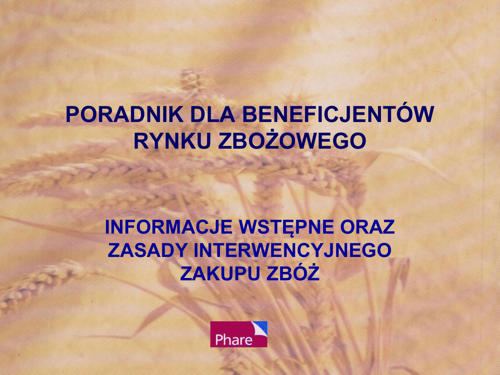 PORADNIK DLA BENEFICJENTÓW RYNKU ZBOŻOWEGO INFORMACJE WSTĘPNE ORAZ ZASADY INTERWENCYJNEGO ZAKUPU ZBÓŻ Z DNIEM 1 MAJA ZMIENIAJĄ SIĘ ZASADY ZARZĄDZANIA RYNKIEM ZBOŻOWYM NA OBOWIĄZUJĄCE W UNII EUROPEJSKIEJ Interwencja odbywa się po jednolitej cenie 101,31 €/t (po przeliczeniu na PLN wg średniego kursu € obowiązującego w dniu złożenia ważnej oferty) w okresie od 1 listopada do 31 maja roku następnego (w magazynie interwencyjnym w dniu pierwszej dostawy), Interwencją objęta jest tylko pszenica, jęczmień i kukurydza – i tylko wtedy, gdy spełniać będą wymogi jakościowe oraz minimalną wielkość partii, Obowiązują unijne regulacje importowo-eksportowe, chroniące rynek przed importem, a wspierające eksport 2 PHARE PL0104.07.01 CEL I MECHANIZMY INTERWENCYJNEGO ZAKUPU I SPRZEDAŻY ZBÓŻ W RAMACH WPR Cel: stabilizacja rynku zbóż Wspólnoty poprzez zakup nadwyżek z rynku oraz sprzedaż na rynek Wspólnoty i na wywóz nadwyżek zbóż zgromadzonych w magazynach interwencyjnych w ramach zakupu interwencyjnego. Realizacja: prowadzenie interwencyjnego zakupu i sprzedaży zbóż na terenie Polski zgodnie z regulacjami prawnymi Wspólnoty. 3 PHARE PL0104.07.01 INTERWENCYJNY ZAKUP ZBÓŻ Sposób I: Oferowane zboże przed jego przejęciem na zapasy interwencyjne Wspólnoty jest dostarczane przez oferenta do magazynu interwencyjnego. Sposób II: Oferowane zboże jest przejmowane w miejscu jego przechowywania, pod warunkiem, że oferent dysponuje magazynem autoryzowanym. Po przejęciu oferowanych zbóż na zapasy interwencyjne, w wyniku zawarcia umowy na świadczenie usług przechowalniczych magazyn autoryzowany oferenta staje się magazynem interwencyjnym. 4 PHARE PL0104.07.01 INTERWENCYJNY ZAKUP ZBÓŻ W POLSCE OBEJMUJE: pszenicę, jęczmień, kukurydzę. zebrane wyłącznie na terenie Wspólnoty, pod warunkiem, że spełniają one minimalne wymogi ilościowe i jakościowe określone w Rozporządzeniu Komisji Europejskiej nr 824/2000. 5 PHARE PL0104.07.01 ZASADY SKŁADANIA OFERT 1. Oferty mogą być składane w terminie od 1 listopada do 31 maja, 2. Oferty złożyć można : • bezpośrednio w Kancelarii Centrali ARR • bezpośrednio w Kancelarii OT ARR • poprzez przesłanie listem poleconym • poprzez przesłanie faksem. 6 PHARE PL0104.07.01 ZABEZPIECZENIE FINANSOWE Oferent, przed złożeniem oferty na sprzedaż zbóż w ramach zakupu interwencyjnego, zobowiązany jest do wniesienia: opłaty na poczet wykonania oceny jakościowej oferowanego zboża. Informację o wysokości opłat uzyskać można bezpośrednio w ARR lub na jej stronach internetowych 7 PHARE PL0104.07.01 FORMA ZGŁOSZENIA OFERTY Ofertę należy złożyć na właściwych formularzach, które można uzyskać w OT ARR, Centrali ARR lub wydrukować ze strony internetowej ARR. Formularze, obok danych osobowych oferenta, zawierają następujące dane: • Rodzaj oferowanego zboża, • Ilość oferowanego zboża, • Nazwę najbliższego centrum interwencyjnego dla oferowanego zboża, • Adres magazynu, w którym znajduje się oferowane zboże oraz opis pomieszczeń magazynowych, w których jest ono zgromadzone • Wysokość opłaty na poczet oceny jakościowej oferowanego ziarna pszenicy- w przypadku ofert w magazynie interwencyjnym, • Wysokość opłaty na poczet oceny jakościowej oferowanego ziarna pszenicy oraz pobrania prób i wykonania oceny fizycznych parametrów jakościowych - w przypadku ofert w miejscu przechowywania, 8 PHARE PL0104.07.01 PRZY SKŁADANIU OFERTY NA PRZEJĘCIE ZBÓŻ W MAGAZYNIE INTERWENCYJNYM NALEŻY OKREŚLIĆ: Środek transportu zboża do magazynu, Ładowność środka transportu Przy składaniu oferty na przejęcie zbóż w miejscu przechowywania należy określić średnie ważone parametry jakościowe oferowanego zboża. 9 PHARE PL0104.07.01 PONADTO: Deklarację, w której oferent oświadcza, że: • Zboże spełnia minimalne wymagania jakościowe oraz zostało wyprodukowane na terenie Wspólnoty, • Nie został przekroczony dopuszczalny limit zawartości pestycydów, • Jest świadomy odpowiedzialności karnej za oświadczenie nieprawdy lub zatajenie prawdy w złożonej deklaracji. • Magazyn, z którego oferuje zboże posiada aktualną autoryzację – w przypadku ofert na przejęcie zbóż w miejscu przechowywania, Oferta musi zostać podpisana przez oferenta lub osobę uprawnioną do reprezentowania oferenta. 10 PHARE PL0104.07.01 DOKUMENTY DODATKOWE Do formularza ofertowego należy dołączyć: Informację o parametrach jakościowych oferowanego zboża, wg wyróżników jakościowych, Oświadczenie rolnika ryczałtowego o treści: „Oświadczam, że jestem rolnikiem ryczałtowym zwolnionym od podatku od towarów i usług na podstawie art.43 ust. 1 pkt 3 ustawy o podatku od towarów i usług” Dowód wpłaty opłaty na poczet wykonania oceny technologicznych parametrów jakościowych oferowanego ziarna pszenicy, Dowód wniesienia opłaty na poczet wykonania oceny parametrów fizycznych i technologicznych oferowanego zboża - w przypadku oferty na przejęcie w miejscu przechowywania: •w magazynie interwencyjnym – parametry technologiczne •w miejscu przechowywania – technologiczne i fizyczne 11 PHARE PL0104.07.01 Dokumenty określające status prawny przedsiębiorcy: Aktualny odpis z Krajowego Rejestru Sądowego - w przypadku osób prawnych oraz spółek prawa handlowego Zaświadczenie o wpisie do ewidencji działalności gospodarczej Zaświadczenia właściwych urzędów: Urzędu Skarbowego oraz Zakładu Ubezpieczeń Społecznych o nie zaleganiu z zobowiązaniami finansowymi lub, że zobowiązania rozłożone na raty lub o odroczonym terminie płatności są realizowane, bądź, że wnioskodawca nie podlega obowiązkowi płacenia składek na ubezpieczenie społeczne. Kserokopię świadectwa autoryzacji magazynu - w przypadku oferty na zakup zbóż w miejscu przechowywania. Dokumenty powyższe muszą być złożone w oryginale lub kopii potwierdzon