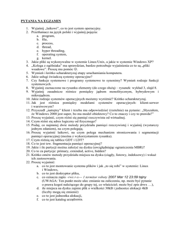 PYTANIA NA EGZAMIN 1. Wyjaśnij „laikowi”, co to jest system operacyjny. 2. Przetłumacz na język polski i wyjaśnij pojęcia: a. program, b. file, c. process, d. thread, e. hyper threading, f. operating system, g. kernel. 3. Jakie pliki są wykonywalne w systemie Linux/Unix, a jakie w systemie Windows XP? 4. „Kolega z ogólniaka” ma sprawdzian, bardzo potrzebuje wyjaśnienia co to są „pliki wsadowe”. Proszę mu pomóc ☺. 5. Wymień i krótko scharakteryzuj etapy uruchamiania komputera. 6. Jakie usługi świadczą systemy operacyjne? 7. Czy funkcje systemowe i programy systemowe to synonimy? Wymień rodzaje funkcji systemowych. 8. Wyjaśnij zaznaczone na rysunku elementy (do czego słuŜą) – rysunek: wykład 3, slajd 8. 9. Wyjaśnij zasadnicze róŜnice pomiędzy jądrem monolitycznym, hybrydowym i mikrojądrem. 10. Jakie rodzaje systemów operacyjnych moŜemy wyróŜnić? Krótko scharakteryzuj. 11. Jak jest róŜnica pomiędzy modelami systemów operacyjnych: klient-serwer i warstwowym? 12. Przyszedł „natrętny” klient i trzeba mu odpowiedzieć (rzetelnie) na pytanie: „Słyszałem, Ŝe Windows 2000 jest super, bo ma model obiektowy? Co to znaczy i czy to prawda?” 13. Proszę wyjaśnić, czym róŜni się pamięć rzeczywista od wirtualnej. 14. Czym róŜni się adres logiczny od fizycznego? 15. Podaj, co najmniej dwie metody przydziału pamięci rzeczywistej i wyjaśnij (wystarczy jednym zdaniem), na czym polegają. 16. Proszę wyjaśnić laikowi, na czym polega mechanizm stronicowania i segmentacji pamięci operacyjnej (moŜna z wykorzystaniem rysunku). 17. Czym róŜnią się tablice GDT i LDT? 18. Co to jest tzw. fragmentacja pamięci operacyjnej? 19. Jakie i ile partycji moŜna załoŜyć na dysku (uwzględniając ograniczenia MBR)? 20. Co to za partycje: primary, extended, active, hidden? 21. Krótko omów metody przydziału miejsca na dysku (ciągły, listowy, indeksowy) i wskaŜ ich zastosowania. 22. Proszę wyjaśnić: a. co to jest montowanie systemu plików i jak „to się robi” w systemie: Linux i Windows, b. co to jest deskryptor pliku, c. co oznacza zapis –rwx r-x--- 1 termitor roboty 2007 Mar 12 23:59 tajny (UWAGA: Ten punkt moŜe ulec zmianie na zaliczeniu, np. moŜe być pytanie o prawa kogoś naleŜącego do grupy tej, co właściciel; moŜe być zpis drwx …), d. ile miejsca na dysku zajmie plik o wielkości 30kB i jednostce alokacji 4kB (liczby mogą się zmienić) e. co to jest jednostka alokacji, f. co to jest katalog urządzenia. 23. Proszę dokonać podziału dysku o rozmiarze …. na partycje dla systemów: Aurox 11, Windows XP, Windows 2003 Server, Novell Netware 5.0. 24. Proszę wyjaśnić zaznaczone na rysunku stany procesu oraz uzupełnić brakujące napisy (rysunek: wykład 6, slajd 4). 25. WskaŜ pozytywne i negatywne sposoby współpracy procesów. 26. Co to jest deadlock i jak z niego moŜna „wyjść”? 27. Czym róŜni się i co ma wspólnego wątek i proces? 28. Przetłumacz na język polski i wyjaśnij pojęcia: a. schedule, b. dispatcher, c. hyper-threading, d. dual core, e. FIFO, f. Round Robin. 29. – 35. Podam w najbliŜszej przyszłości.