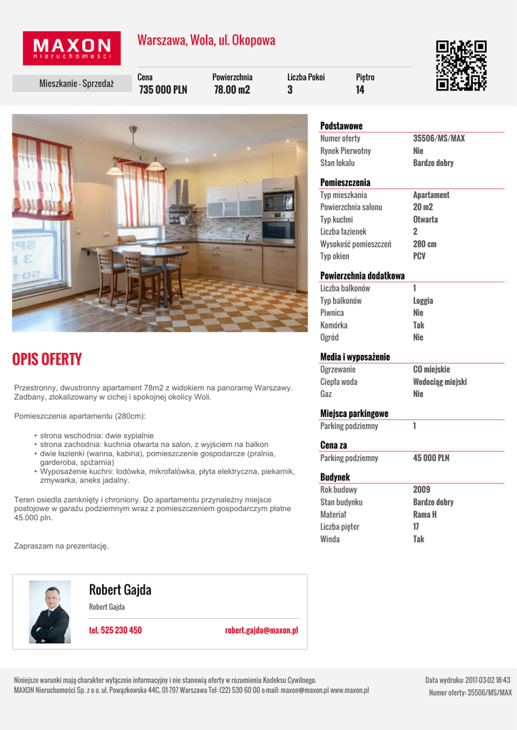 Warszawa, Wola, ul. Okopowa Mieszkanie - Sprzedaż Cena 735 000 PLN Powierzchnia 78.00 m2 Liczba Pokoi 3 Piętro 14 Podstawowe Numer oferty 35506/MS/MAX Rynek Pierwotny Nie Stan lokalu Bardzo dobry Pomieszczenia Typ mieszkania Apartament Powierzchnia salonu 20 m2 Typ kuchni Otwarta Liczba łazienek 2 Wysokość pomieszczeń 280 cm Typ okien PCV Powierzchnia dodatkowa Liczba balkonów 1 Typ balkonów Loggia Piwnica Nie Komórka Tak Ogród Nie OPIS OFERTY Media i wyposażenie Przestronny, dwustronny apartament 78m2 z widokiem na panoramę Warszawy. Zadbany, zlokalizowany w cichej i spokojnej okolicy Woli. Ogrzewanie CO miejskie Ciepła woda Wodociąg miejski Gaz Nie Miejsca parkingowe Pomieszczenia apartamentu (280cm): • strona wschodnia: dwie sypialnie • strona zachodnia: kuchnia otwarta na salon, z wyjściem na balkon • dwie łazienki (wanna, kabina), pomieszczenie gospodarcze (pralnia, garderoba, spiżarnia) • Wyposażenie kuchni: lodówka, mikrofalówka, płyta elektryczna, piekarnik, zmywarka, aneks jadalny. Teren osiedla zamknięty i chroniony. Do apartamentu przynależny miejsce postojowe w garażu podziemnym wraz z pomieszczeniem gospodarczym płatne 45.000 pln. Zapraszam na prezentację. Parking podziemny 1 Cena za Parking podziemny 45 000 PLN Budynek Rok budowy 2009 Stan budynku Bardzo dobry Materiał Rama H Liczba pięter 17 Winda Tak Robert Gajda Robert Gajda tel. 525 230 450 [email protected] Niniejsze warunki mają charakter wyłącznie informacyjny i nie stanowią oferty w rozumieniu Kodeksu Cywilnego. MAXON Nieruchomości Sp. z o o. ul. Powązkowska 44C, 01-797 Warszawa Tel: (22) 530 60 00 e-mail: [email protected] www.maxon.pl Data wydruku: 2017-03-02 18:43 Numer oferty: 35506/MS/MAX