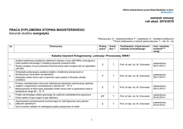 Oferta zatwierdzona przez Radę Wydziału w dniu: 30.09.2015 r. semestr zimowy rok akad. 2015/2016 PRACA DYPLOMOWA STOPNIA MAGISTERSKIEGO kierunek studiów energetyka *Rodzaj pracy: E – eksperymentalna, P – projektowa, S – studialno-analityczna **Praca realizowana w ramach grantu/zlecenia: T – tak, N – nie Lp. Temat pracy Rodzaj pracy* Grant/ zlec.** Tytuł/stopień, inicjał imienia i nazwisko prowadzącego Imię i nazwisko studenta**** uwagi Katedra Inżynierii Kriogenicznej, Lotniczej i Procesowej, W9/K1 1. Analiza systemowa współpracy elektrowni cieplnej o mocy 200 MWe i pracującej w trybie spalania tlenowego z instalacją separacji powietrza ASU System analysis of oxy-combustion thermal power plant coupled with air separation unit ASU S T Prof. dr hab. inż. M. Chorowski zatwierdzony 28.01.2015 r. 2. Chłodziarka adsorpcyjna zasilana ciepłem z kolektorów słonecznych w klimatycznych warunkach wrocławskich Adsorption chiller driven with a heat from solar panels in Wrocław climate conditions P T Prof. dr hab. inż. M. Chorowski zatwierdzony 28.01.2015 r. 3. Pomiary charakterystyk roboczych trójzłożowej chłodziarki adsorpcyjnej zasilanej ciepłem z kogeneracji o temperaturze z zakresu 50 – 70 °C Measurements of three beds adsorption chiller driven with co-generation heat of temperature range 50 – 70 °C E T Prof. dr hab. inż. M. Chorowski zatwierdzony 28.01.2015 r. 4. Projekt zamkniętego układu gazowego do zasilania radiodetektorów gazowych Close system of gas supply to gas detectors E/P T Prof. dr hab. inż. M. Chorowski zatwierdzony 25.02.2015 r. 5. Zastosowanie promieniowania kosmicznego do radiologicznej oceny jakości połączeń spawanych Use of cosmic radiation in radiological quality assessment of welds E T Prof. dr hab. inż. M. Chorowski zatwierdzony 25.02.2015 r. 1 6. 7. 8. 9. Wariantowa analiza termodynamiczna i ekonomiczna budowy systemu trigeneracyjnego z uwzględnieniem polityki certyfikatów energetycznych Thermodynamic and economic analysis of trigeneration system including energy certificate policy Badanie charakterystyk i optymalizacja pracy generatora tlenu PSA Working parameters measurement and optimization of adsorption oxygen generator Optymalizacja energochłonności separacji tlenu w metodzie kriogenicznej – modelowanie kolumny w środowisku Aspen Cryogenic oxygen separation - Aspen modeling and optimization Badanie charakterystyki pracy instalacji skraplania tlenu opartej na chłodziarce Gifforda-McMahona Working parameters measurement of Gifford-McMahon oxygen liquefier S N Dr inż. W. Gizicki zatwierdzony 28.01.2015 r. E T Dr inż. W. Gizicki zatwierdzony 28.01.2015 r. S T Dr inż. W. Gizicki zatwierdzony 28.01.2015 r. E T Dr inż. W. Gizicki zatwierdzony 28.01.2015 r. E N Dr inż. A. Jędrusyna zatwierdzony 28.01.2015 r. P N Dr inż. A. Chrzczonowski zatwierdzony 25.02.2015 r. 11. Mikroprocesorowy miernik wilgotności drewna Microcontroller-based timber humidity meter Projekt małej przydomowej turbiny wiatrowej o pionowej osi obrotu Design of small vertical-axis wind turbine 12. Projekt i analiza energetyczna elektrowni wiatrowej małej mocy Design and analysis small wind power plant P N Dr inż. A. Chrzczonowski zatwierdzony 25.02.2015 r. 13. Projekt i analiza energetyczna dużej farmy wiatrowej Design and analysis large wind farm P N Dr inż. A. Chrzczonowski zatwierdzony 25.02.2015 r. 14. Analiza numeryczna wpływu dyfuzora na własności turbiny wiatrowej Numerical analysis of diffuser influence into wind turbine properties P N Dr inż. A. Chrzczonowski zatwierdzony 25.02.2015 r. 15. Analiza współpracy turbiny wiatrowej z układem pompowym Analysis of cooperation between wind turbine and pump system P N Dr inż. A. Chrzczonowski zatwierdzony 30.09.2014 r. 10. Katedra Termodynamiki, Teorii Maszyn i Urządzeń Cieplnych, W9/K2 16. 17. 18. Analiza strat w układach wodno-parowych bloku energetycznego na przykładzie elektrowni zawodowej Analysis of losses in the water-steam system of power unit on the example of power plant Analiza pracy układów odsalania i odmulania kotłów energetycznych na przykładzie elektrowni zawodowej Analysis of operation of power boilers desalination and desludging systems on the example of thermal power plant Projekt system ogrzewania opartego na wysokosprawnej pompie ciepła przeznaczony do domu energooszczędnego Design of the hiting system based on a high-efficiency heat pump for energy efficient house 2 S N Dr hab. inż. A. Andruszkiewicz zatwierdzony 04.06.2014 r. S N Dr hab. inż. A. Andruszkiewicz zatwierdzony 04.06.2014 r. P N Prof. dr hab. inż. Z. Królicki zatwierdzony 29.10.2014 r. 19. System podgrzewania infrastruktury drogowej przy użyciu rurek ciepła Road infrastructure heating using a heat pipes S N Dr hab. inż. S. Pietrowicz zatwierdzony 25.02.2015 r. 20. Badania efektywności osadzania pyłu za pomocą impaktora kaskadowego Research of effectiveness of dust deposition using a cascade impactor E N Dr inż. A. Świerczok zatwierdzony 18.12.2013 21. Badania zawartości pyłów drobnych i submikronowych w gazach odlotowych Research into the content of fine and submicron dust in the waste gases S N Dr inż. A. Świerczok zatwierdzony 28.01.2015 r. 22. Badania materiałów filtracyjnych stosowanych w pyłomierzach grawimetrycznych Research of filtering materials used in gravimetric dust meters E N Dr inż. A. Świerczok zatwierdzony 25.02.2015 r. 23. Efekty wprowadzenia certyfikacji energetycznej budynków The effects of the introduction of energy certification of buildings S N Dr inż. E. Wróblewska zatwierdzony 28.01.2015 r. P N Dr inż. E. Wróblewska zatwierdzony 28.01.2015 r. P N Dr inż. M. Żak zatwierdzony 28.01.2015 r. 24. 25. Termomodernizacja wybranego budynku Thermomodernization of the selected building Projekt systemu ogrzewania wody w akwarium z wykorzystaniem OZE. Design of the water heating system for the aquarium using renewable energy sources. Katedra Techno